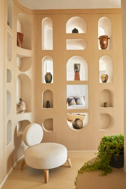 Shimona’s commitment to organic forms is evident throughout the home, most notably in the treatment of the ceilings. Rather than attempting to hide necessary ductwork and fire safety systems, she embraced these elements, incorporating them into undulating contours that add depth and interest to the overhead plane. This approach solves a practical problem and reinforces the project’s overarching design language.