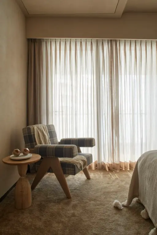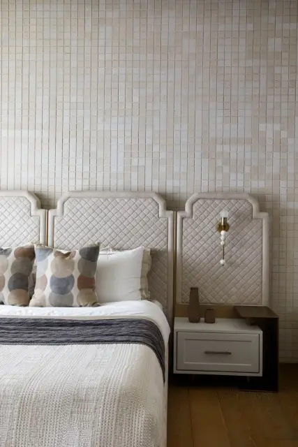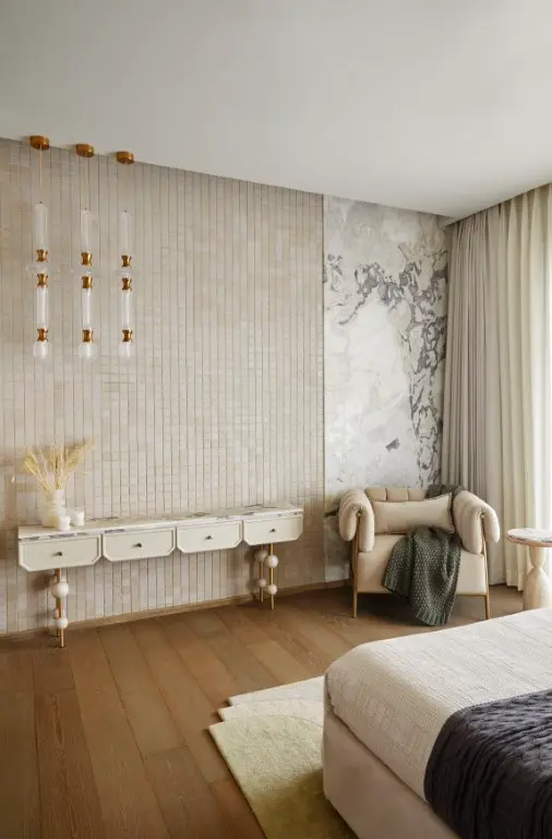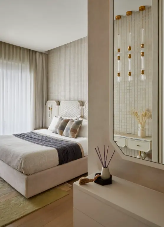 The private spaces of the home continue the theme of organic luxury. The master bedroom, created by combining two smaller rooms, is a study in airy minimalism with artistic touches. Here, the challenge of two large ducts bisecting the space was met by transforming them into a striking room divider, housing niches for the clients’ pottery and book collections.