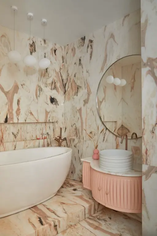 experience that is both grounding and elevating. Each bathroom has been designed with a distinct personality, from the ombré-textured powder room to the wabi-sabi-inspired master en- suite.