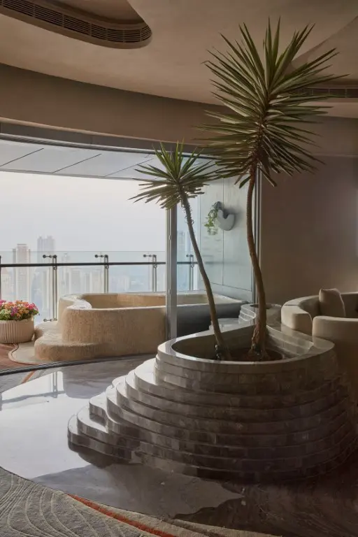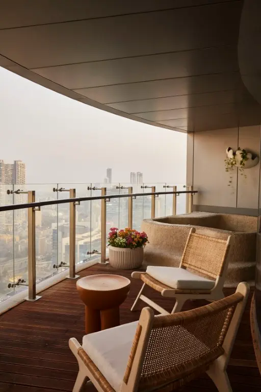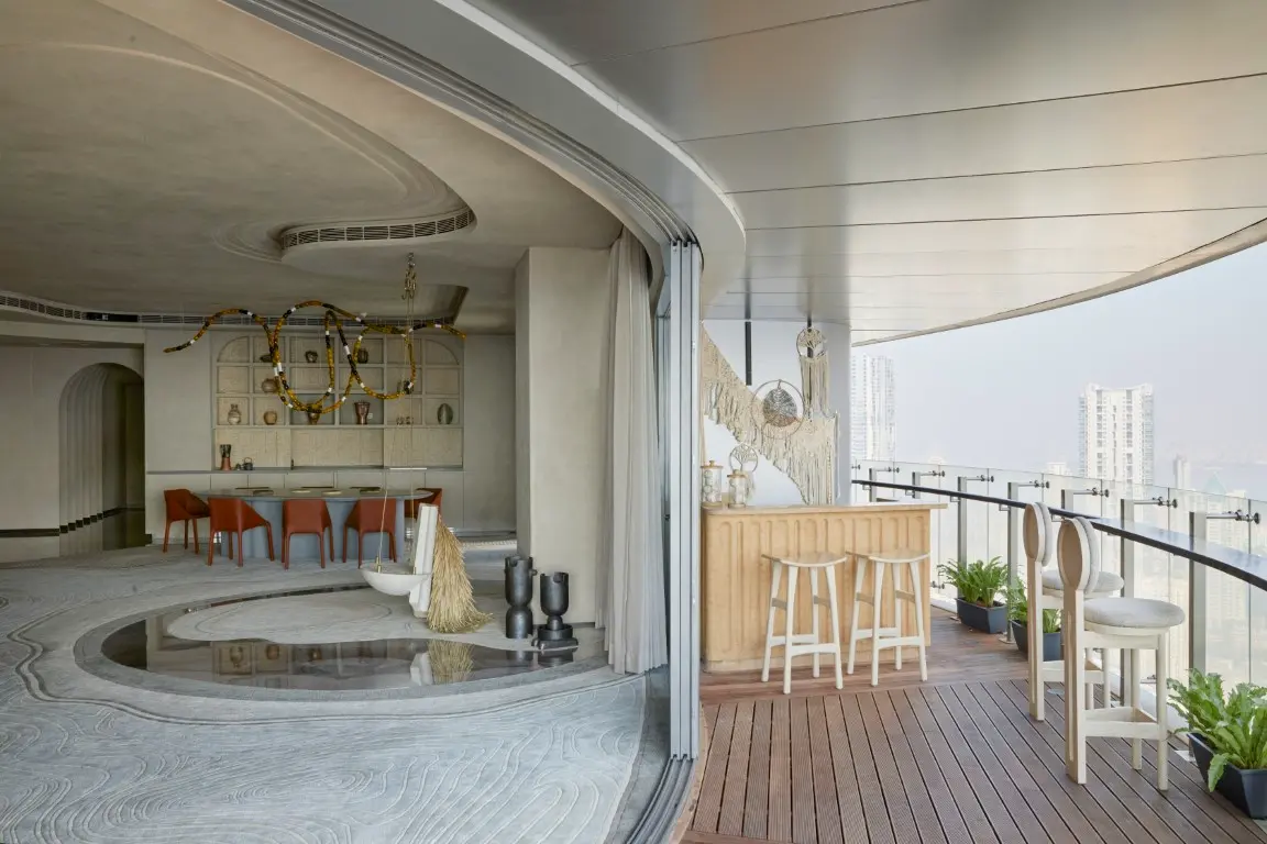 One cannot discuss the House of Contours without mentioning its generous outdoor spaces. With nine balconies spread across the apartment, each room enjoys a private slice of the Mumbai skyline and the Arabian Sea beyond. These outdoor areas have been thoughtfully curated, with features ranging from a contoured mini lounge pool to a fully functional bar and barbecue area.