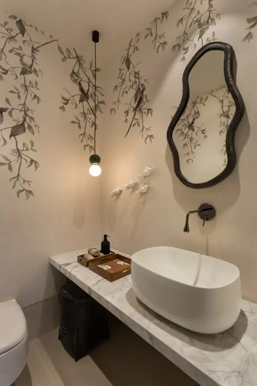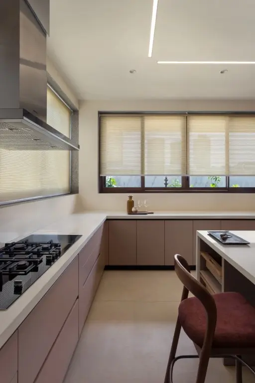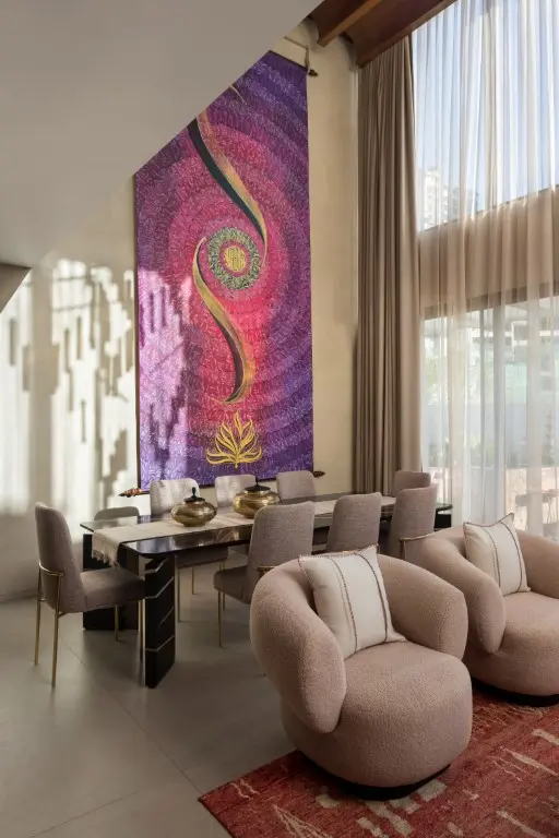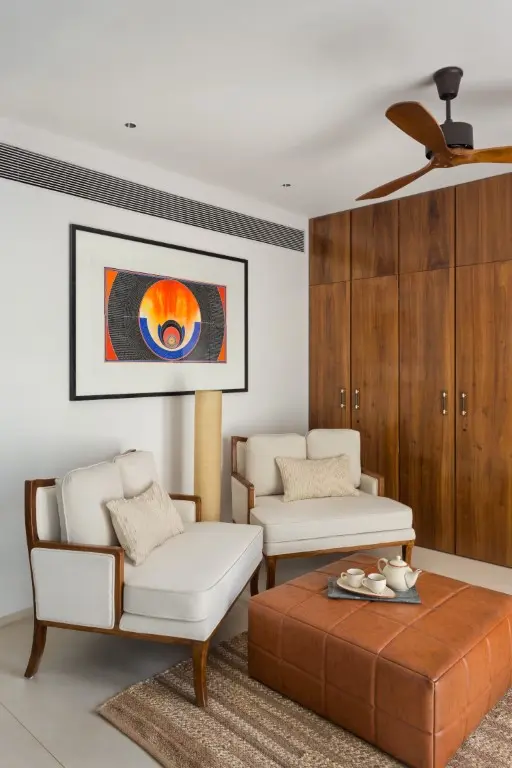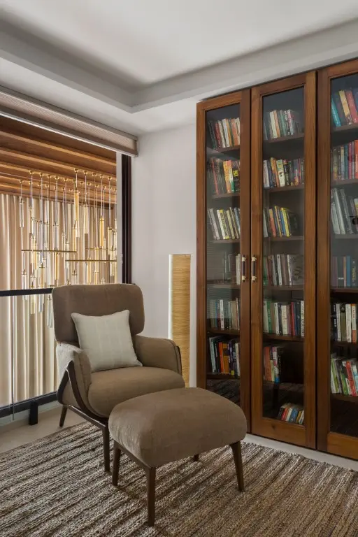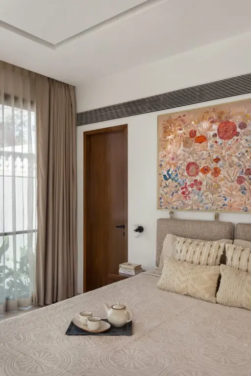 The team wanted lightcoloured materials to compliment and not divert the attention from the surrounding greenscape. The material finishes, hence, were chosen accordingly, with the floor, walls and ceilings dressed in light, warm pastel colours. The furniture, doors, and windows are finished in Burma teak wood, while art and accessories bring in bright pops of colour that complement the neutral shell finishes.