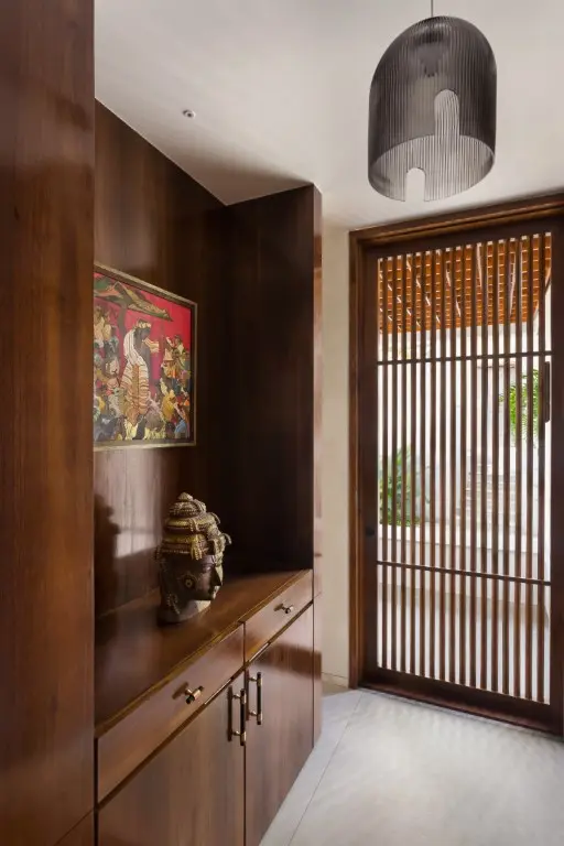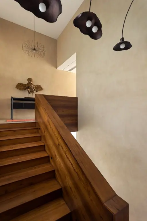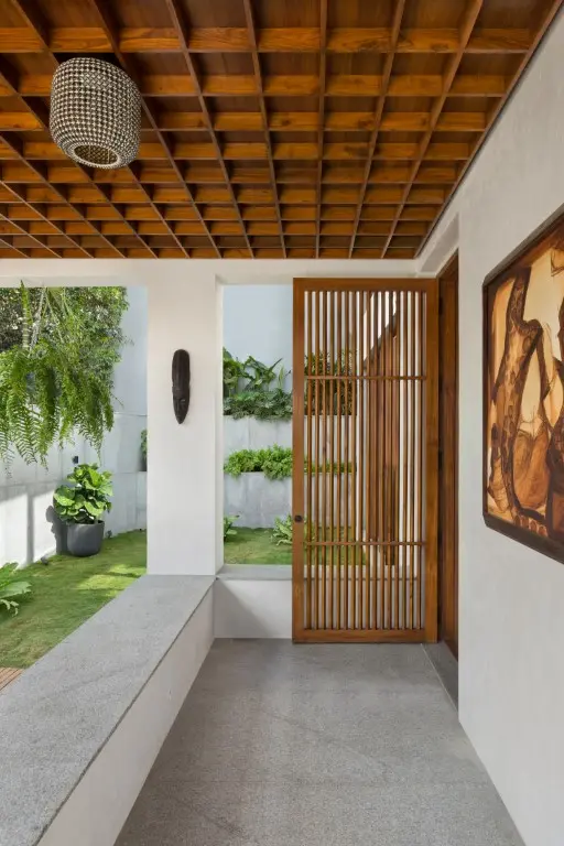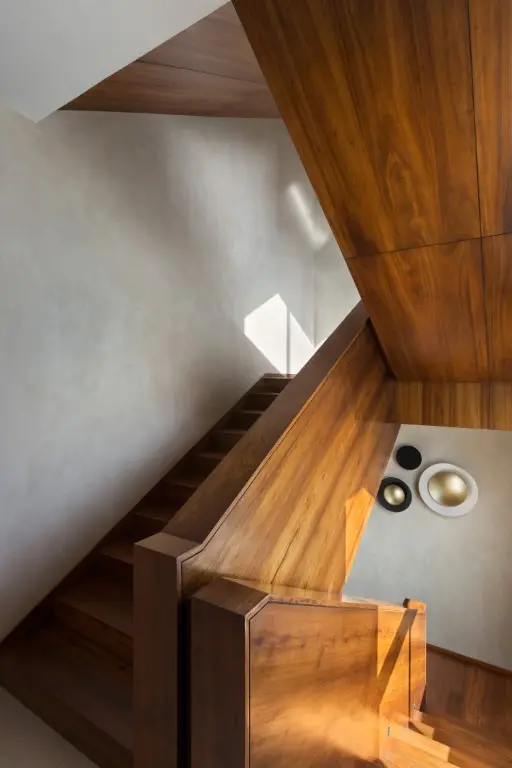 As one enters the property through a metal louvered gate, the verdant landscape within the compound walls gives a feeling of a self-contained oasis, disconnected from the hustle and bustle of the city around. The entrance porch with its coffered wooden ceiling, becomes a strong focal feature, creating the right tone for the home. The ground floor houses a double-height living area, kitchen, and guest bedroom. The barrel-vaulted wooden double-height living room ceiling adds glamour to the space. The hero of the design, however, is the dog-legged staircase that connects all the floors. Clad in recycled Burma teak, it is the highlight feature of the villa.