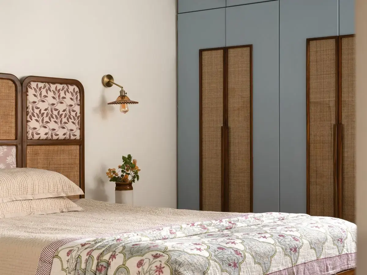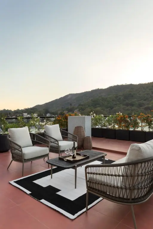 To achieve the right vibe, the team worked with a warm colour palette throughout the villa. A light beige cement tile has been used for the floor and bathrooms to highlight the teak wood finishes across the house. A glass railing runs along the periphery of all terraces, adding visually to the expansive space and keeping the attention on the red Agra stone has been used for the floor here. The light warm pastel shades pair well with the deep brown of the teak wood and together, tie up with the lush green landscape around.