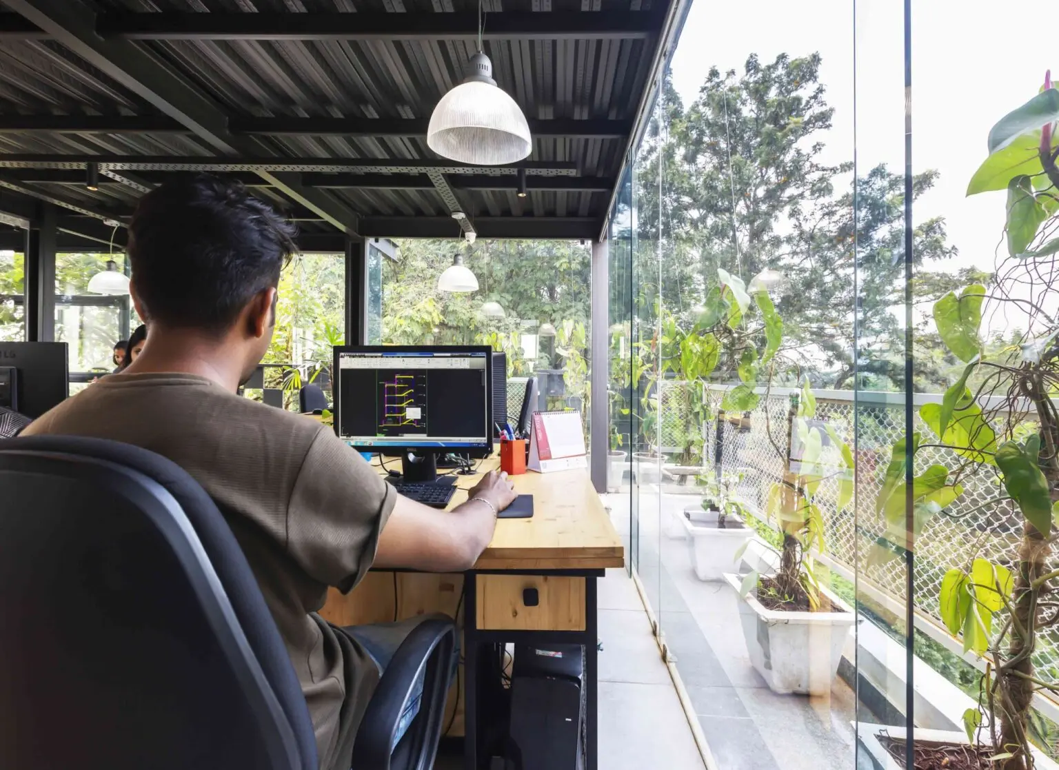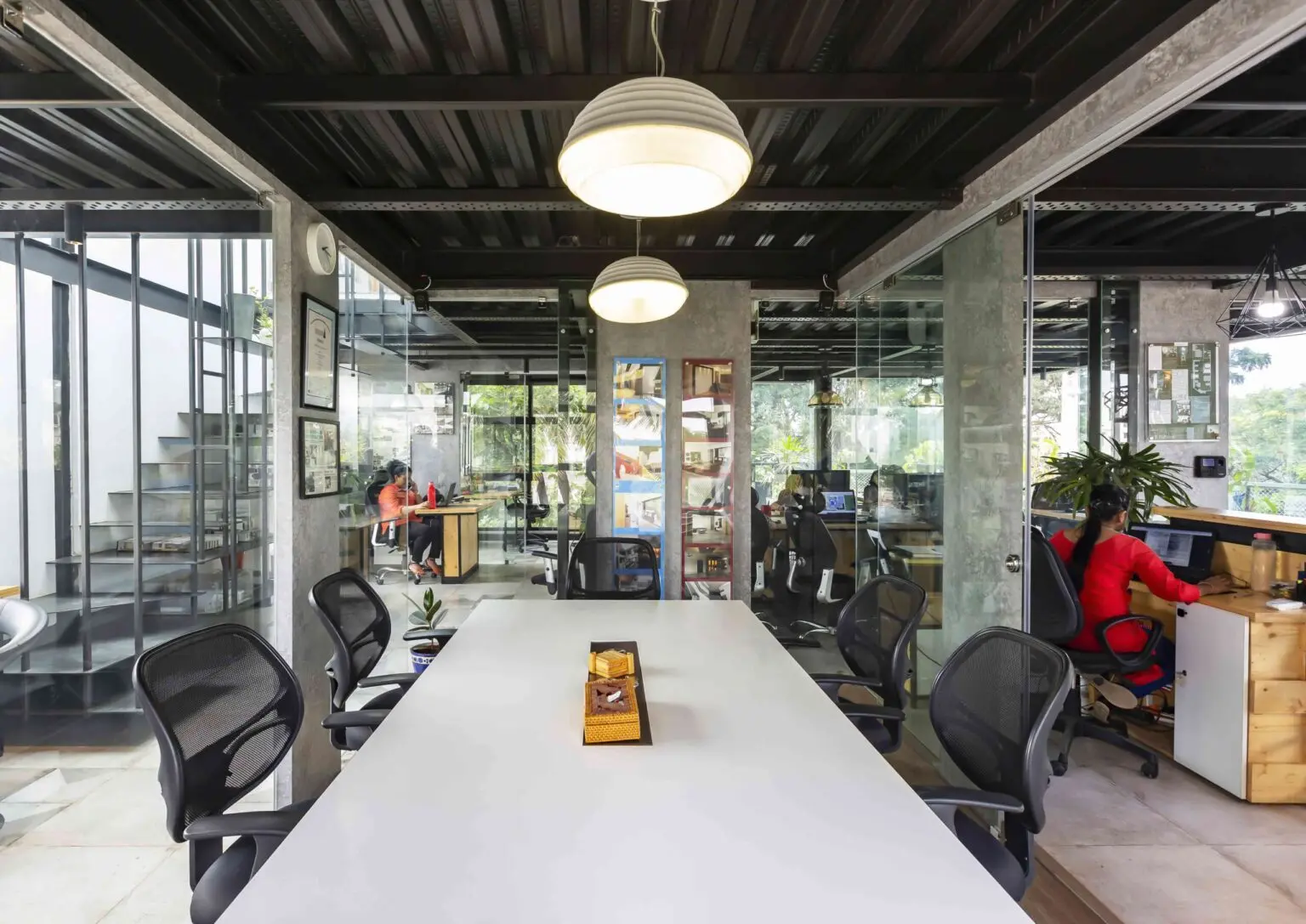 The park facing, agile and collaborative workspace has large openings that allow natural light to pour in, green elements around the office, the bright white walls and exposed ceiling creates an informal and stress-free work environment that encourages easy communication, organic interaction, and engagement among employees.