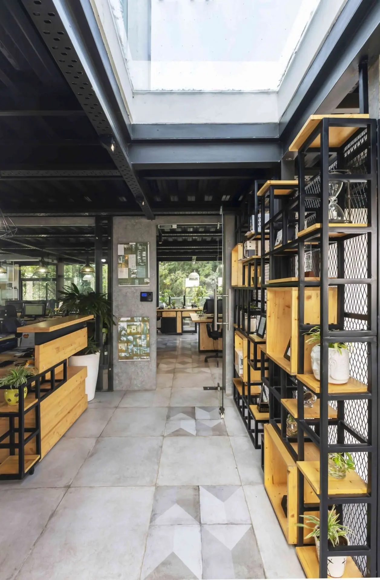 The space is clearly defined into three zones based on functionality: – The first zone has the reception and conference area; the second zone is the studio workspace and the third is the cafeteria.