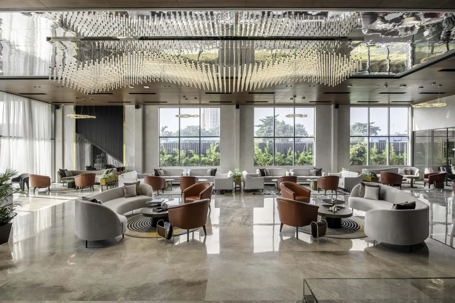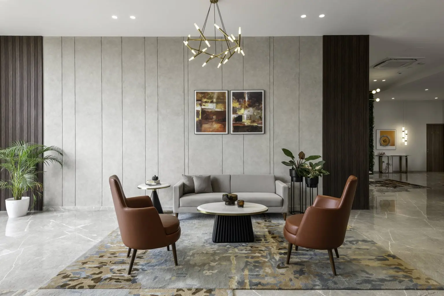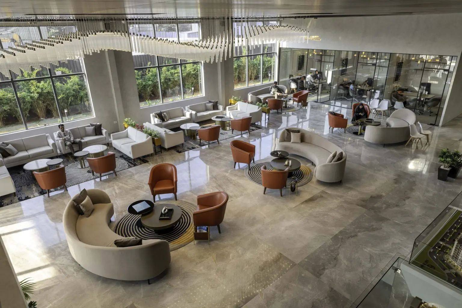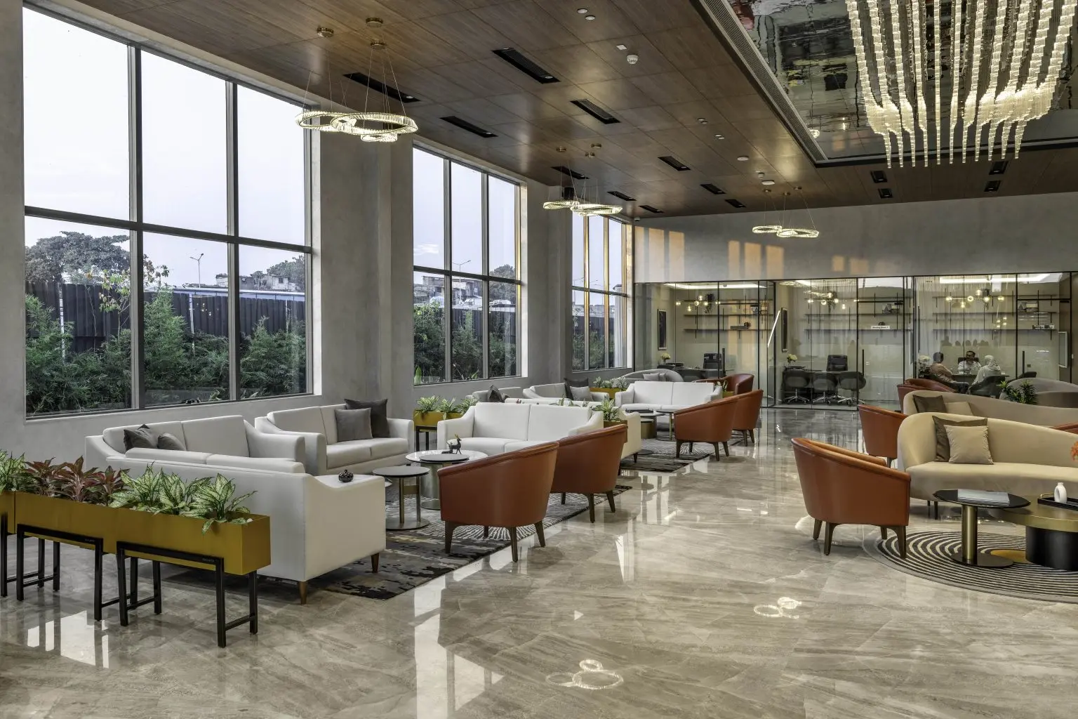 A gracious entry to the reception area sets the tone for the grandeur that awaits. A captivating prototype of the project is accompanied by an extensive waiting area designed for client comfort. Five meeting rooms offer sanctuaries for negotiations, while a cafeteria and discreet back office cater to the convenience and privacy of both clients and staff.