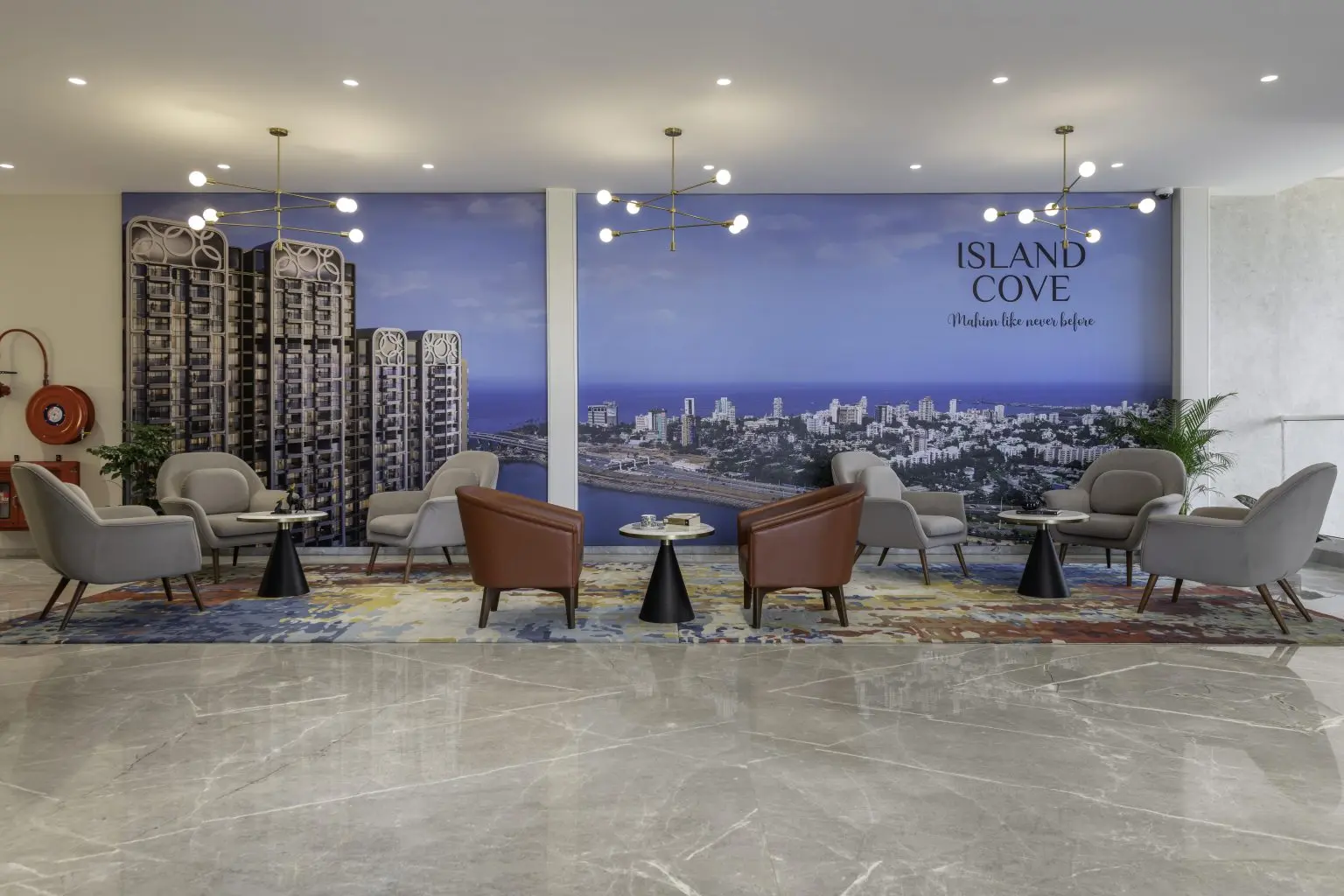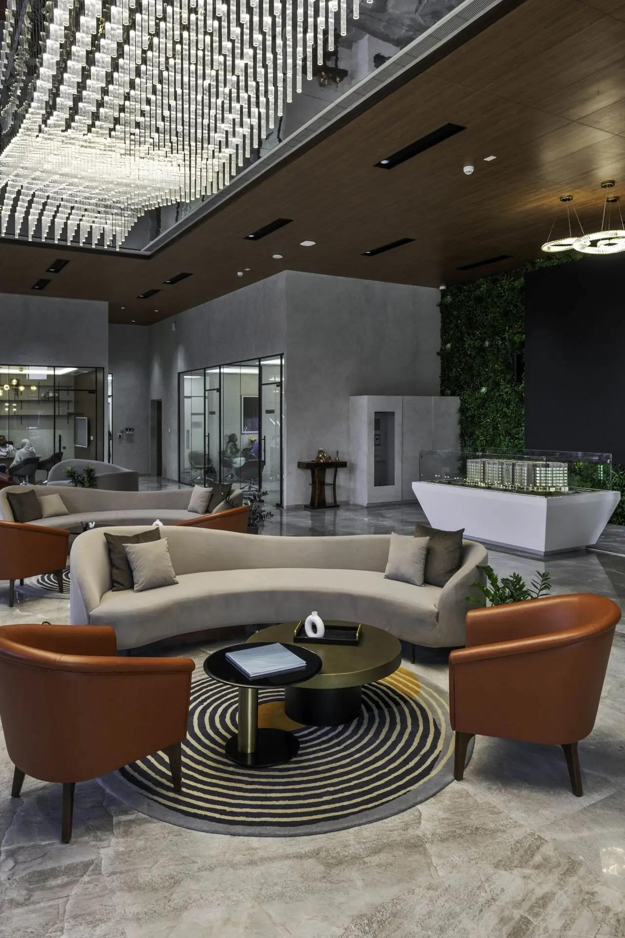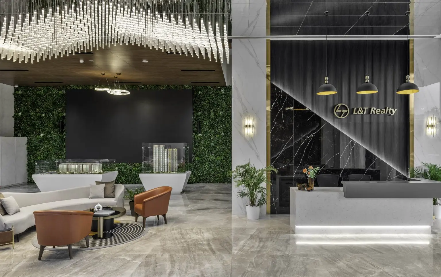 A captivating prototype of the project is accompanied by an extensive waiting area designed for client comfort. An impressive concept model is paired with an elegantly crafted lounge space, ensuring a welcoming and comfortable experience for visitors.