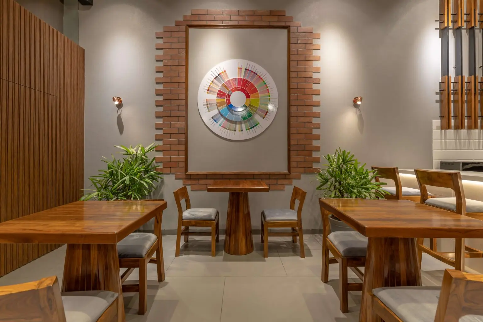 As we go inside we see huge table and also some small tables which is made up off wooden top and wooden legs with shiny polish. On right hand side of it there is a table which is used as partition also and sitting also. All the walls and partition is been highlighted with colors and paneling.