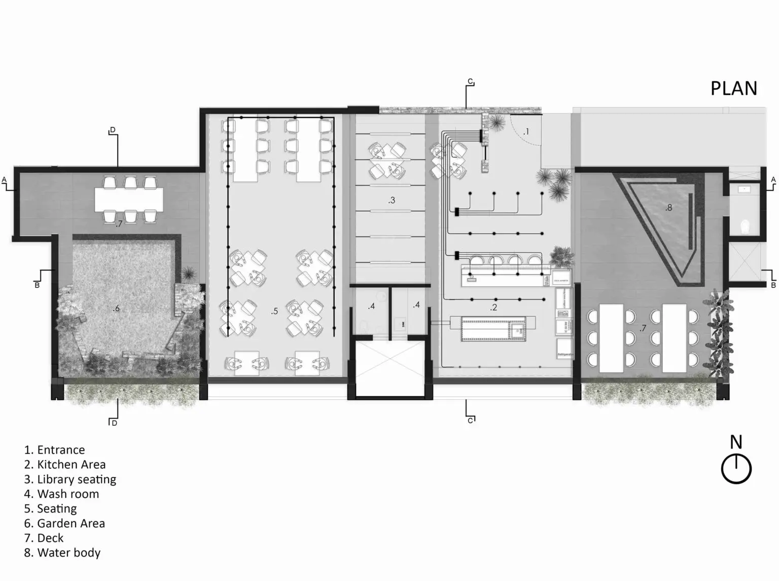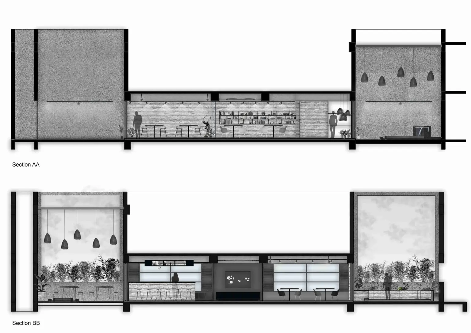 Within the café space, the seating areas, bar and open kitchen area and terrace areas are arranged for effortless flow of not only beverages, but also people, during times of large gatherings.