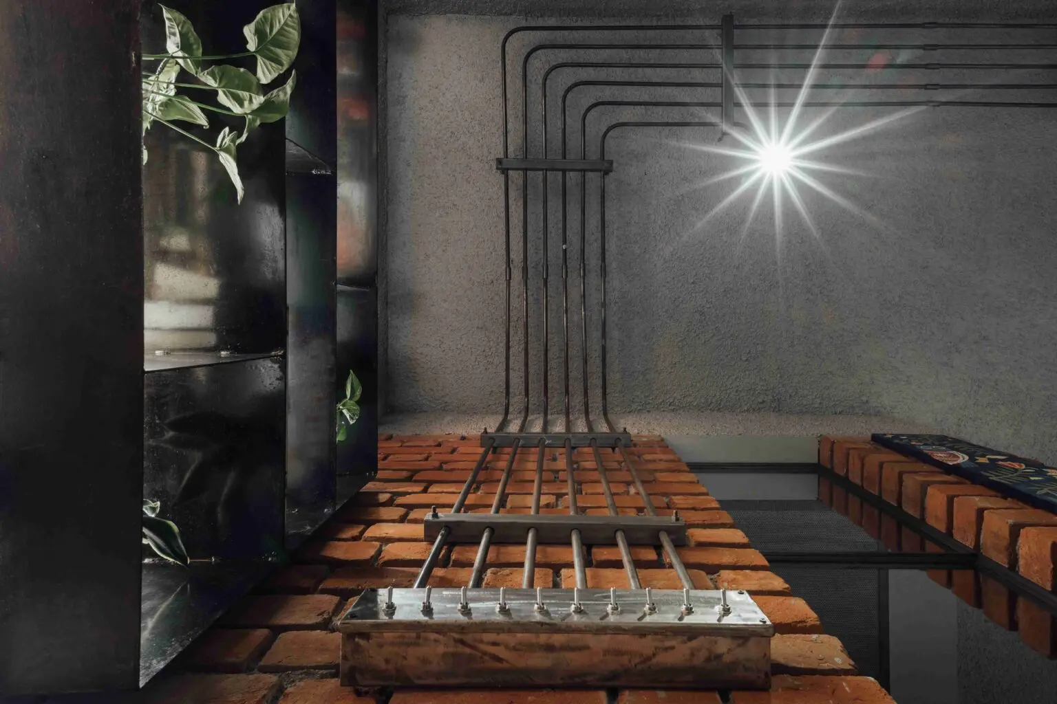 brickwork creates layers of shadows, overlapping with the sheen of the flooring.