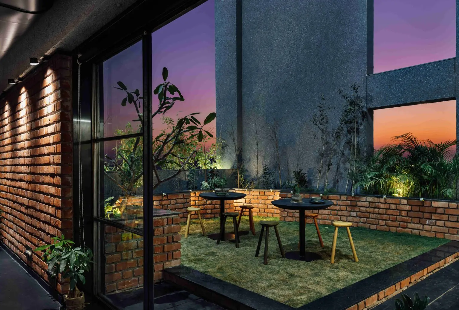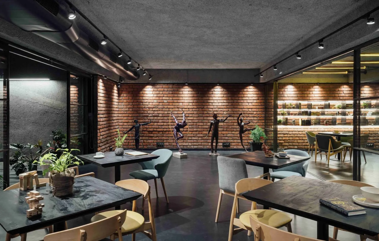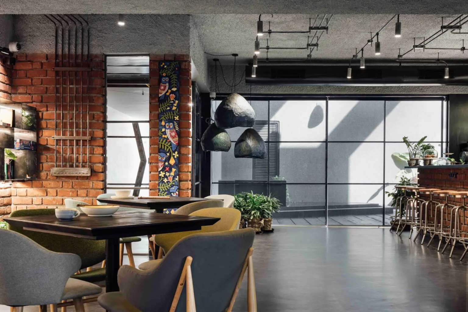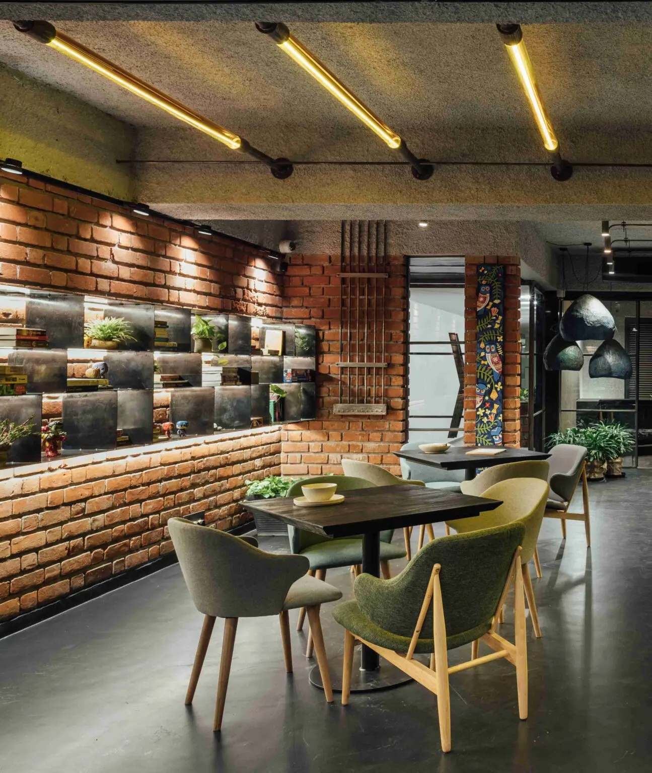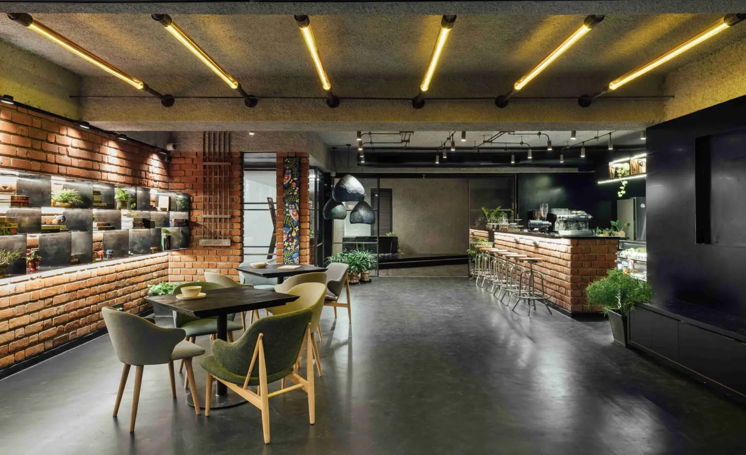 Enveloped by the rugged texture of brick-cladded walls, the café seating space is cast in a warm, subtle glow, when all the partitions are open.