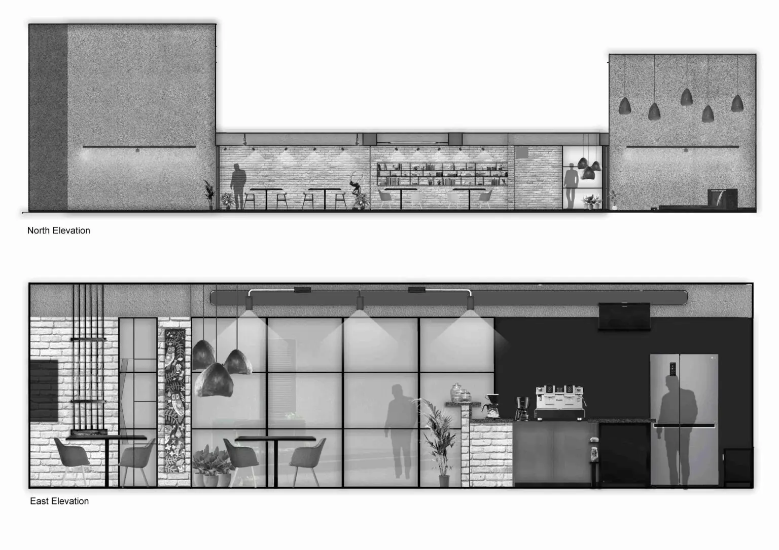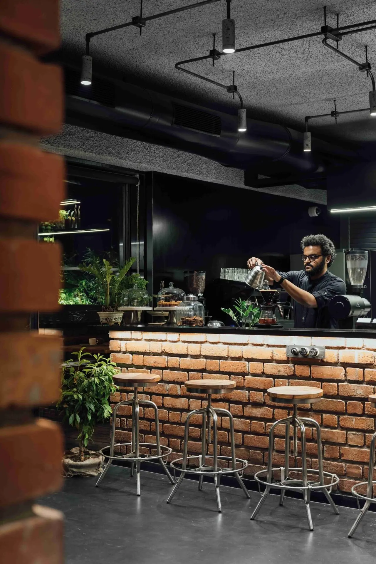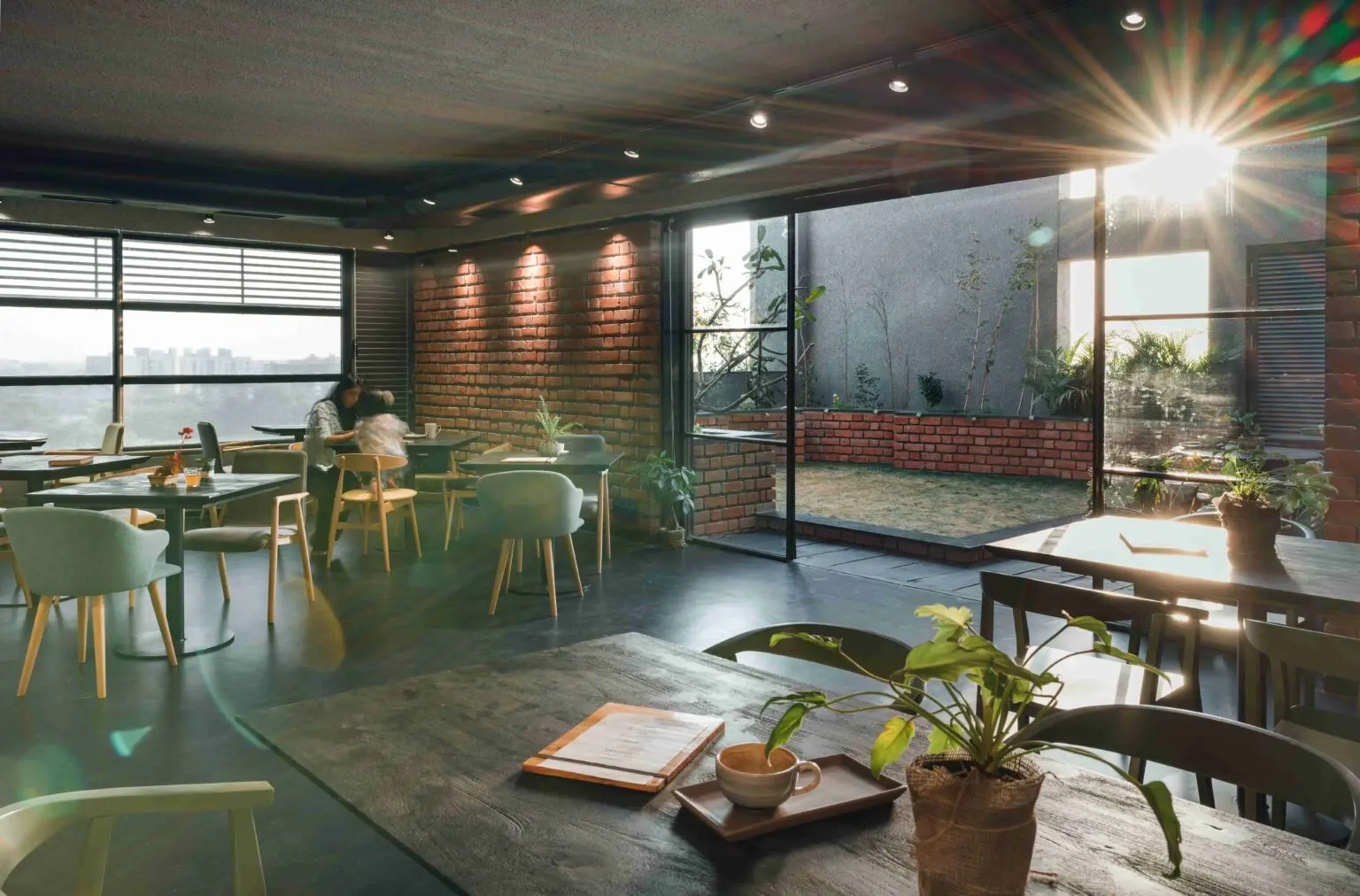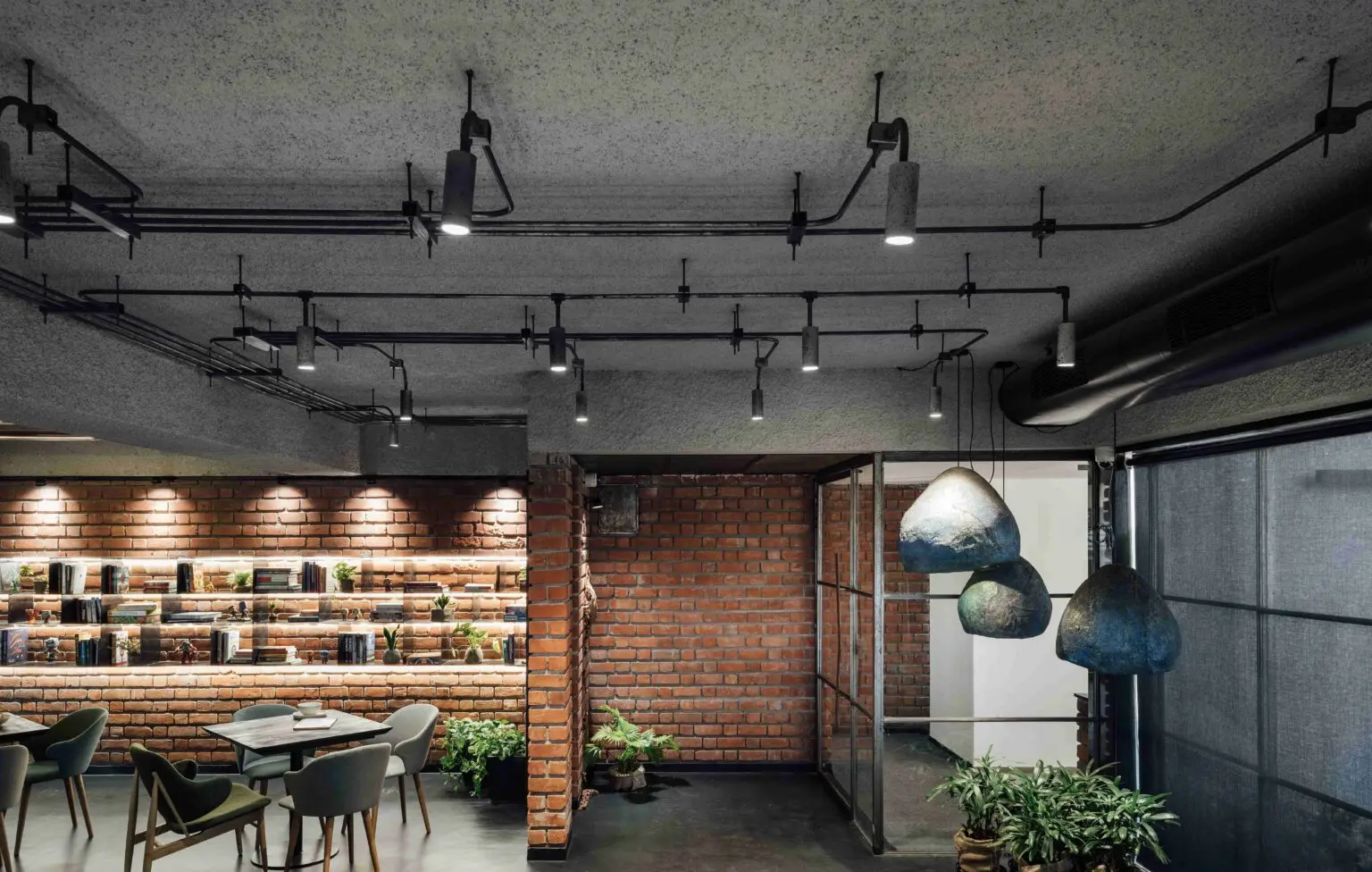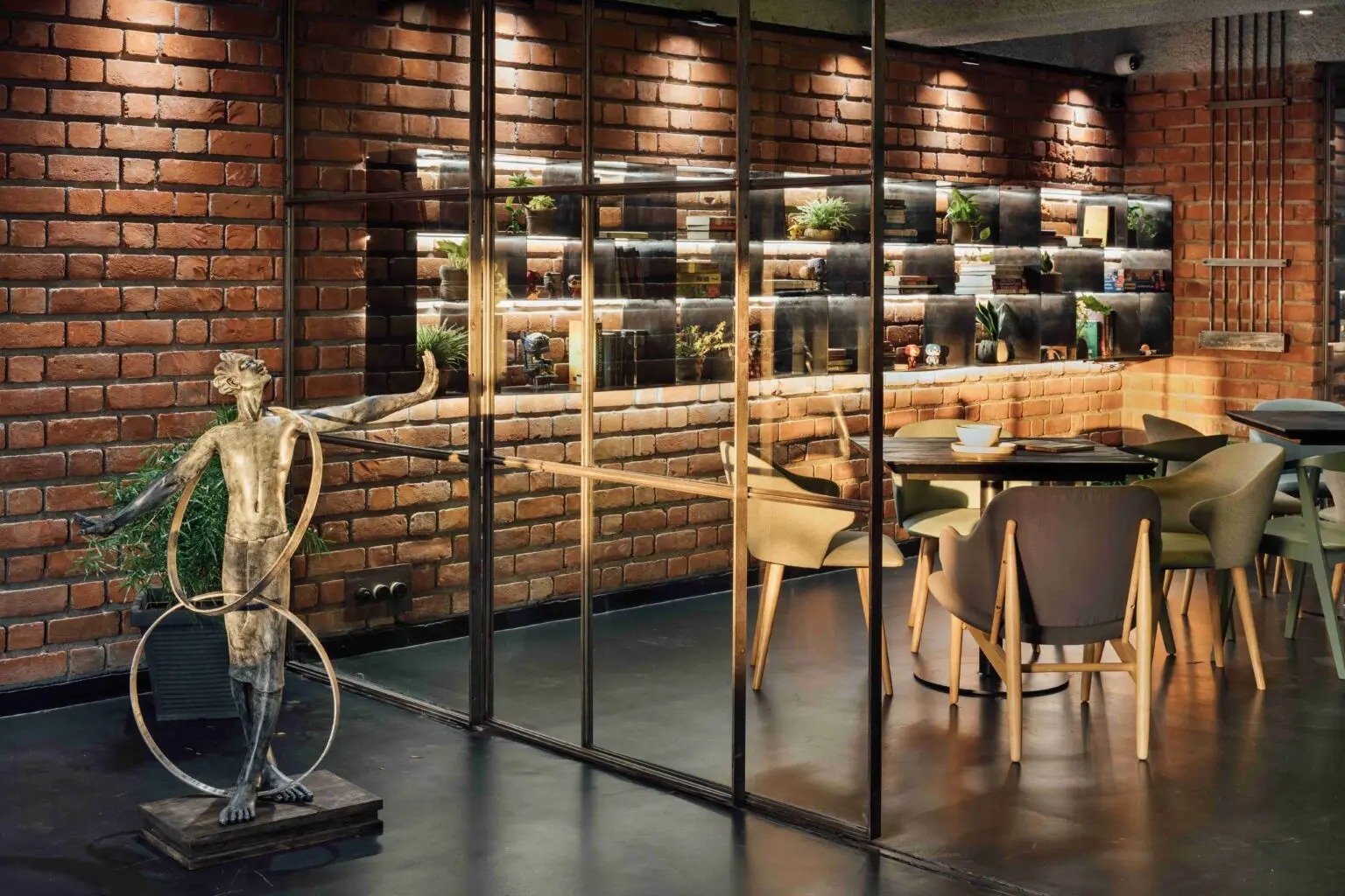 Enveloped by the rugged texture of brick-cladded walls, the café seating space is cast in a warm, subtle glow, when all the partitions are open.