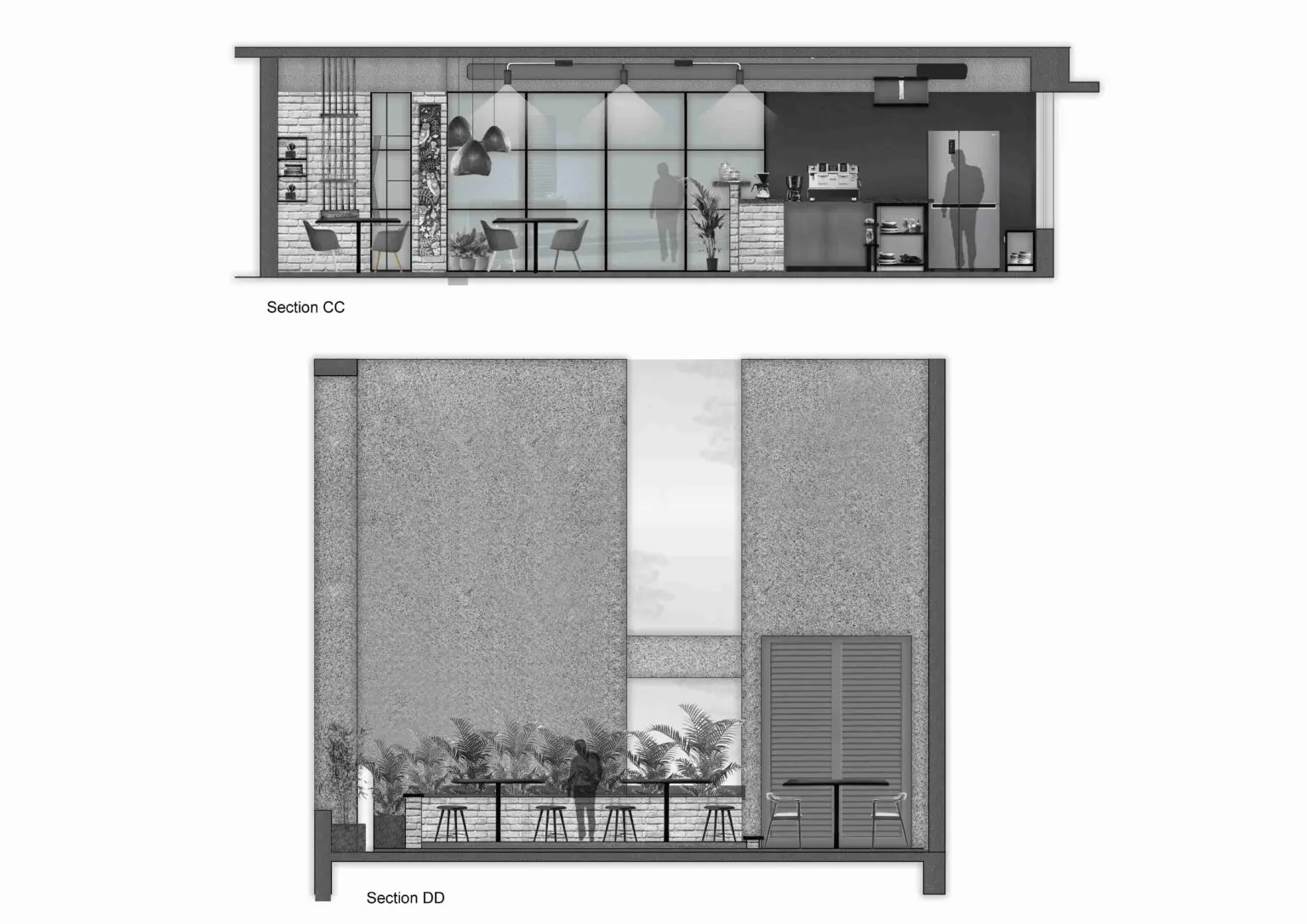 As a contrast to the other spill-out terrace, which is occupied with angular parapets and planters, this terrace is one for a quiet cup of coffee , perched on the high tables. The terrace at the other end of the café, however, is an open air outdoor performance and gathering area, as nuanced by the angularity of its parapets.