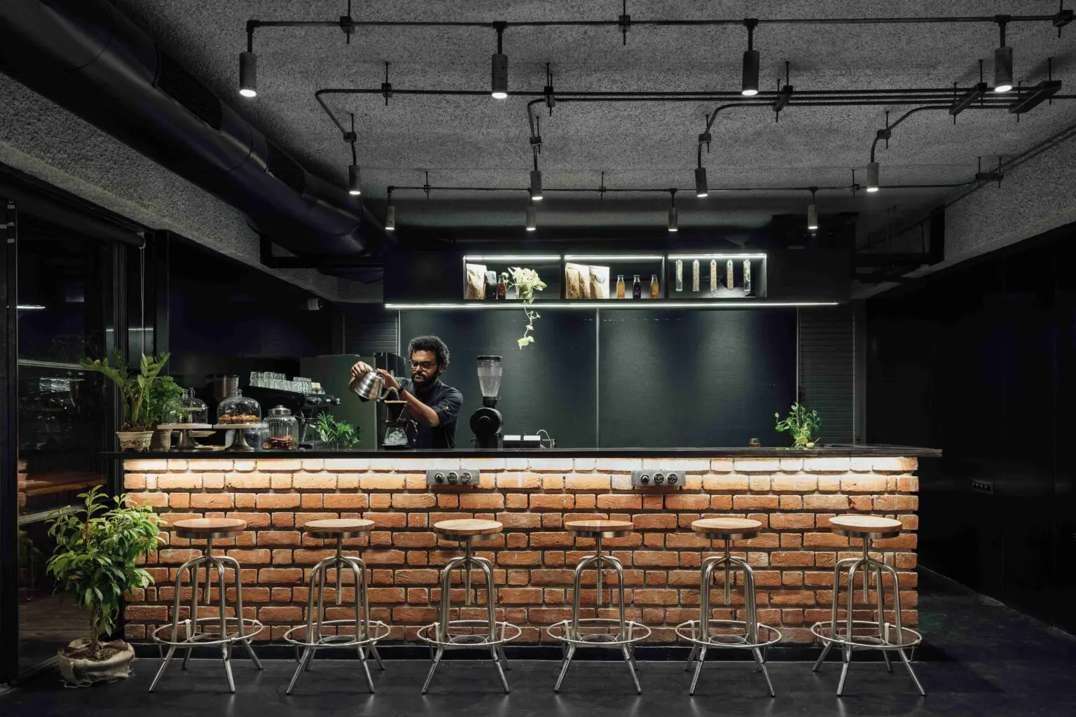 The spacious bar counter, with an open kitchen or preparation area behind it, is clearly visible upon entering. Cladded with brickwork and a jet-black granite counter, the bar is an imposing piece in the space. It immediately anchors the visitor within the space, under a floating storage unit overhead.