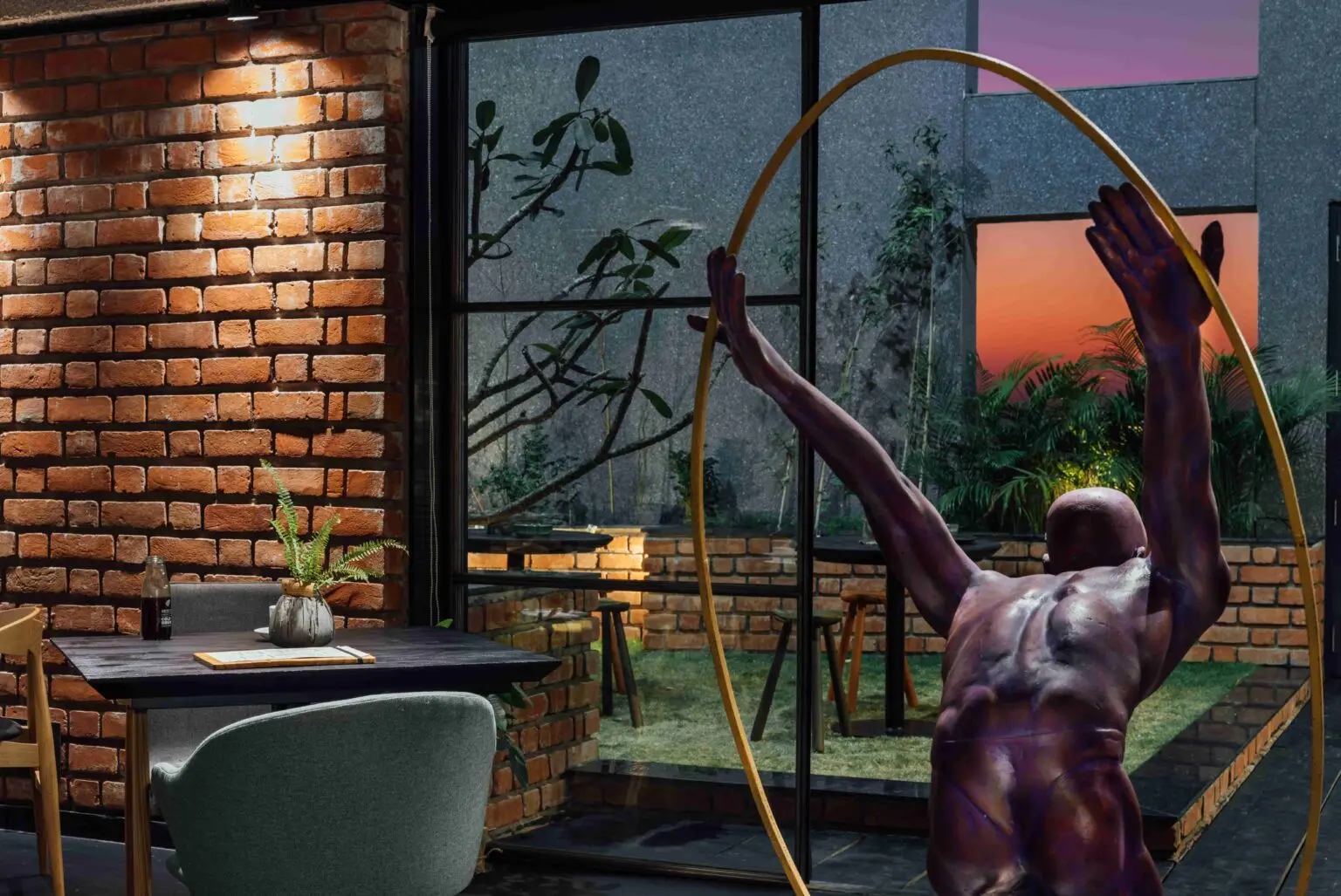 The rawness of exposed brick, specially designed lighting pieces, and framed views of the sky are the first impressions of this space- with aromas of coffee wafting in the background. As a signature statement of The Crossboundaries, a sculptural installation awaits at the entrance of the café.