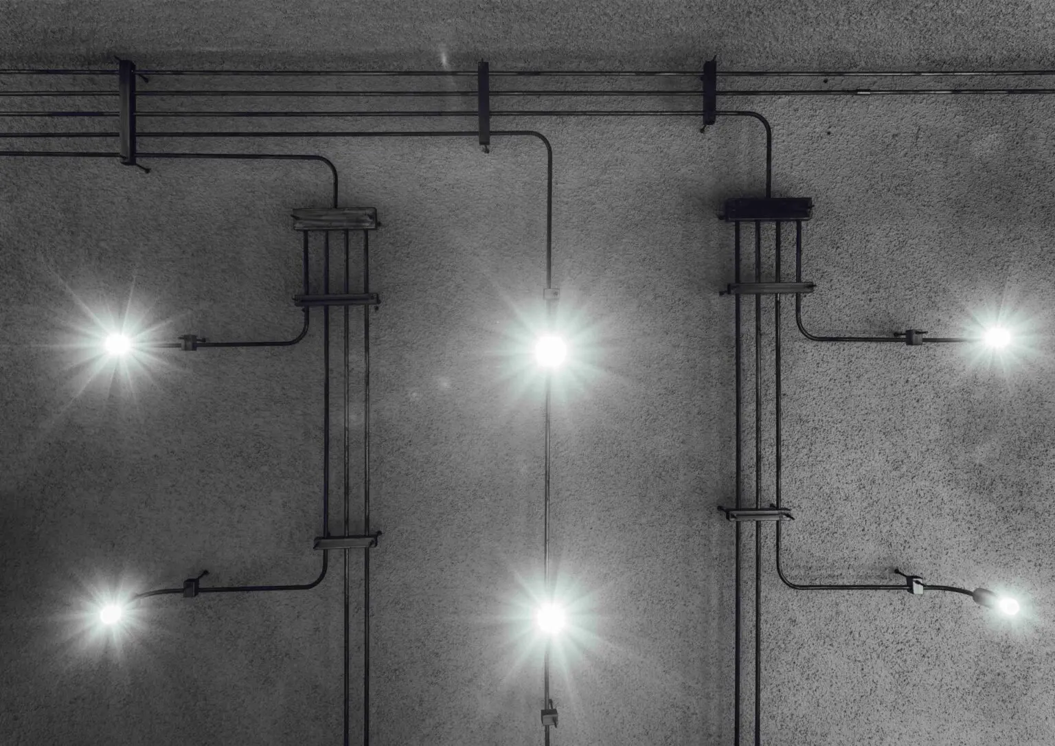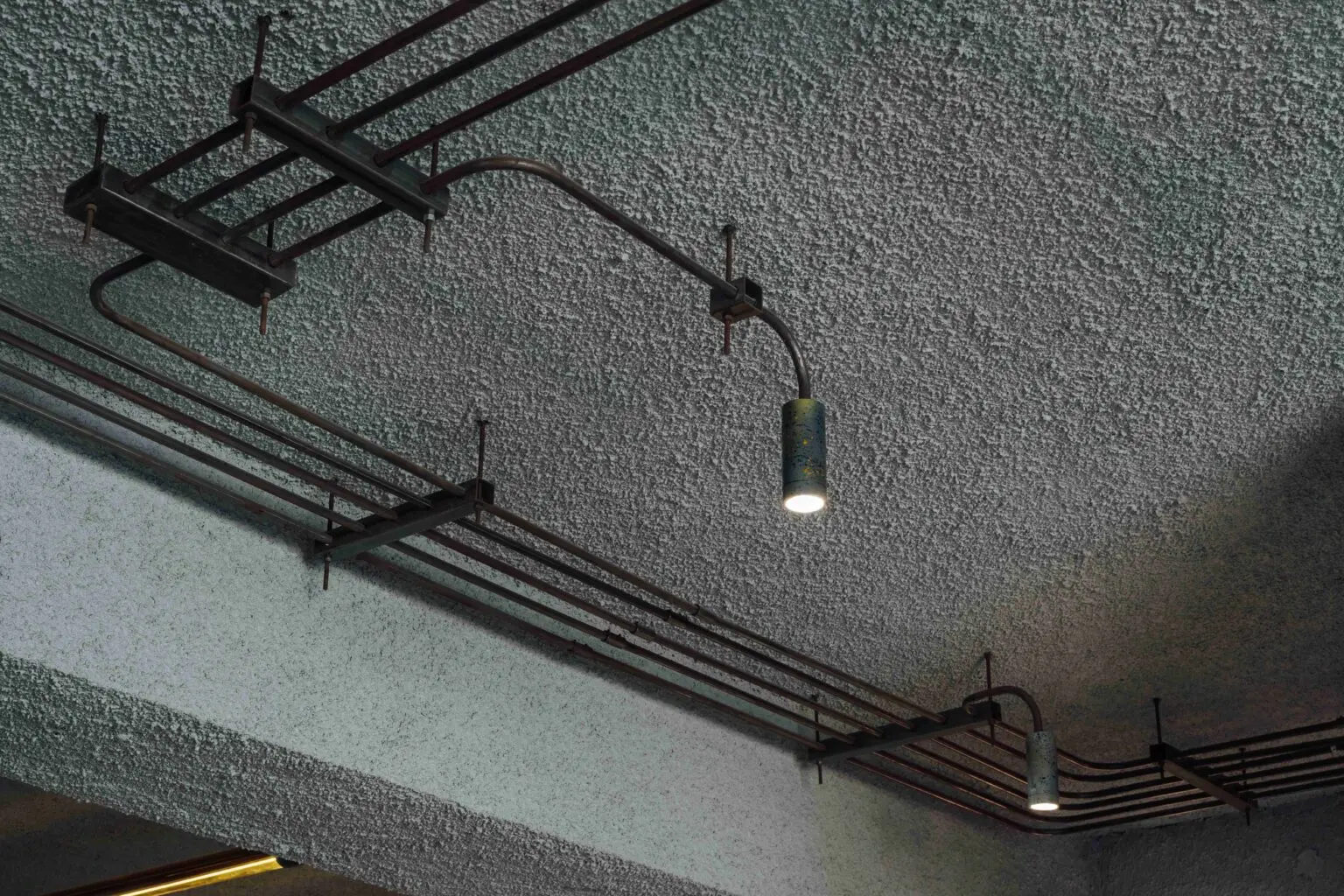 Running across the ceiling and along the beams, an array of bent- GI pipes, grouped equidistantly, and fluidly ending at different lengths. The pipes terminate in a bent curve, with a cylindrical spot-light fixture at its end. The radius of each curve has been carefully calculated and executed in place, to precisely illuminate a spot.