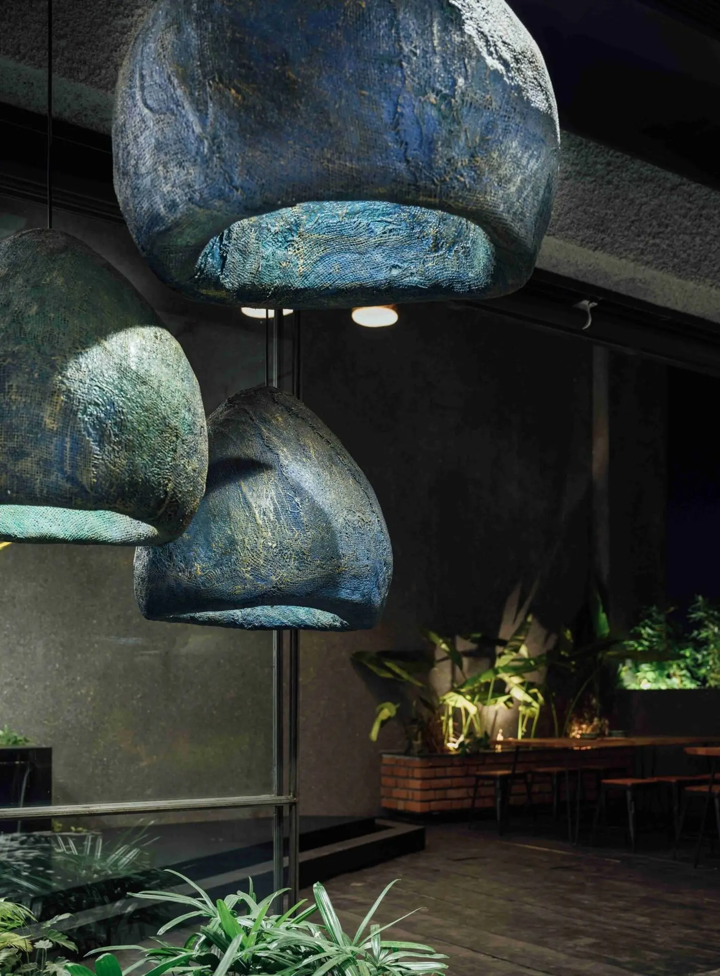 Colored in mellow blues and rust, the large, suspended jute lights go well with young plants. An array of 9 jute lights can also be seen, gently reflected in the infinity pool created on the left terrace.
