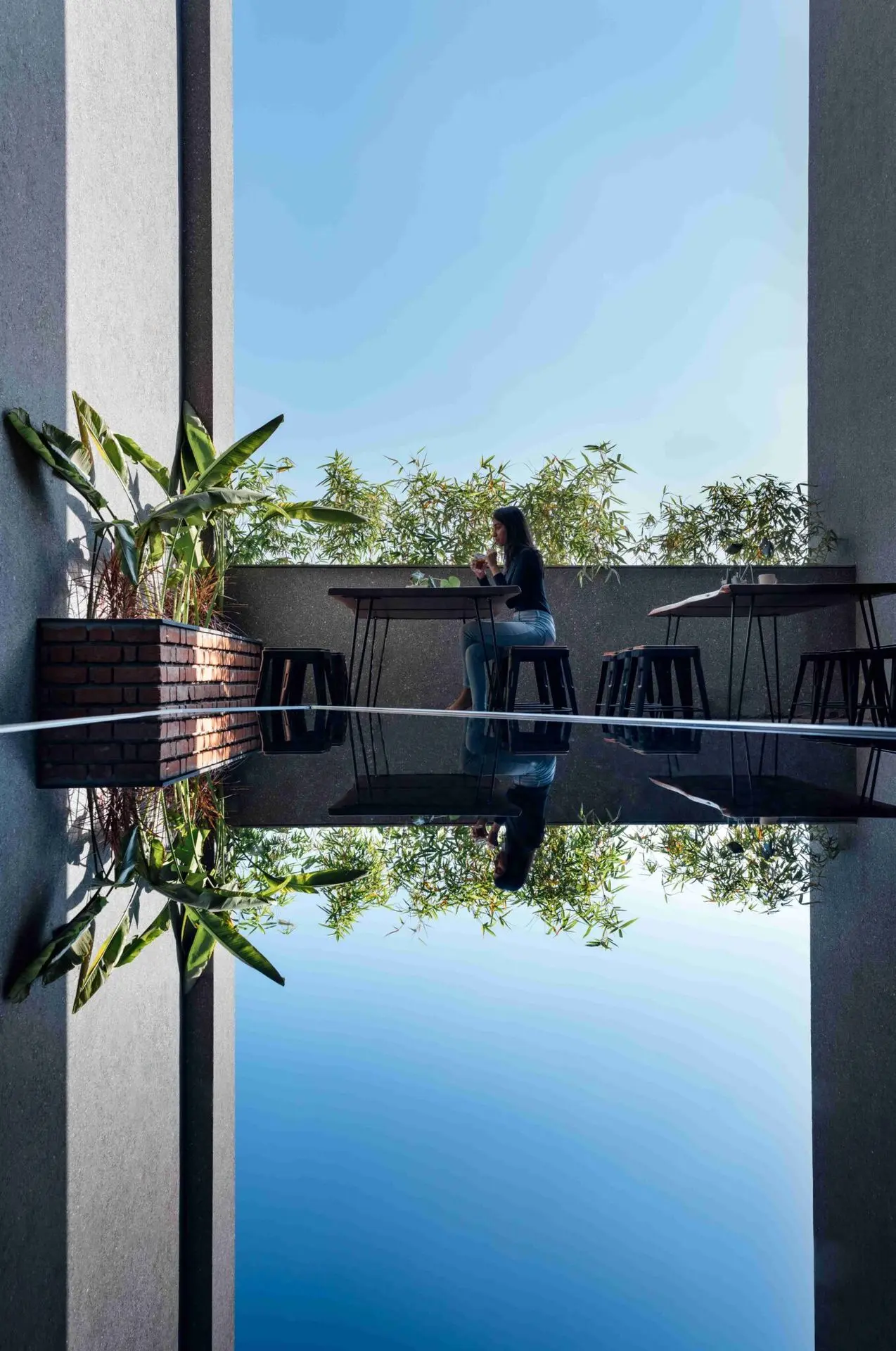 As the eye travels across the matt blackish café floor towards the glow of the terrace beyond, the sky is reflected in the infinity pool, sometimes with glimpses of birds and greens. This calm, meditative space was designed in the double-heighted volume, and is finished in hand-picked black granite surfaces.