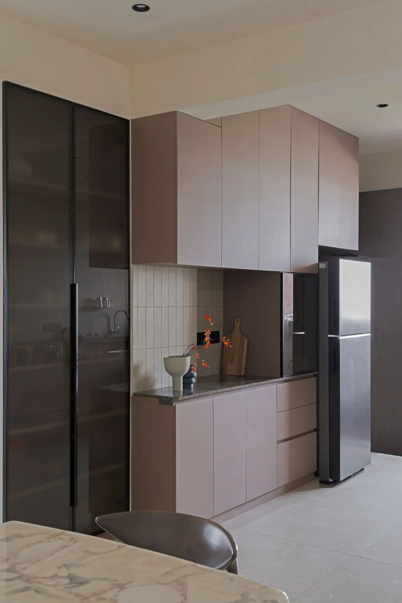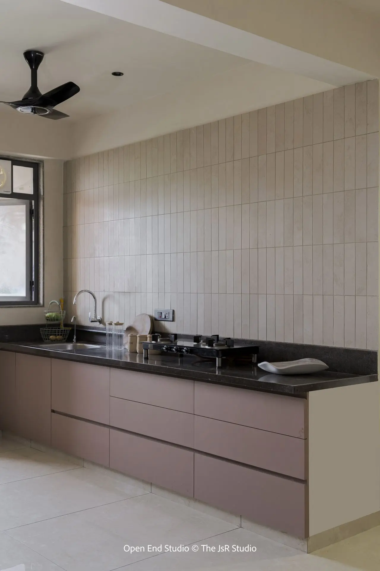 Continuing the earthy narrative, the kitchen is designed without overhead cabinets, allowing the wall to become the defining element. Hand cut tiles create subtle movement across the surface, paired with dull terracotta matte drawers that sit harmoniously within the same colour family. The space reflects how thoughtful detailing can elevate everyday functionality into a refined yet soulful environment.