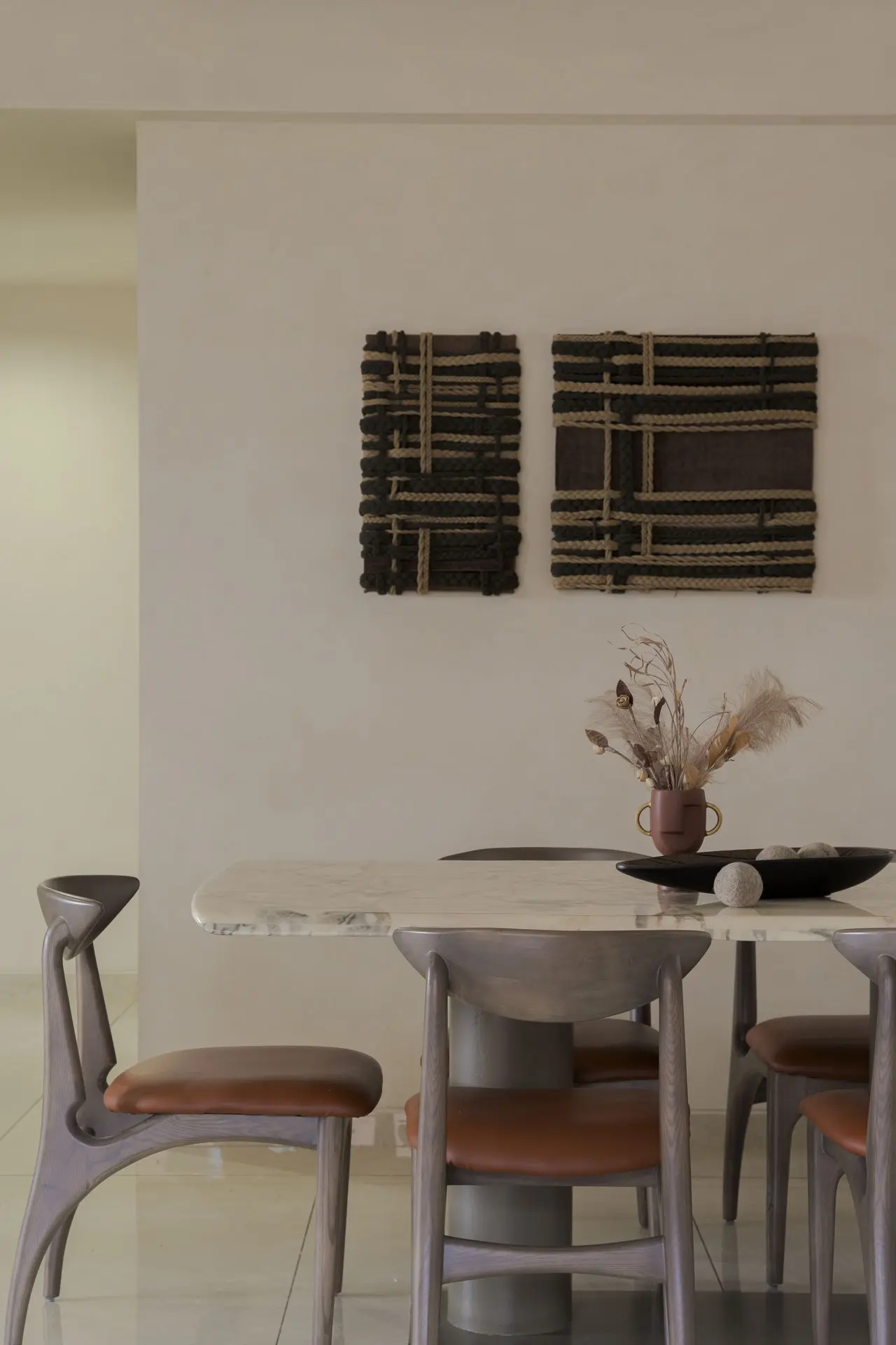 Art within Mud Bubble celebrates authenticity over perfection. A hand woven wall art piece crafted from two types of rope echoes the project’s deeper philosophy. Layered and knotted by hand, the artwork embraces irregularity and texture, becoming a quiet expression of craft, patience, and material honesty.