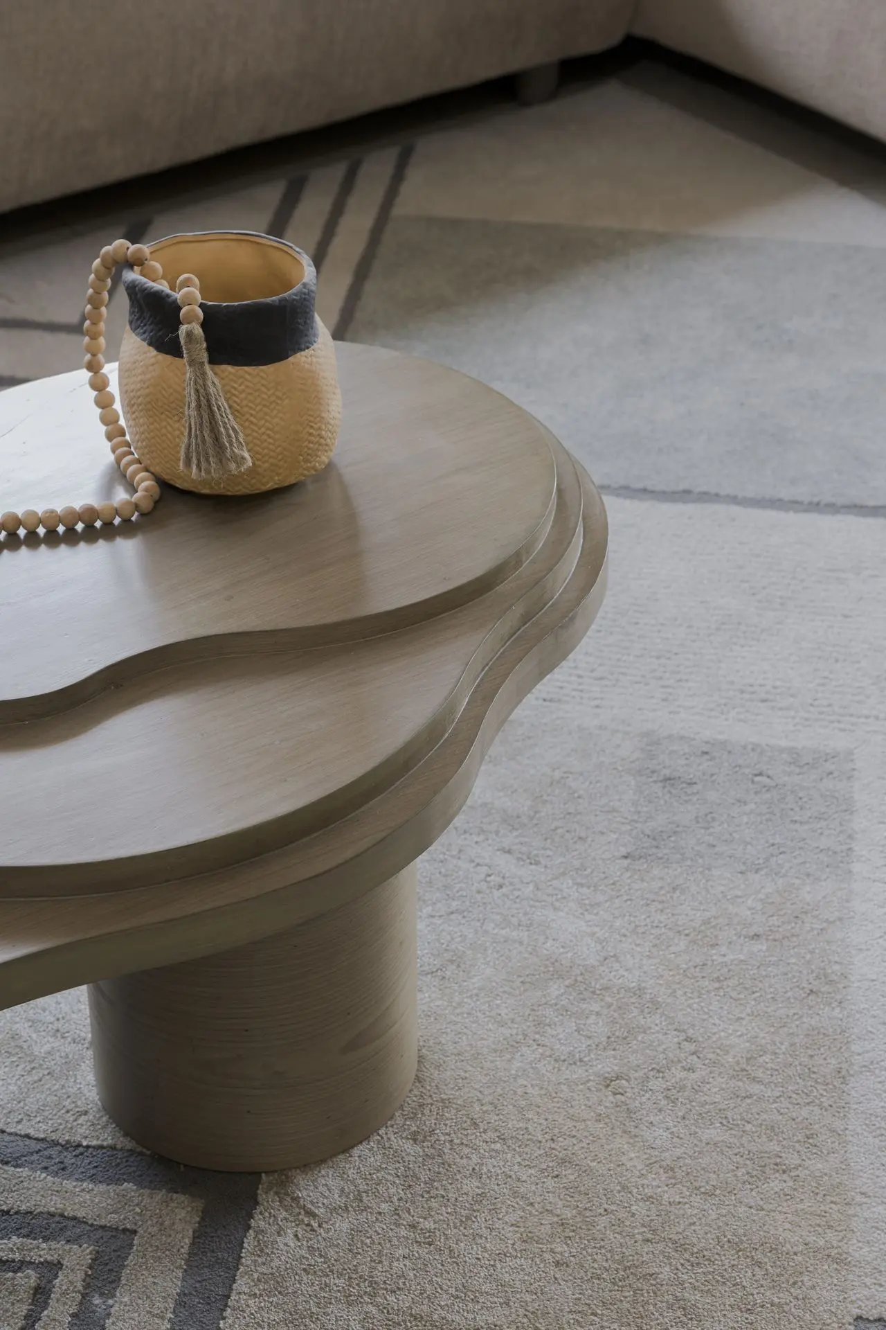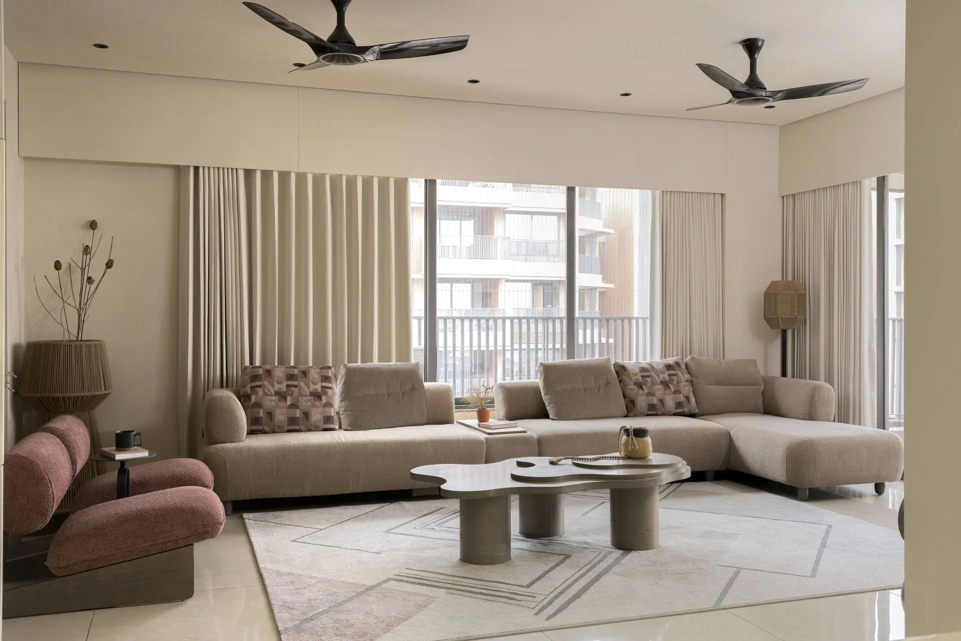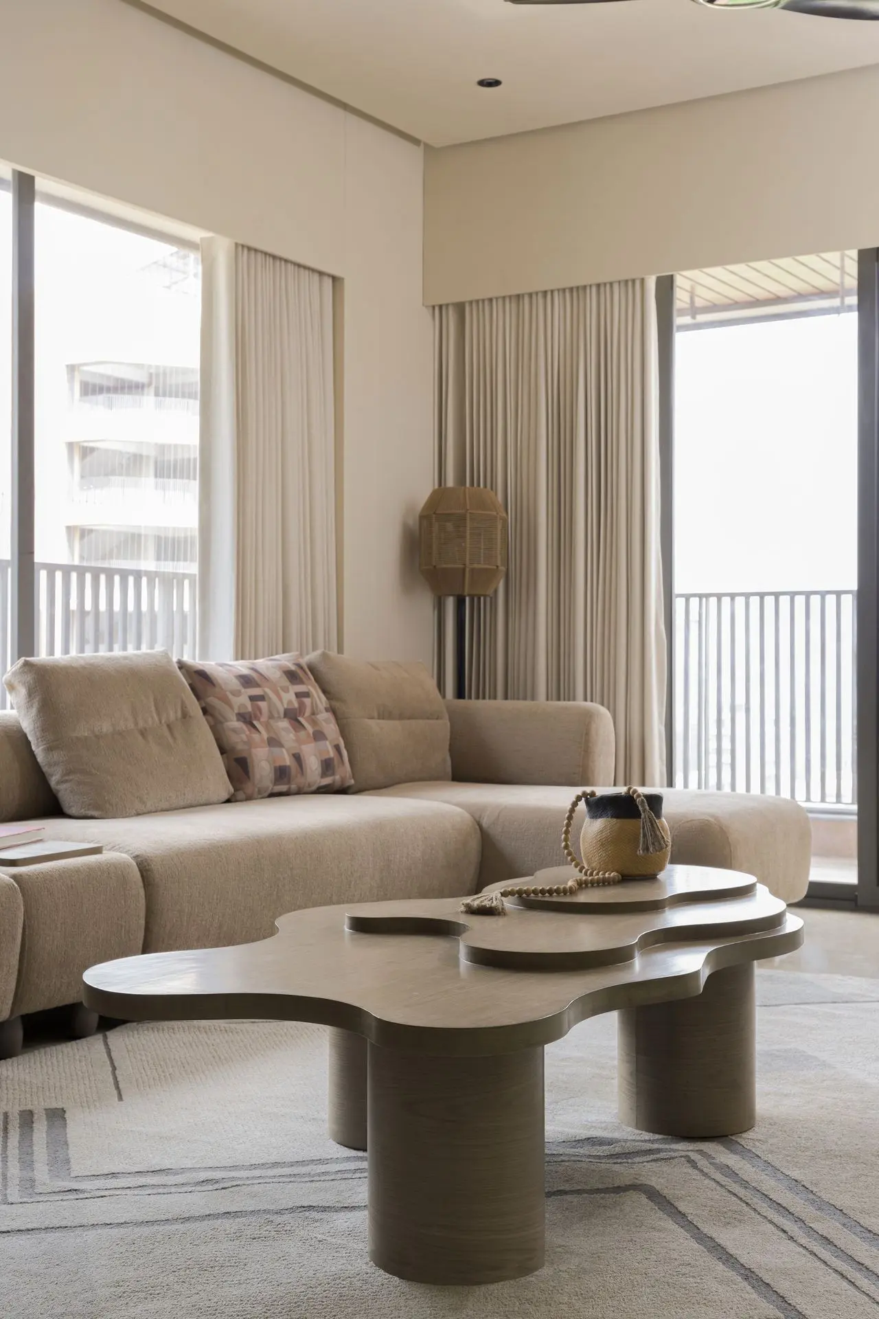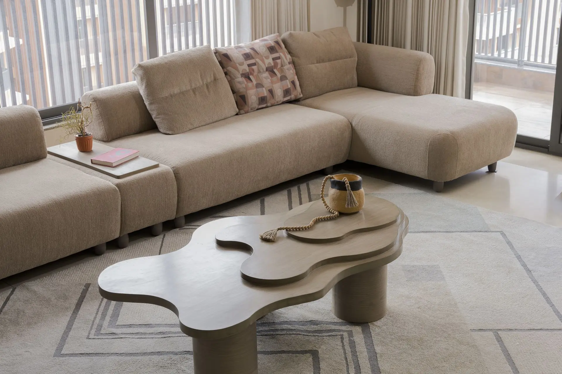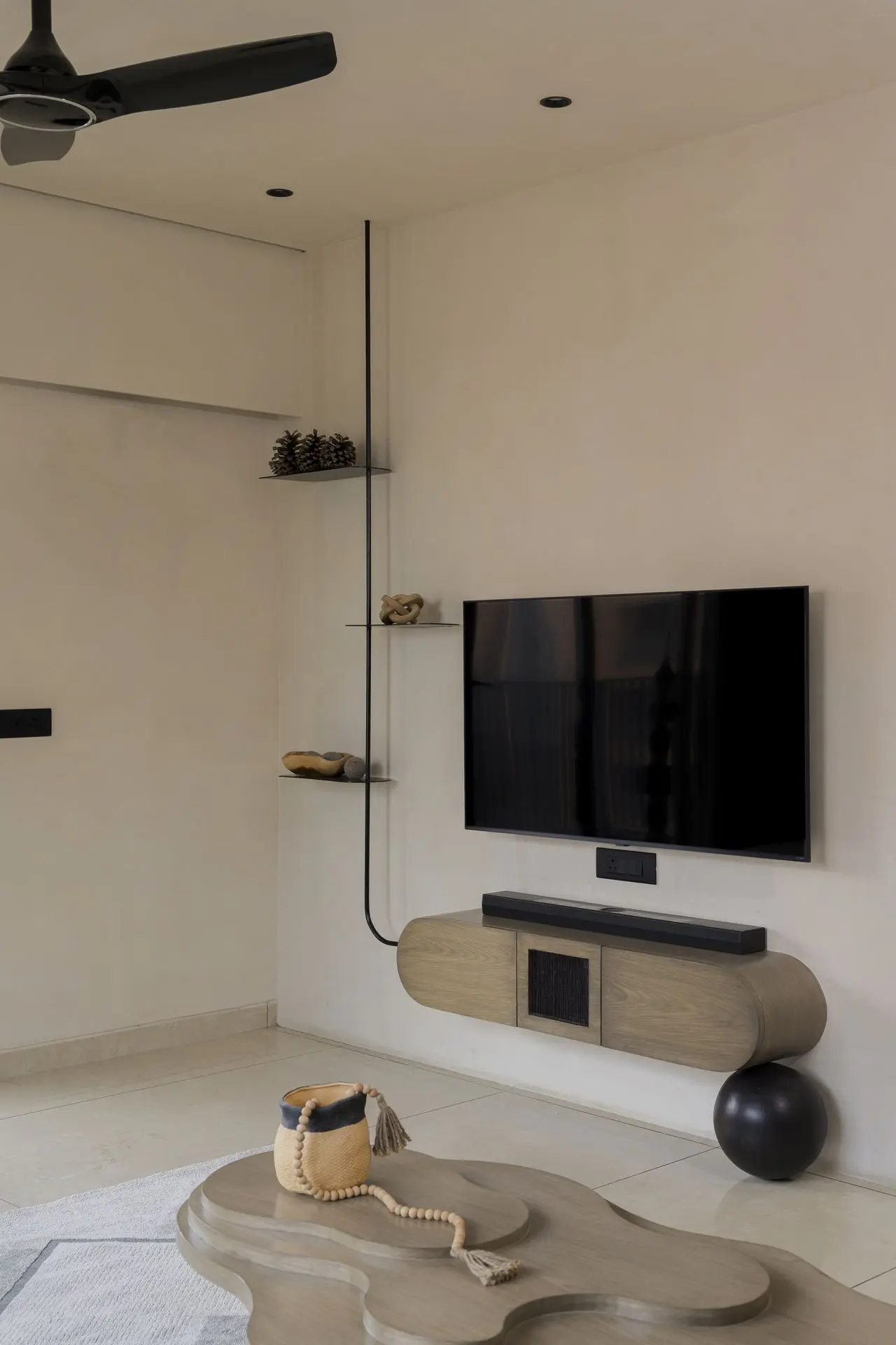 The drawing room forms the heart of the home, designed as a space of quiet strength and balance. A free flowing centre table inspired by the movement of liquid mud introduces an organic rhythm, while a feature stone wall composed of four natural stone shades brings depth and texture. The soft beige seating blends seamlessly into the backdrop, and the TV unit stands out through handcrafted rope detailing that adds both character and functionality.