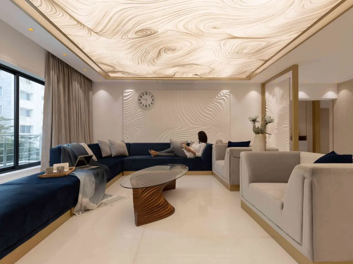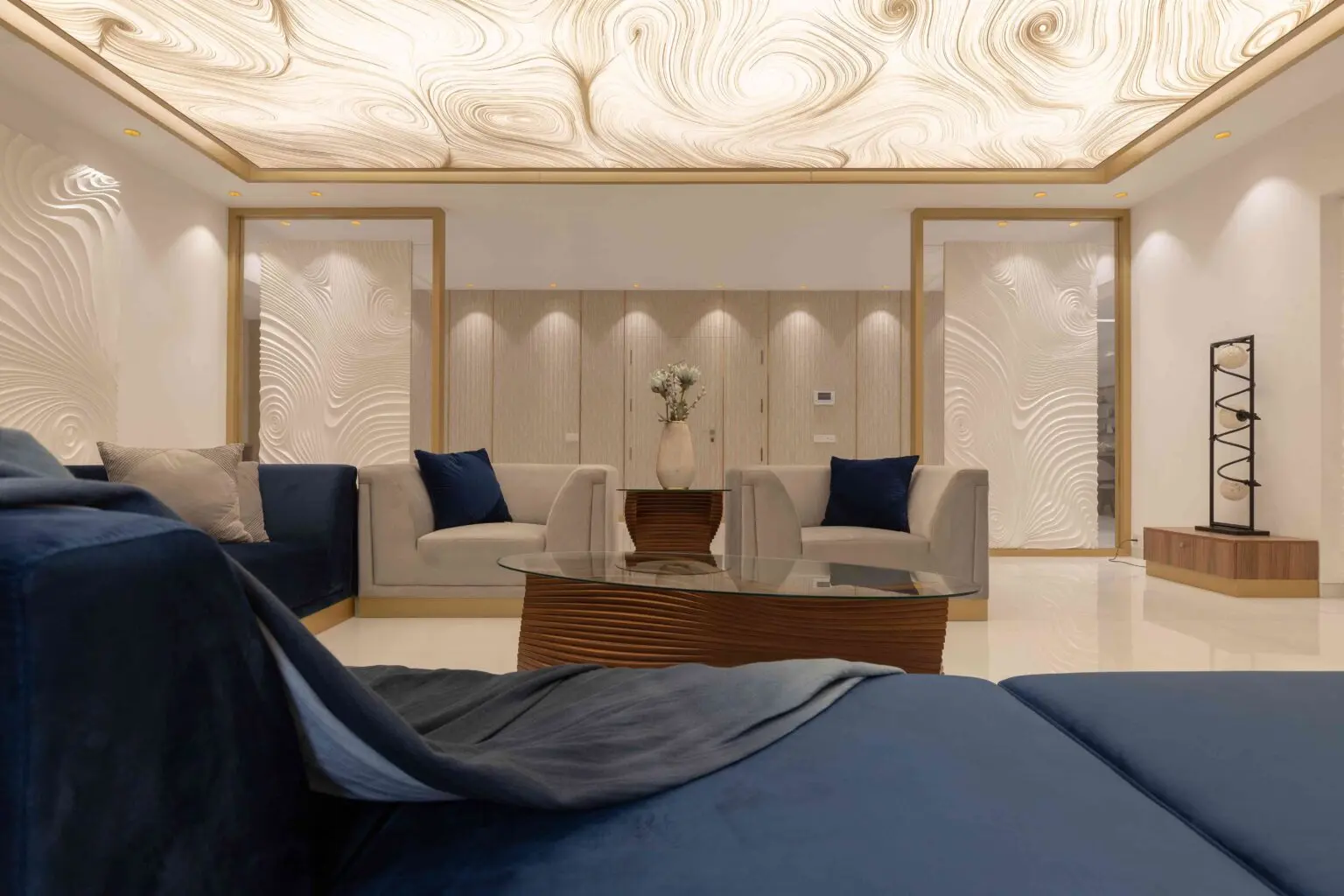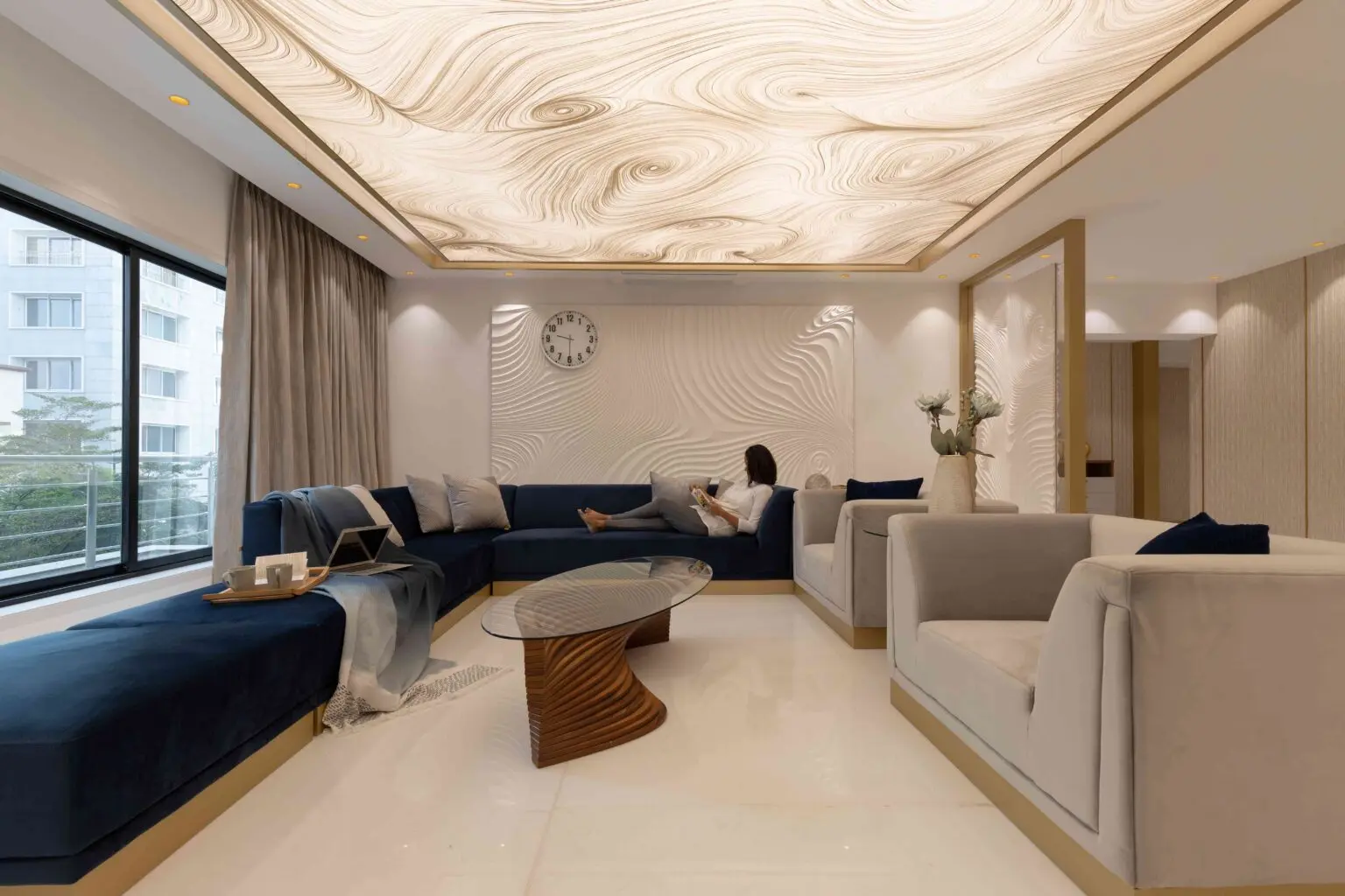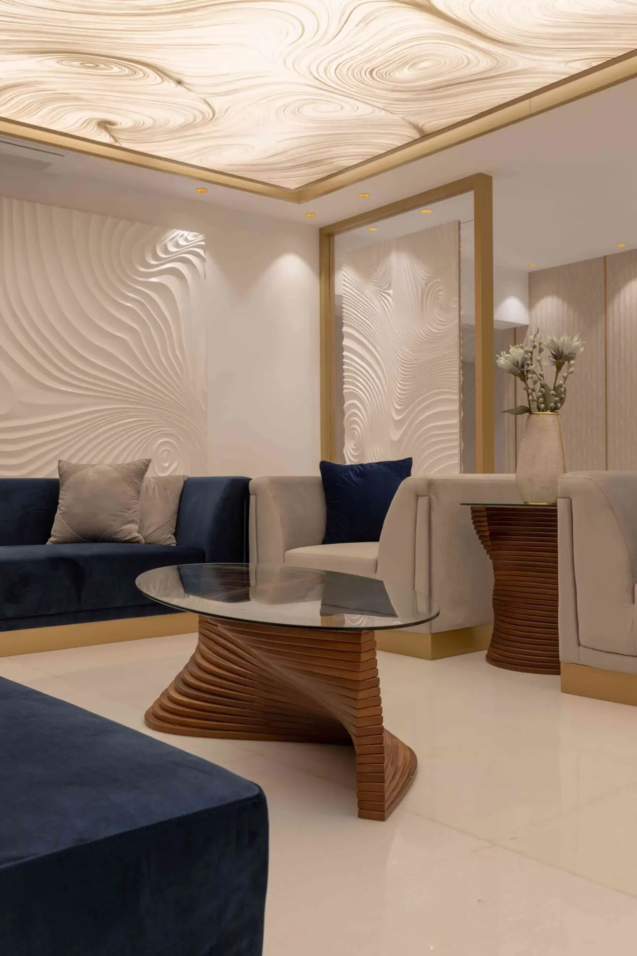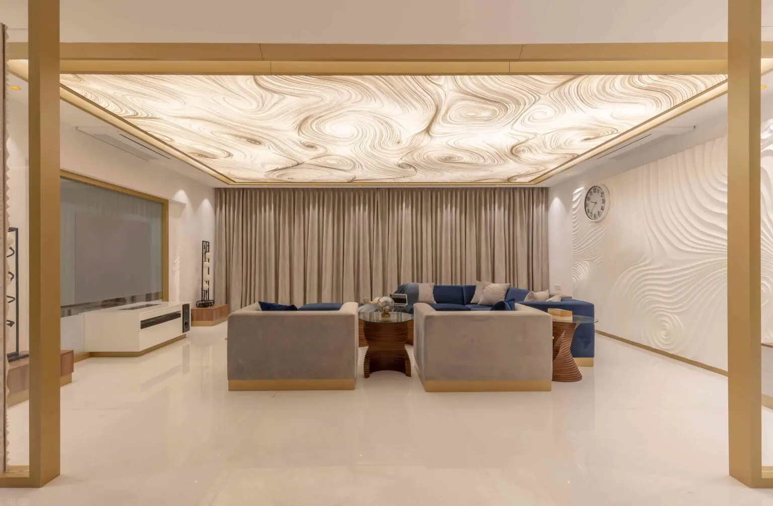 The use of muted cream on the walls in the living space sets the character of the room, while the aureate strips on the ceiling and Sofa sets base shows glimpse of the luxury.