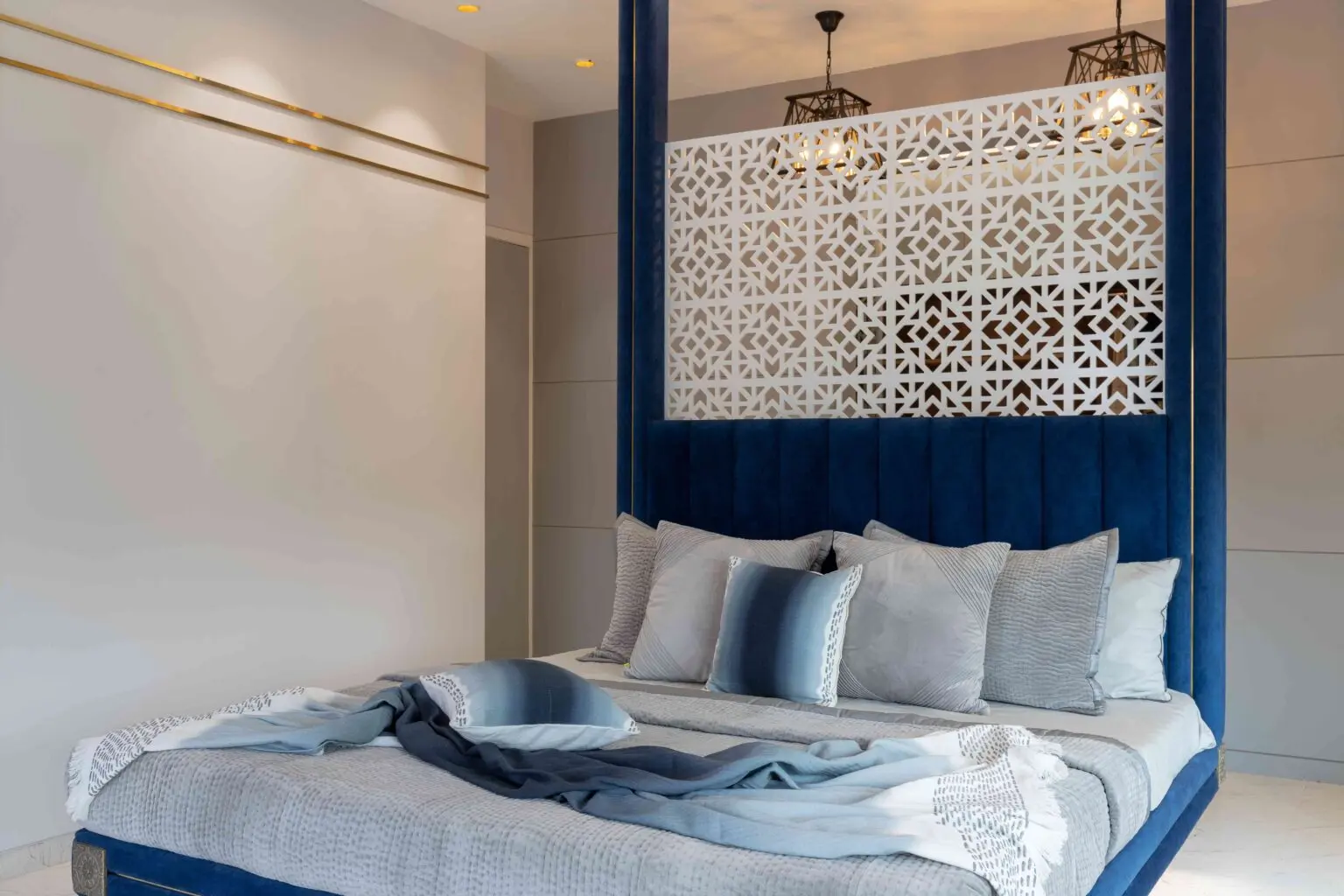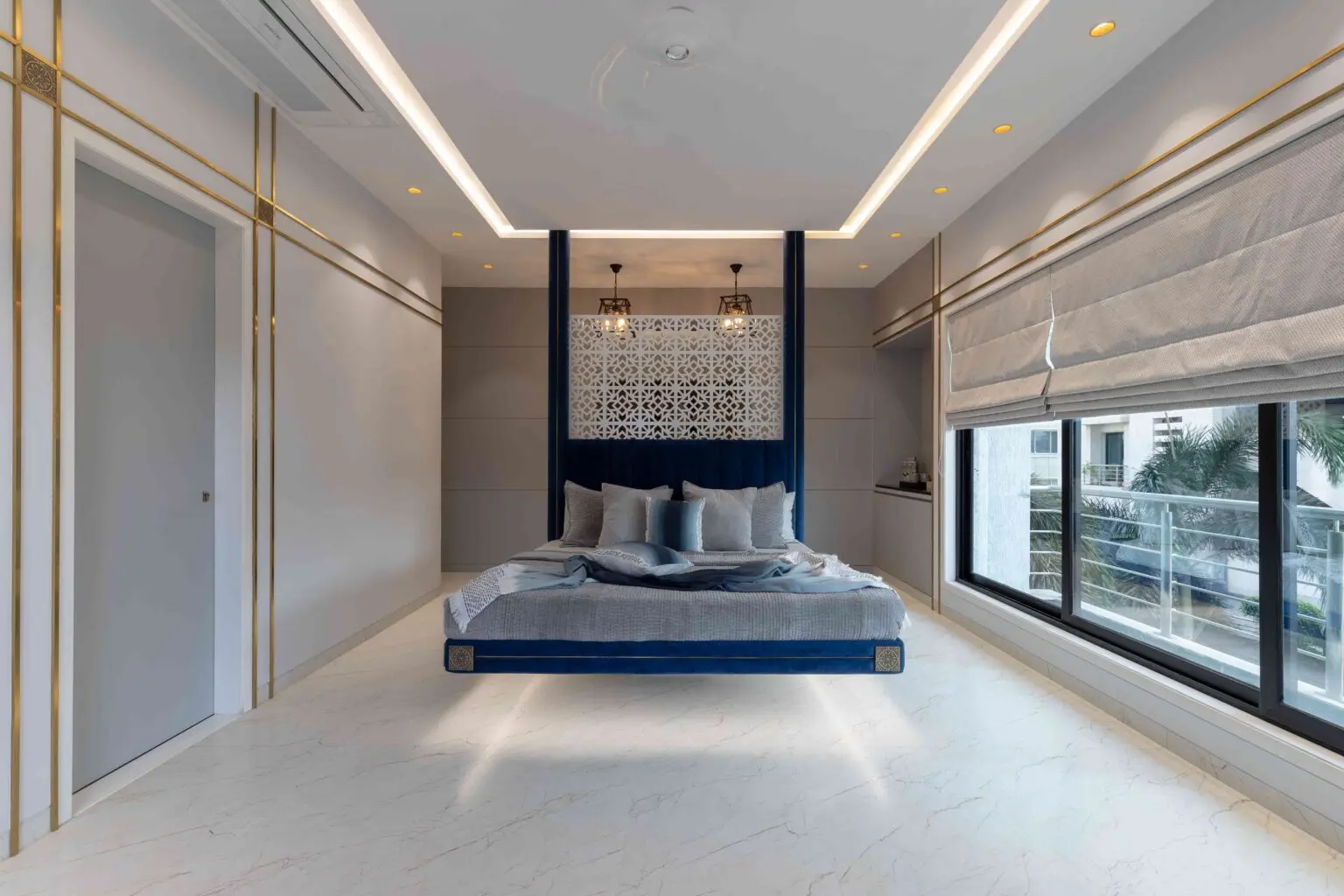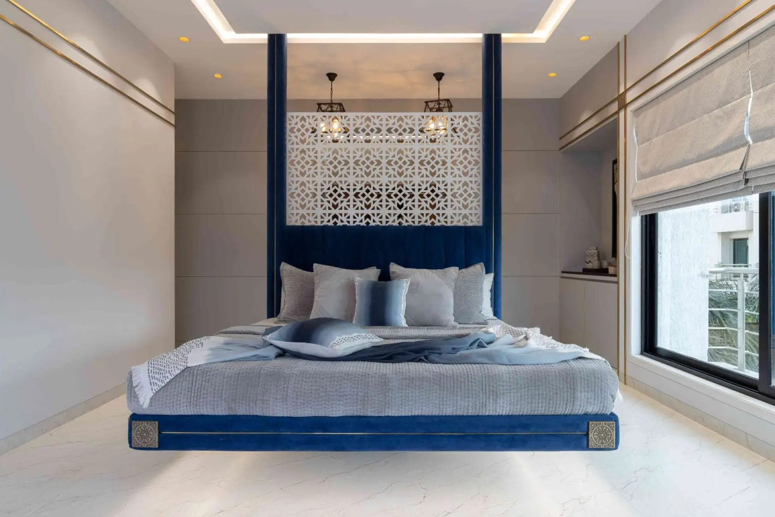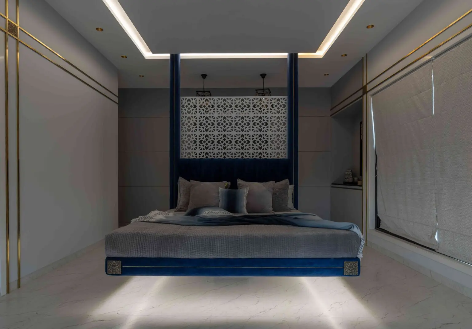 The master bedroom is a lavish space with an amalgamation of masculinity and femininity as seen with the robust backrest of the opulent floating bed mingled with Corian jali.