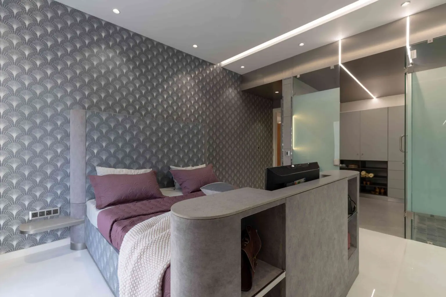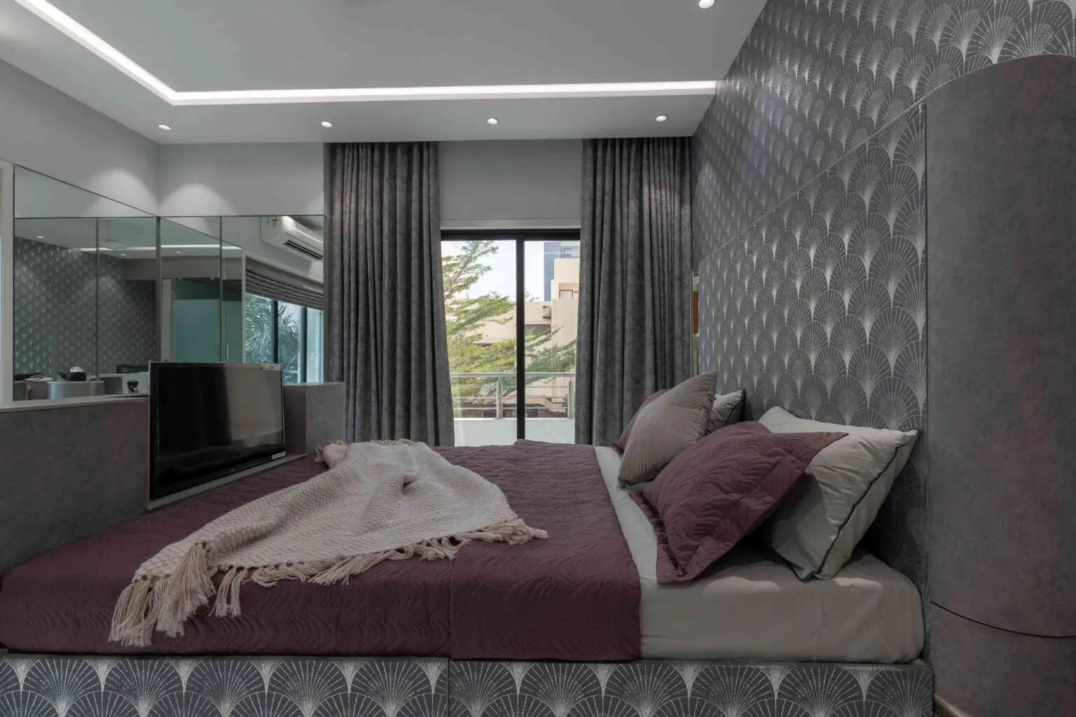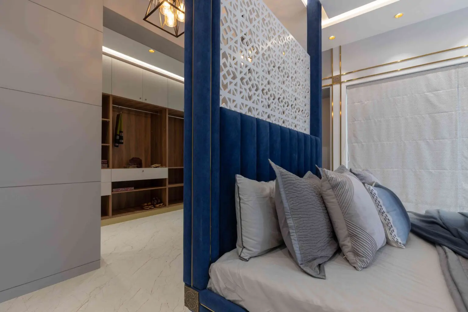 The master bedroom is a lavish space with an amalgamation of masculinity and femininity as seen with the robust backrest of the opulent floating bed mingled with Corian jali.