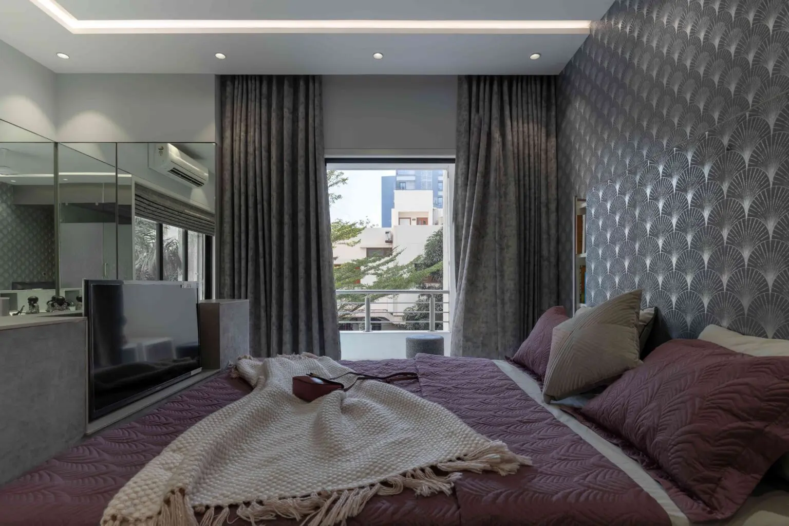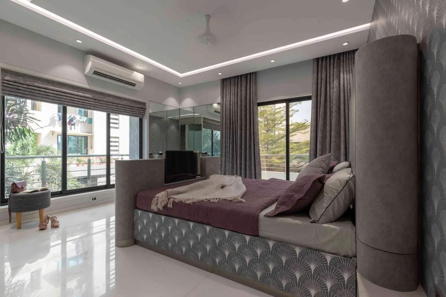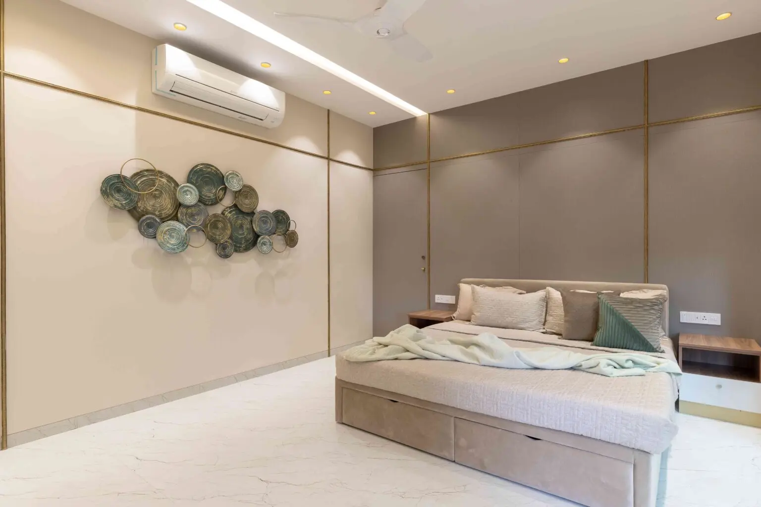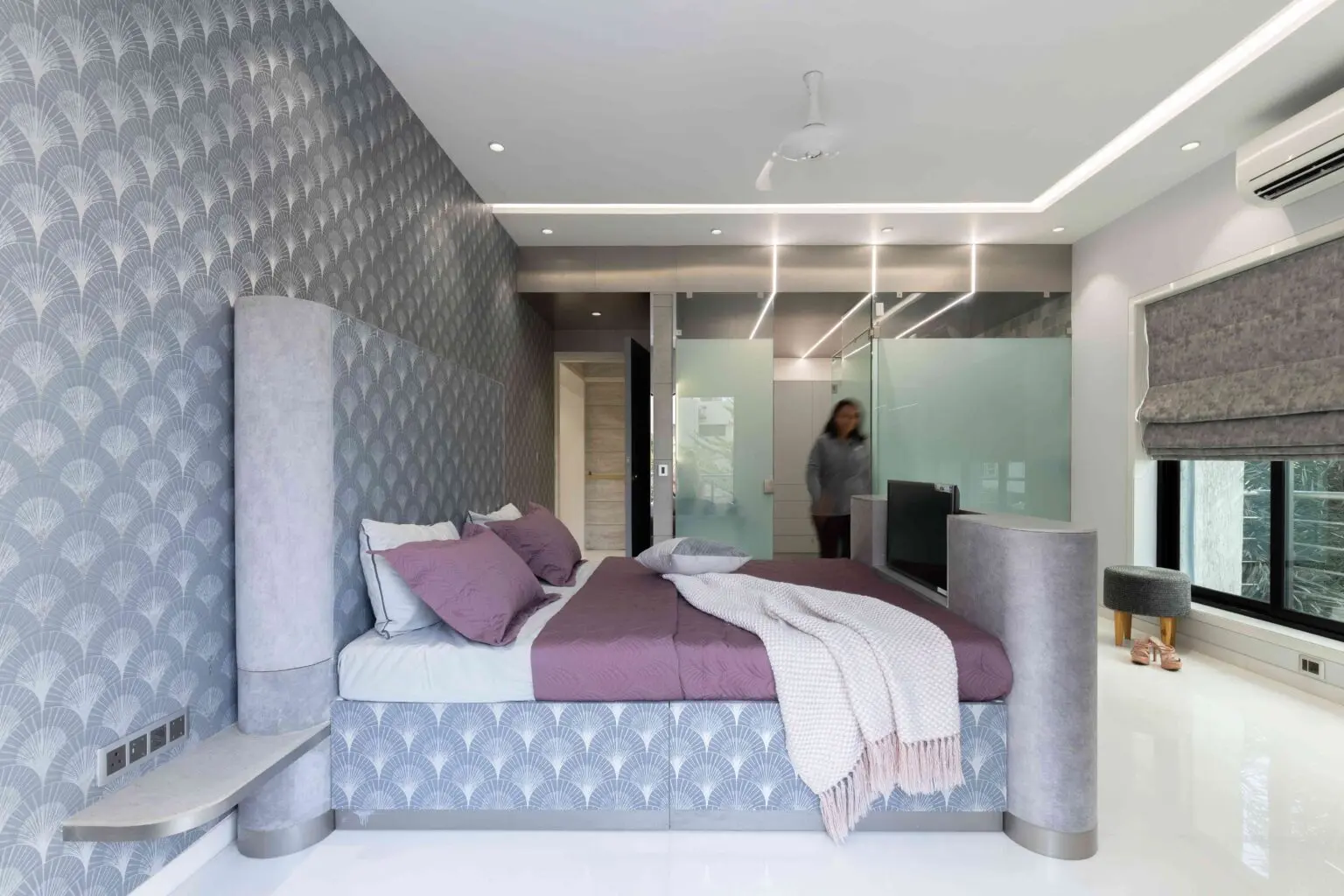 The master bedroom is a lavish space with an amalgamation of masculinity and femininity as seen with the robust backrest of the opulent floating bed mingled with Corian jali.
