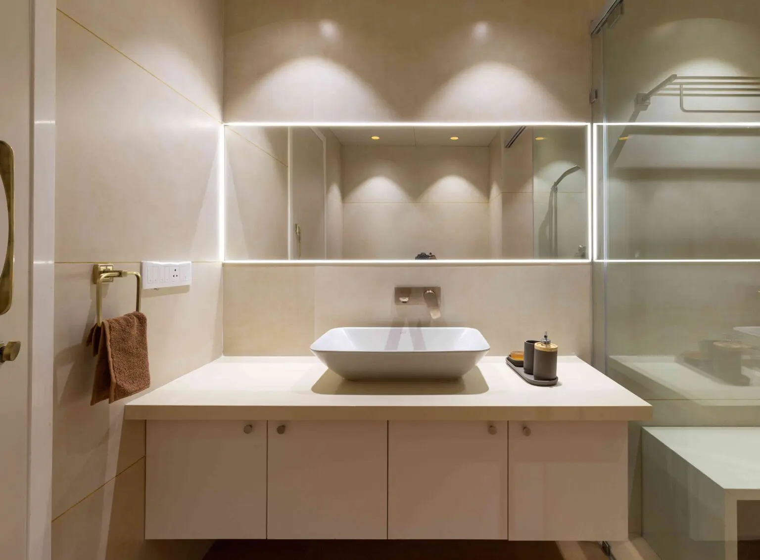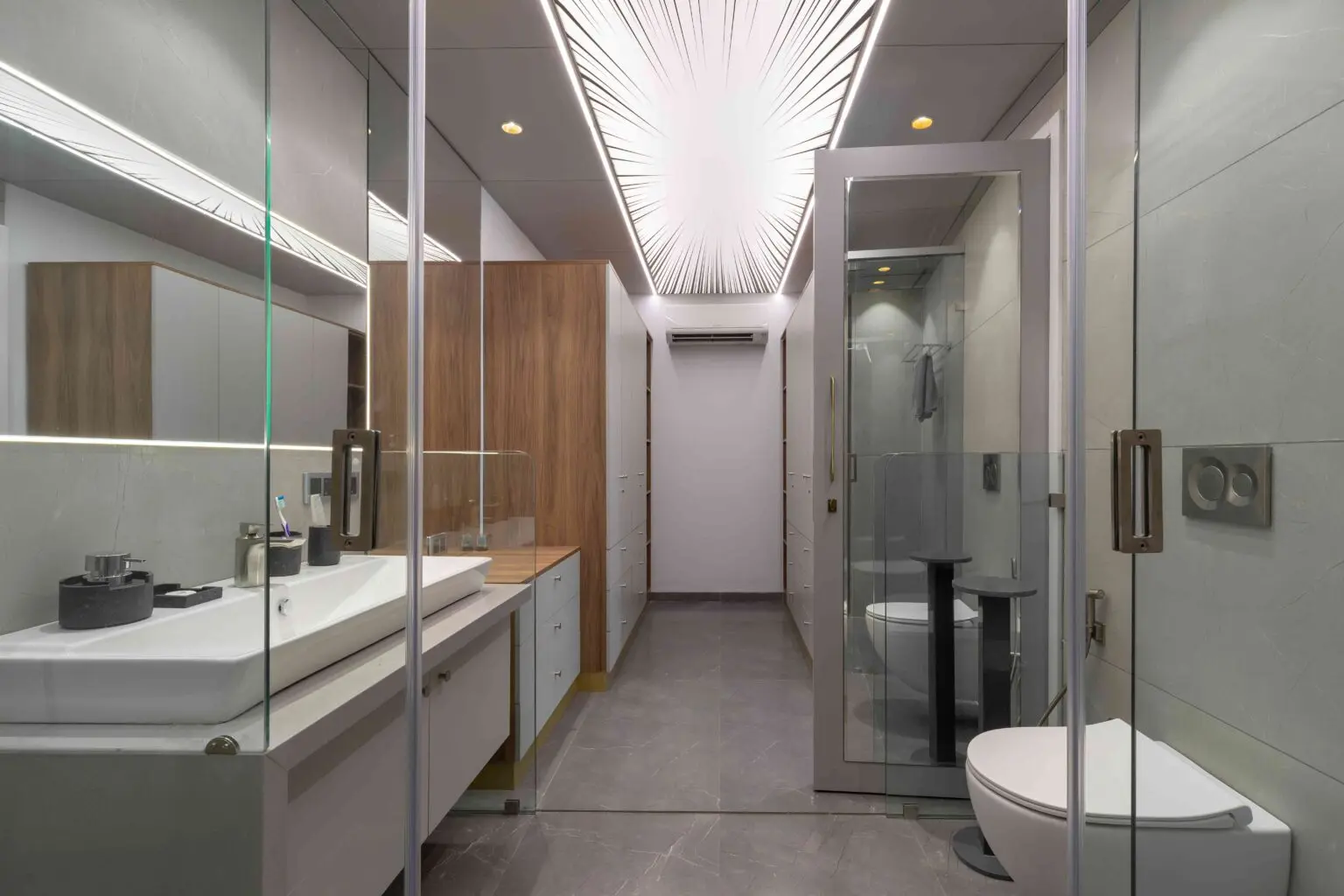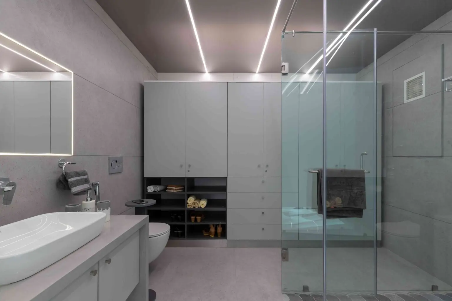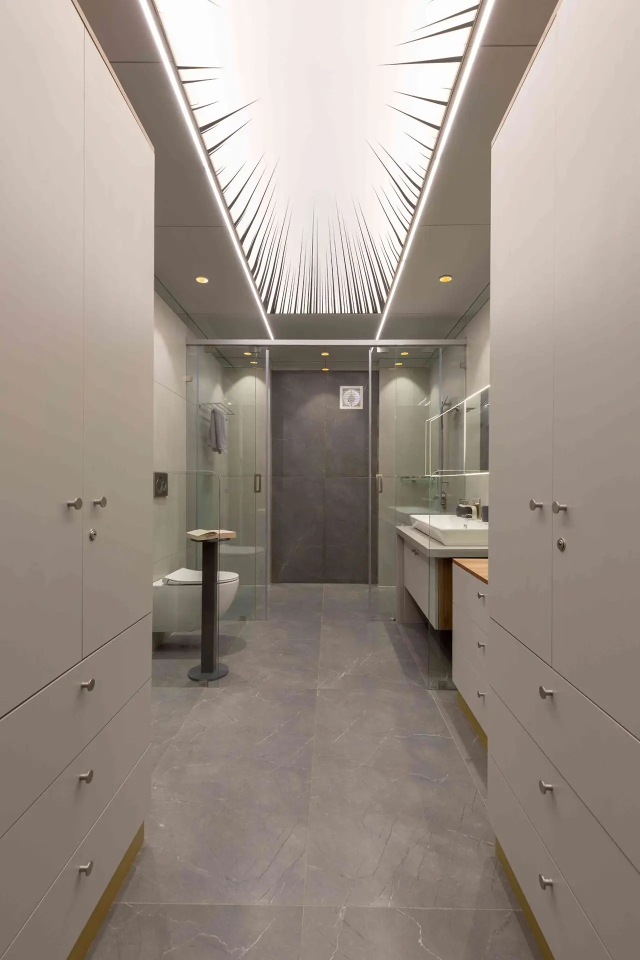 The Master Bath is kept linear with a stretch ceiling lighting up the whole bath and dressing with an open to sky feel.