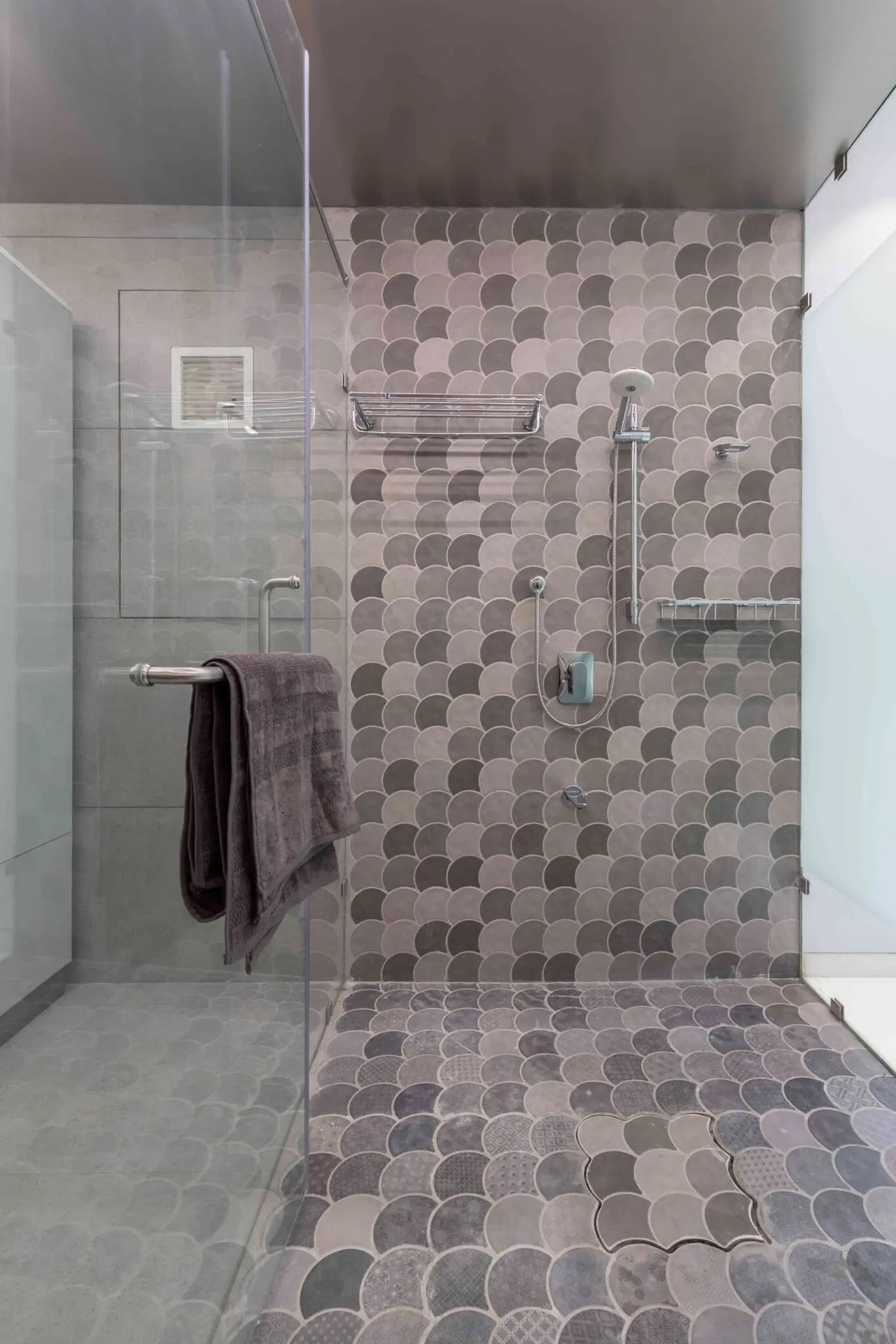 The Sons bath with the bold and intricate Moroccan tile is a bow to the Mediterranean style baths.