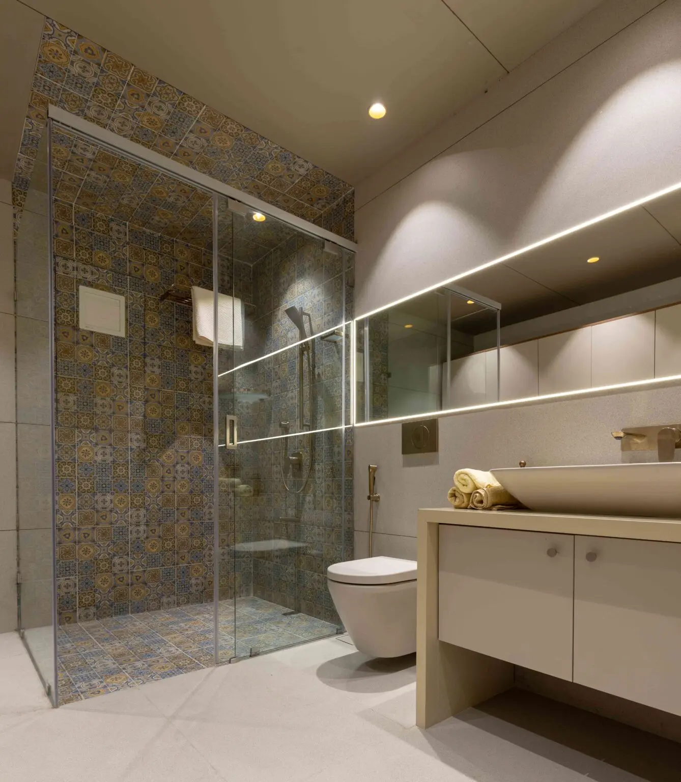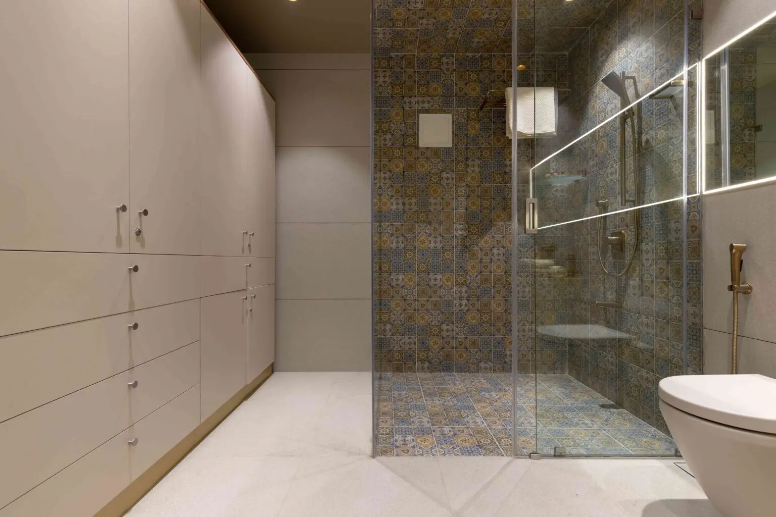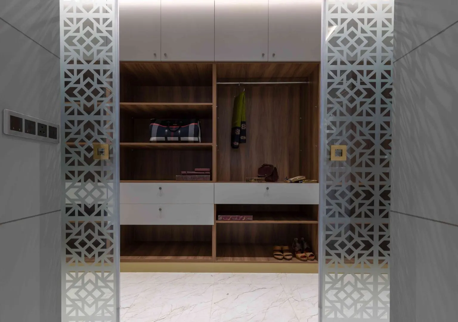 The Glass door has the same pattern as the Headboard jali giving it continuity and let’s light create intrinsic and beautiful patterns.