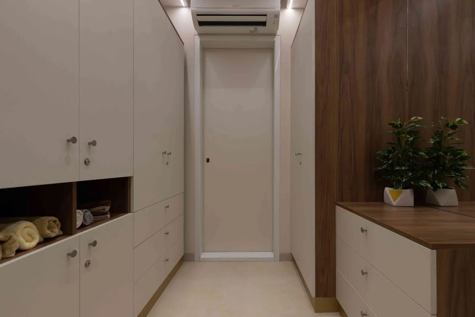 The Daughters room is designed with provisions to flaunt her luxurious collection of bags and extensive book collection hidden in a book cabinet camouflaged by the headboard.