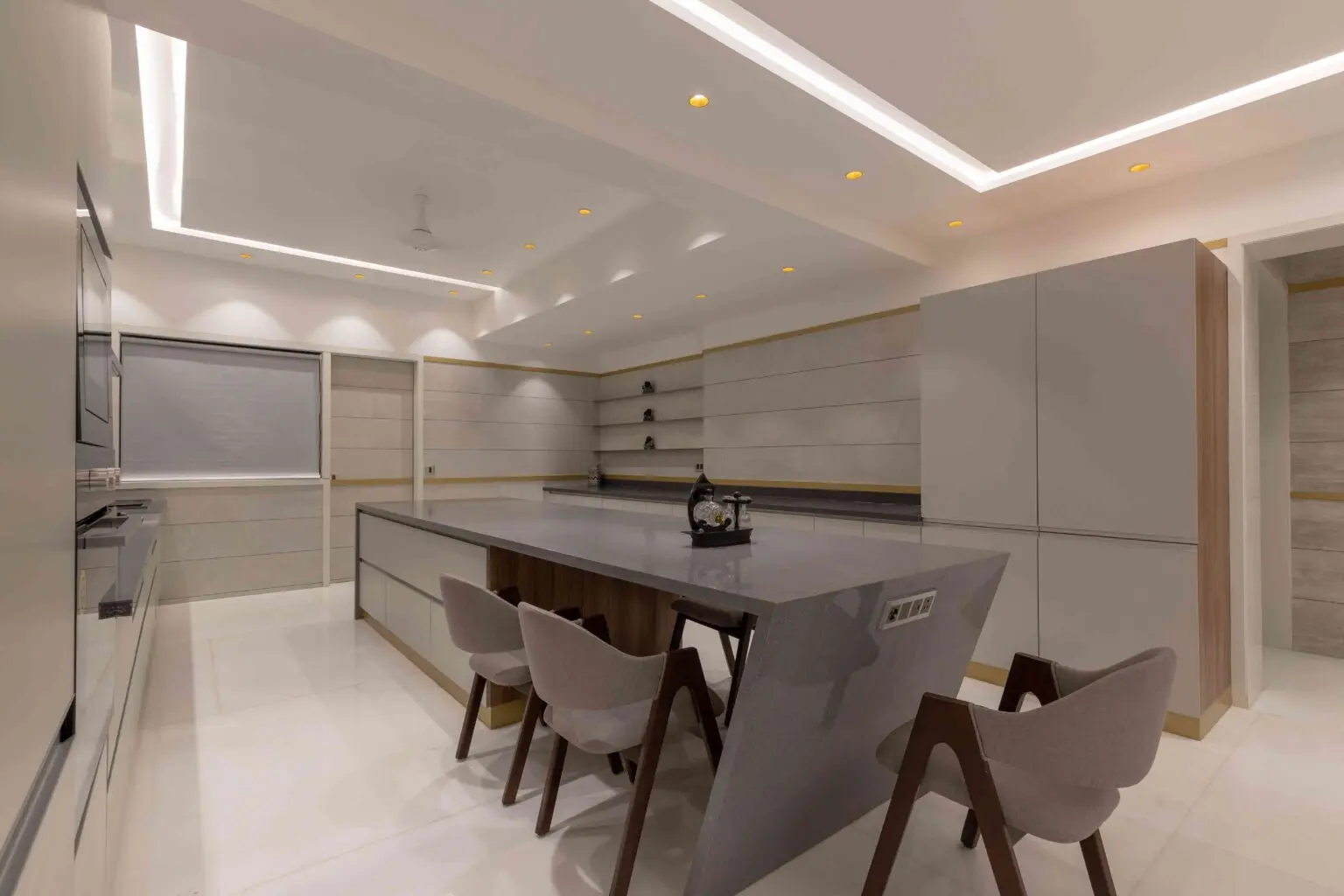 The stone island with its angular features talks of its continuity with the shades of grey laminates running from the dining bay all the way to the kitchen.