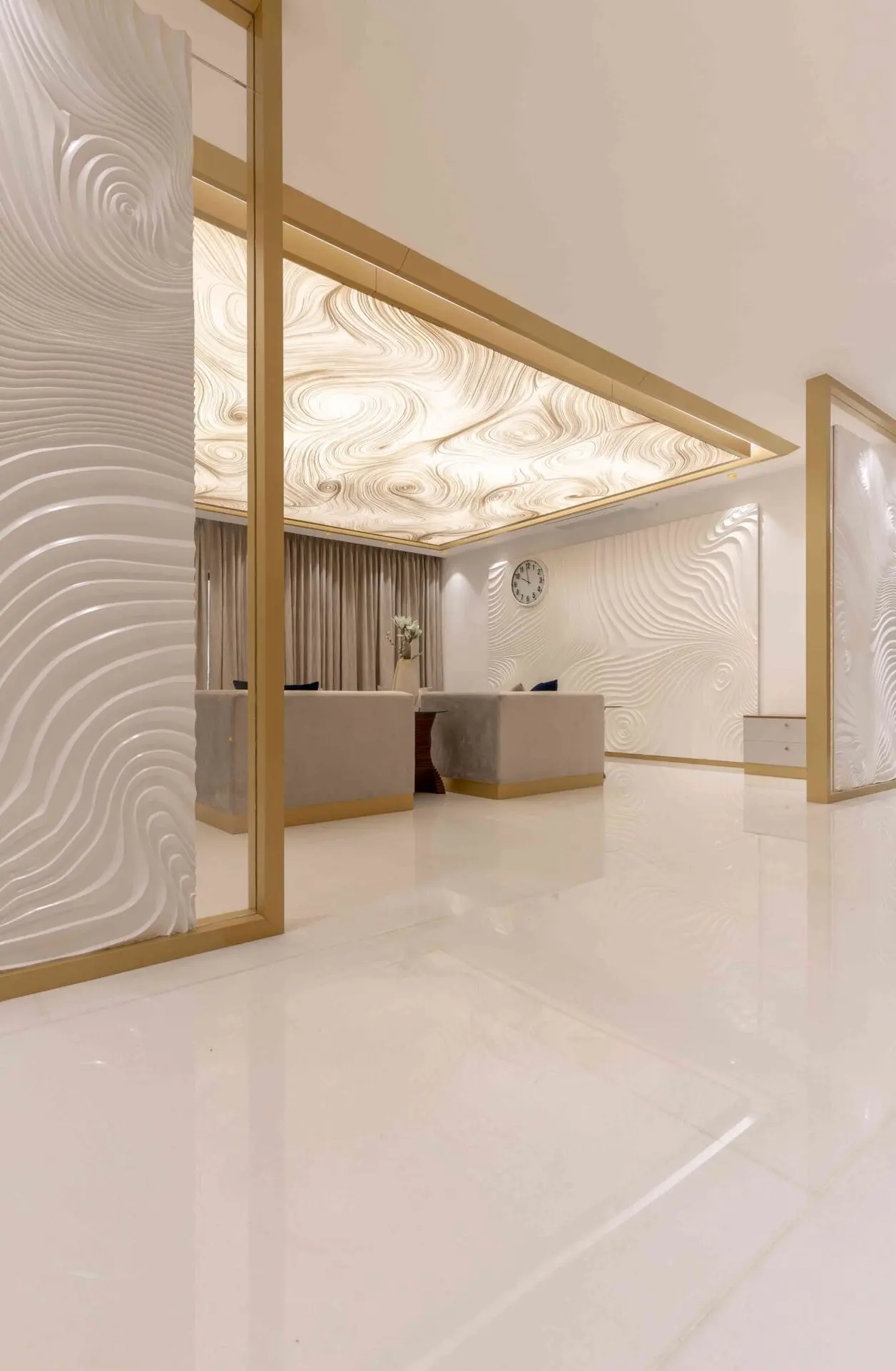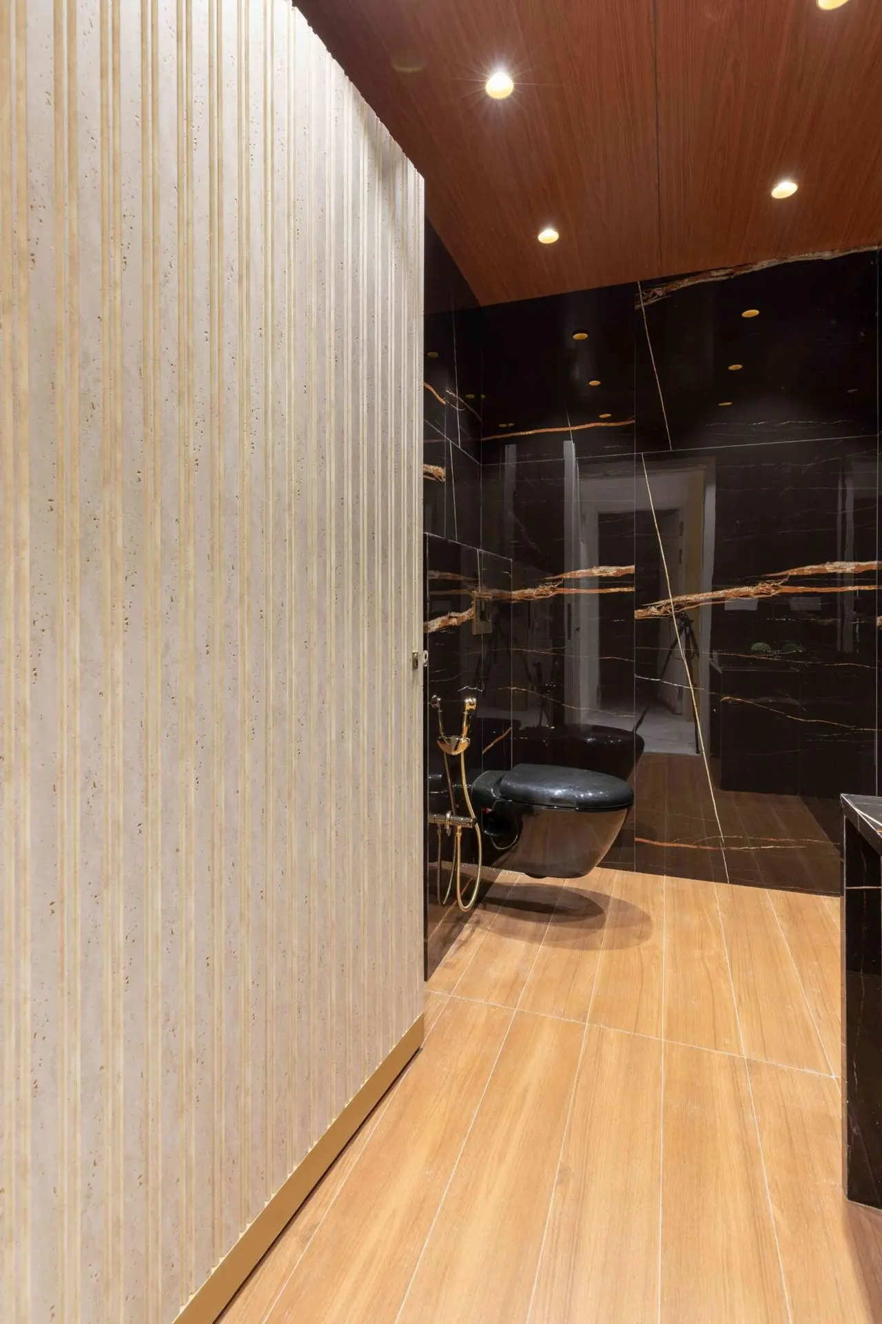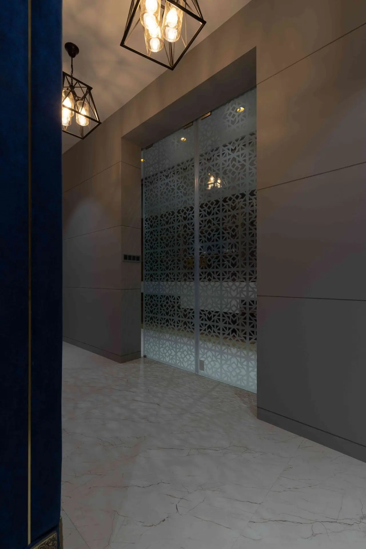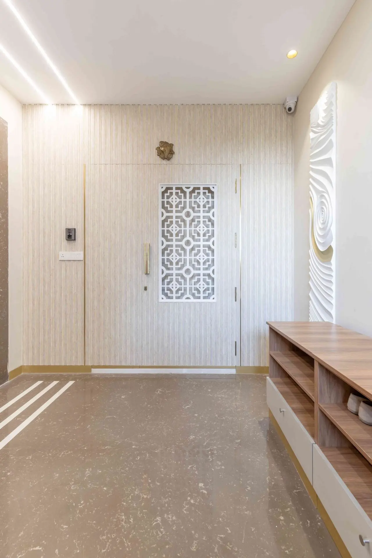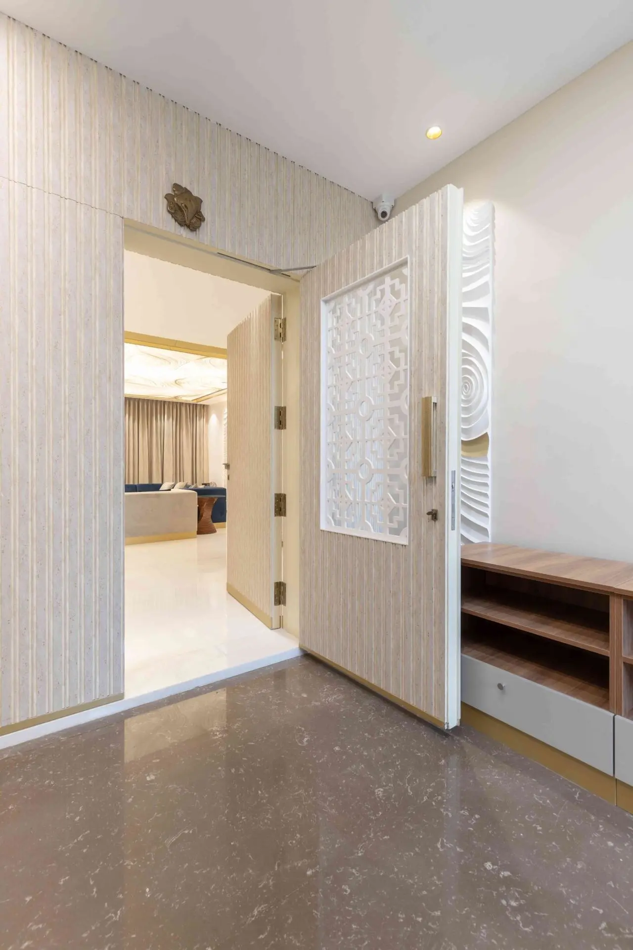 The entrance door itself speaks of its users affluent persona with a Charcoal Sheet paneling in cream and gold that terminates at the ceiling; with a Corian jali as a porthole.