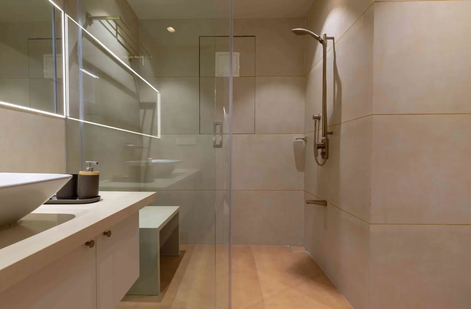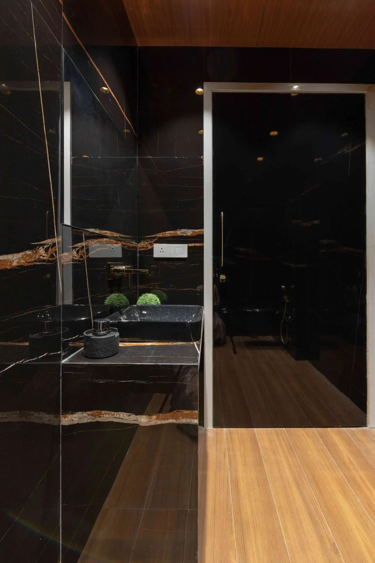 The common bathroom majorly uses black ceramic for the floor, niches, and walls.