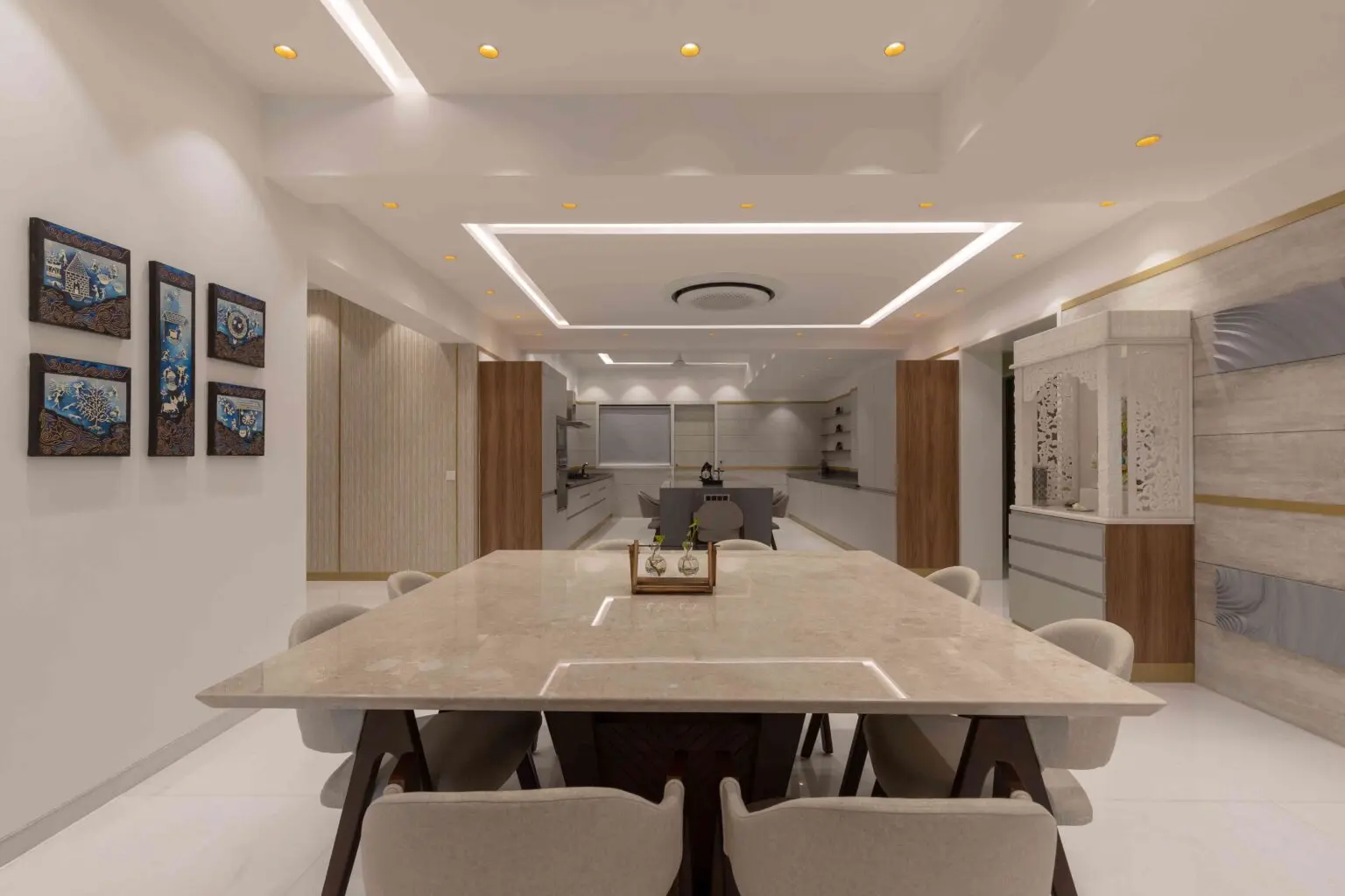 The two core spaces- the living and the dining is effectively demarcated with a peculiar design by using the two way TV unit.