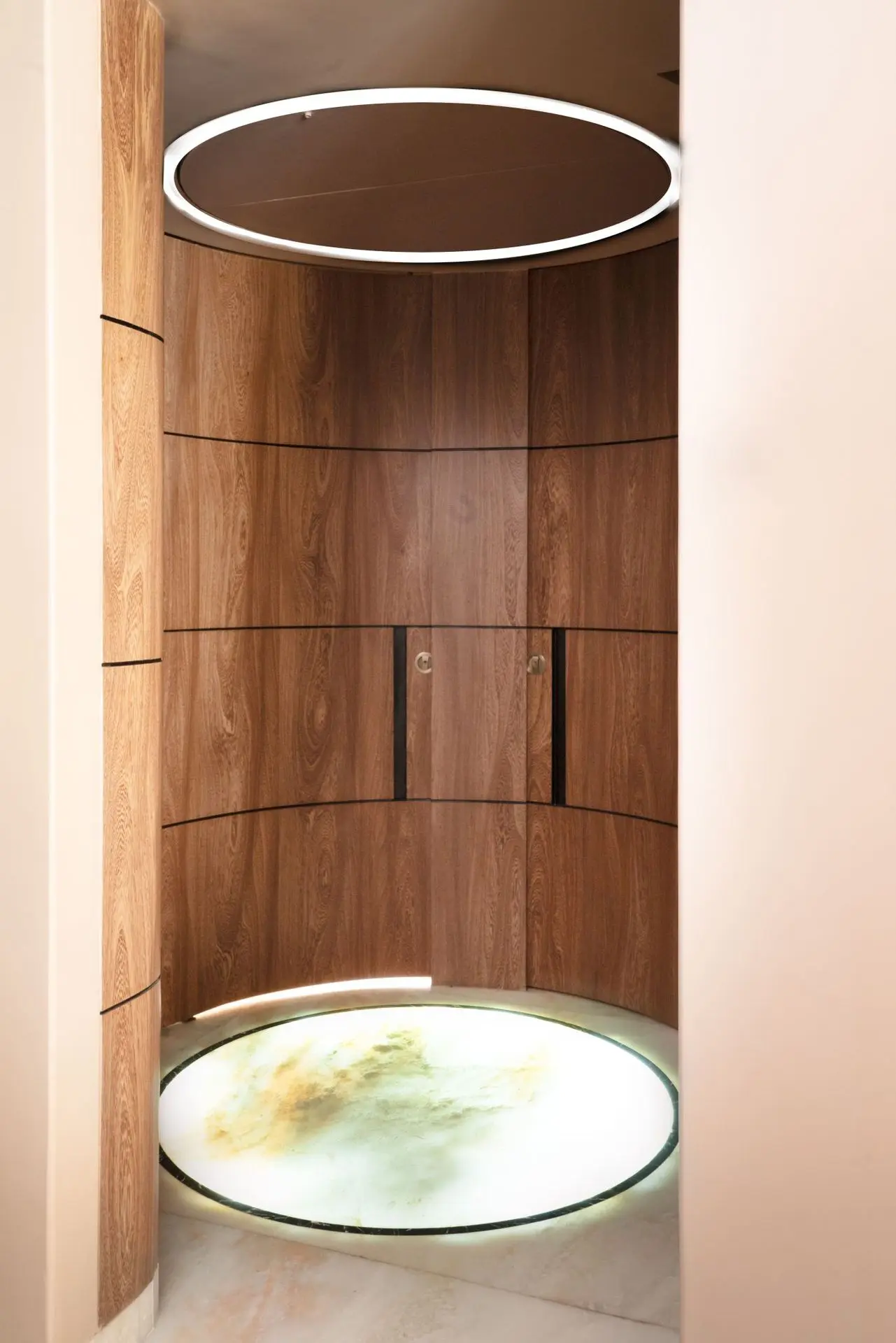 A sculpted circular niche wrapped in warm wood panels, accentuated by a halo of light above and a glowing onyx floor below. This tranquil pause point becomes an intimate moment of reflection, inspired by the spatial language of Roman chapels and sacred alcoves