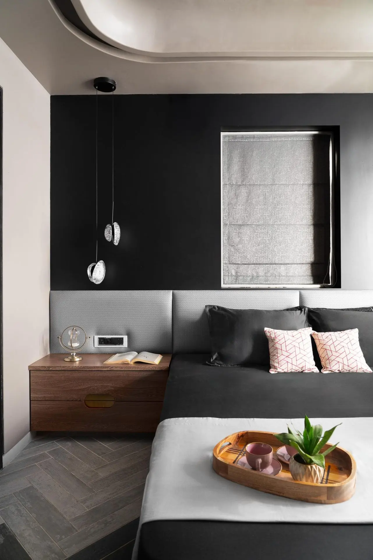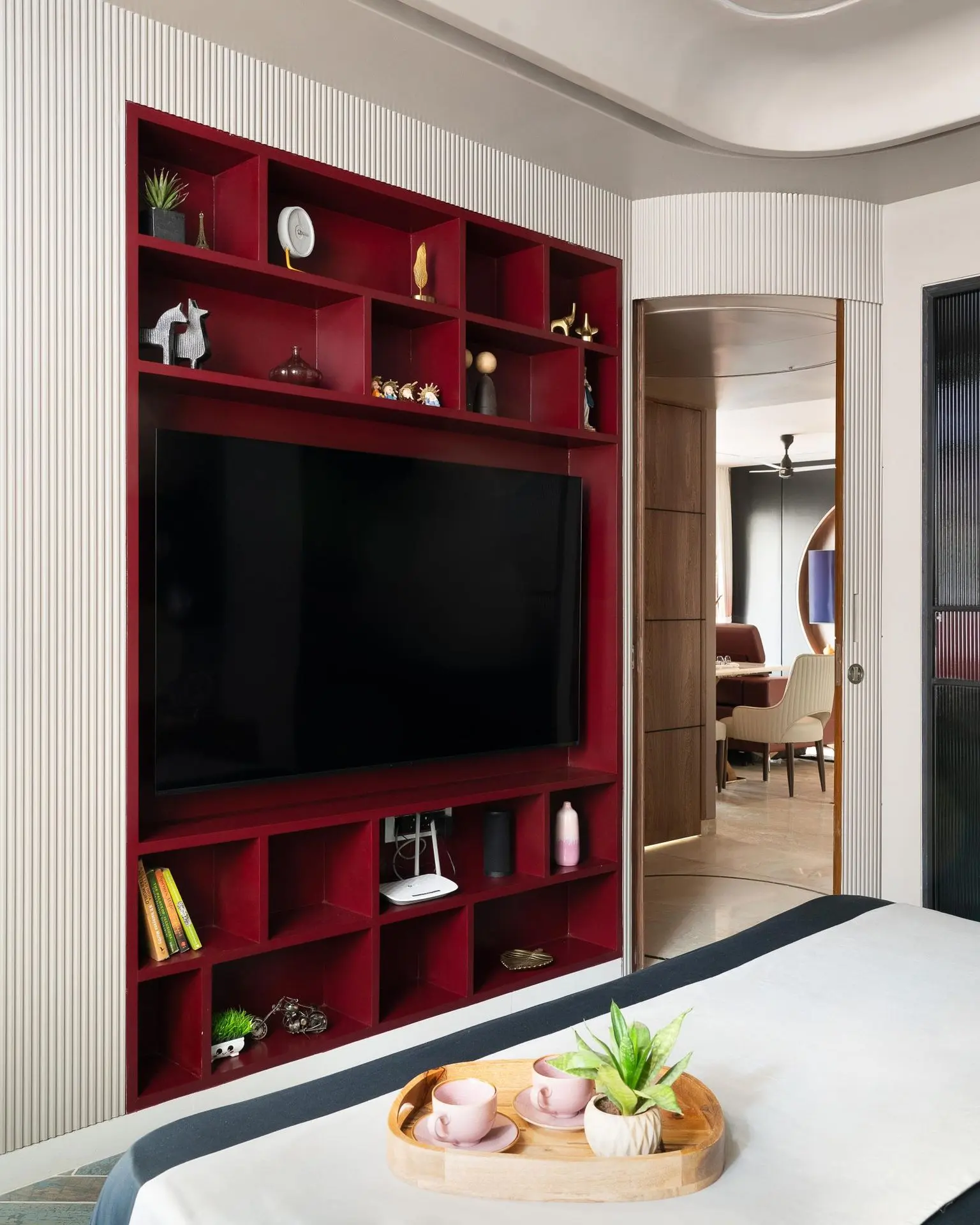 A bold, layered bedroom that balances deep tones with crisp geometry and playful pops of red an ode to maximalist calm.