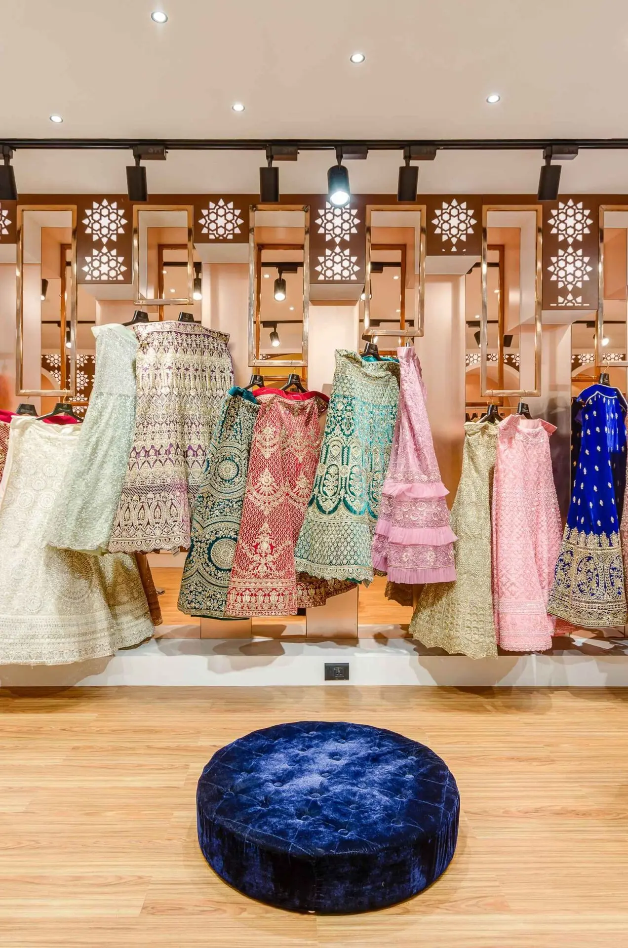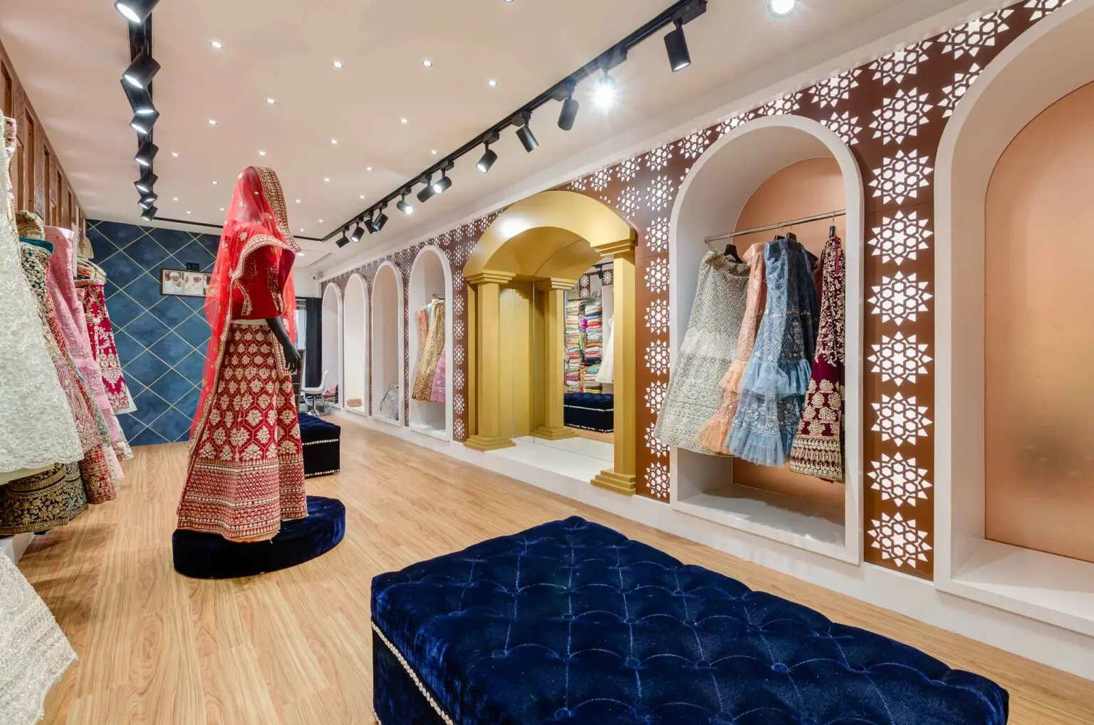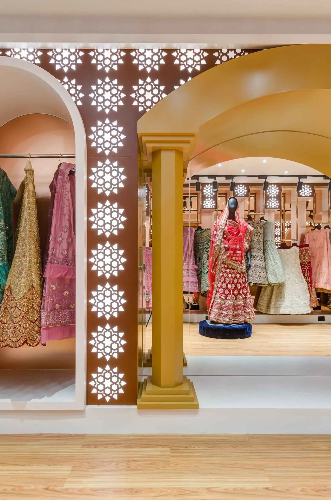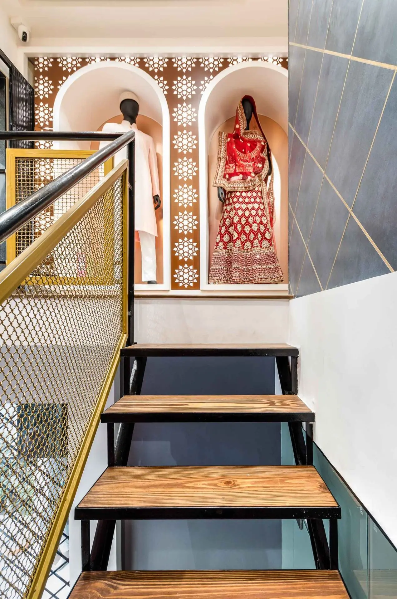 Feature of walls : As to match cultural ethic, two long linear walls of apartment been design with Arches and Jali, where arches can be used as a storage section and jail can be used to create ambience light for showroom, whereas on opposite wall, MS section was staggered into different heights in order to create display of bridal wear clothes which can stagger at different heights. Existing plumbing duct of apartment was being covered with linear wall. Further, same wall been design with arches and jail which became display wall for showroom.