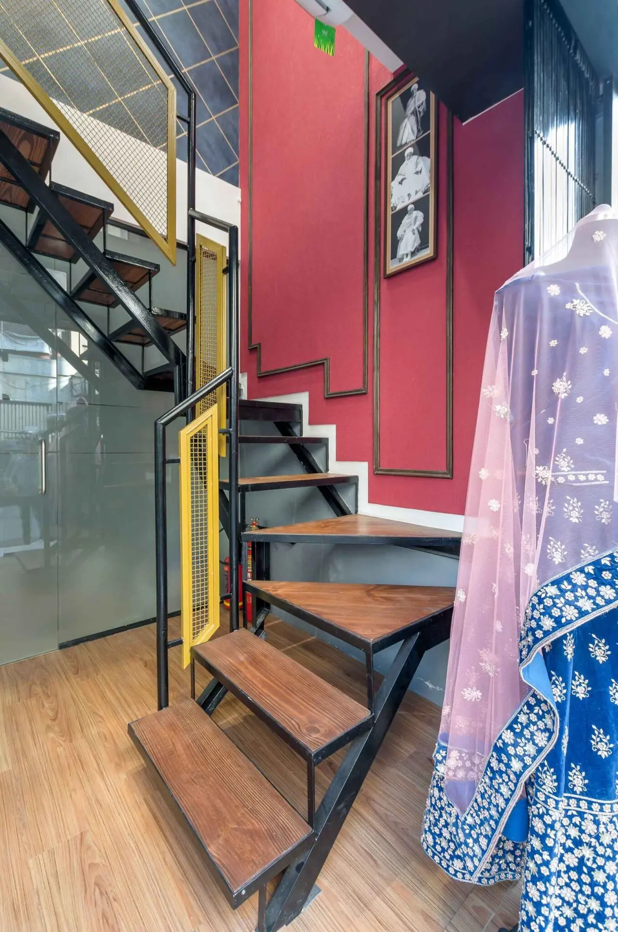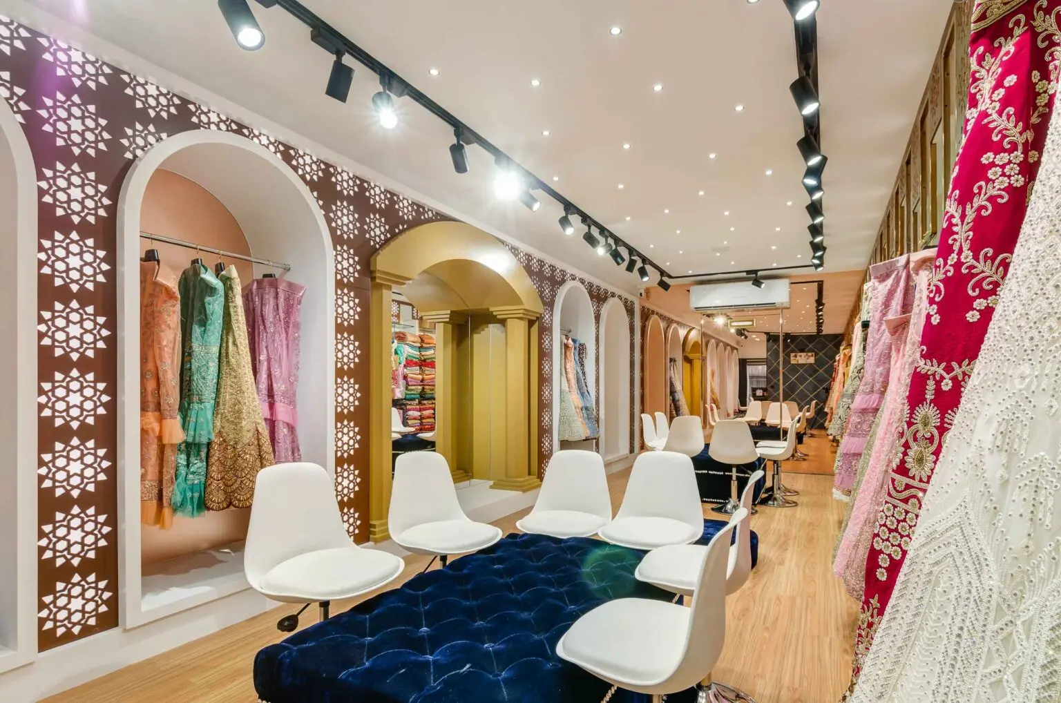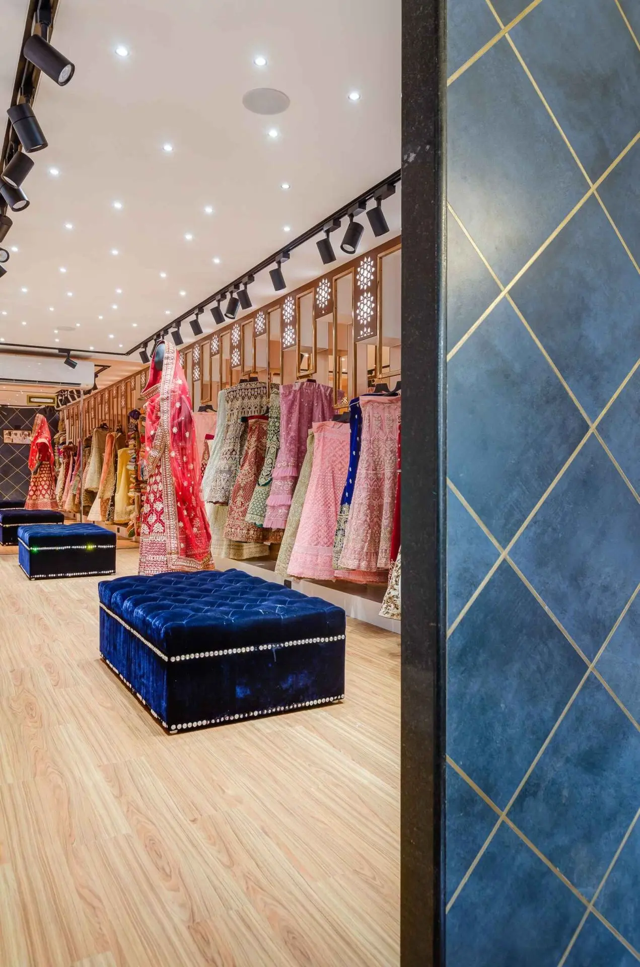 Feature of walls : As to match cultural ethic, two long linear walls of apartment been design with Arches and Jali, where arches can be used as a storage section and jail can be used to create ambience light for showroom, whereas on opposite wall, MS section was staggered into different heights in order to create display of bridal wear clothes which can stagger at different heights. Existing plumbing duct of apartment was being covered with linear wall. Further, same wall been design with arches and jail which became display wall for showroom.