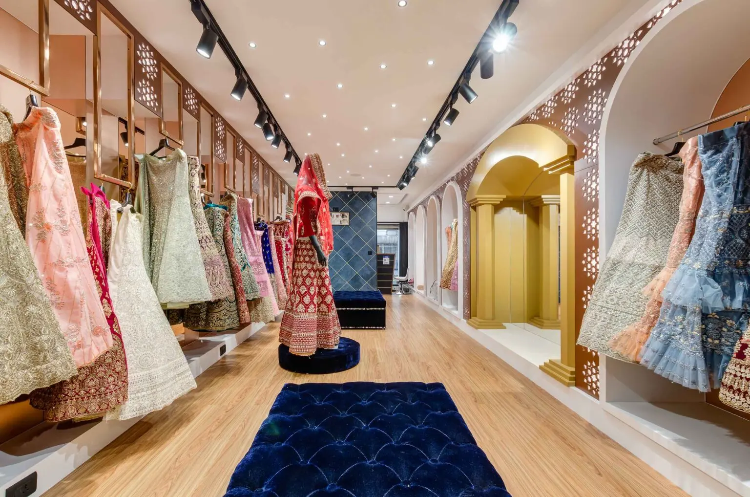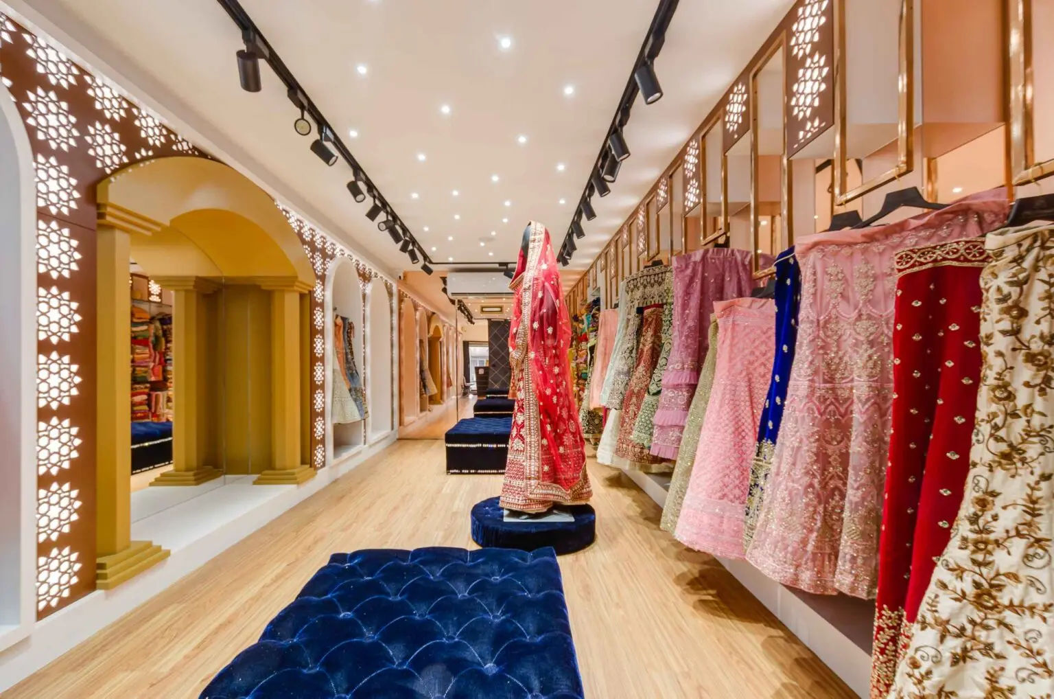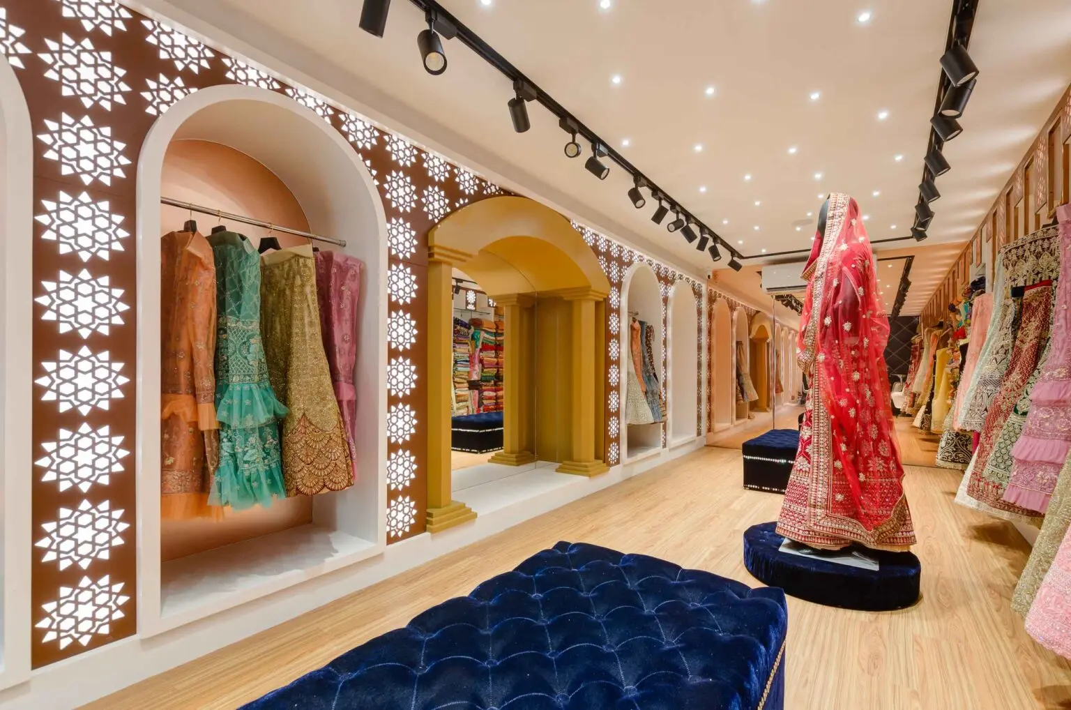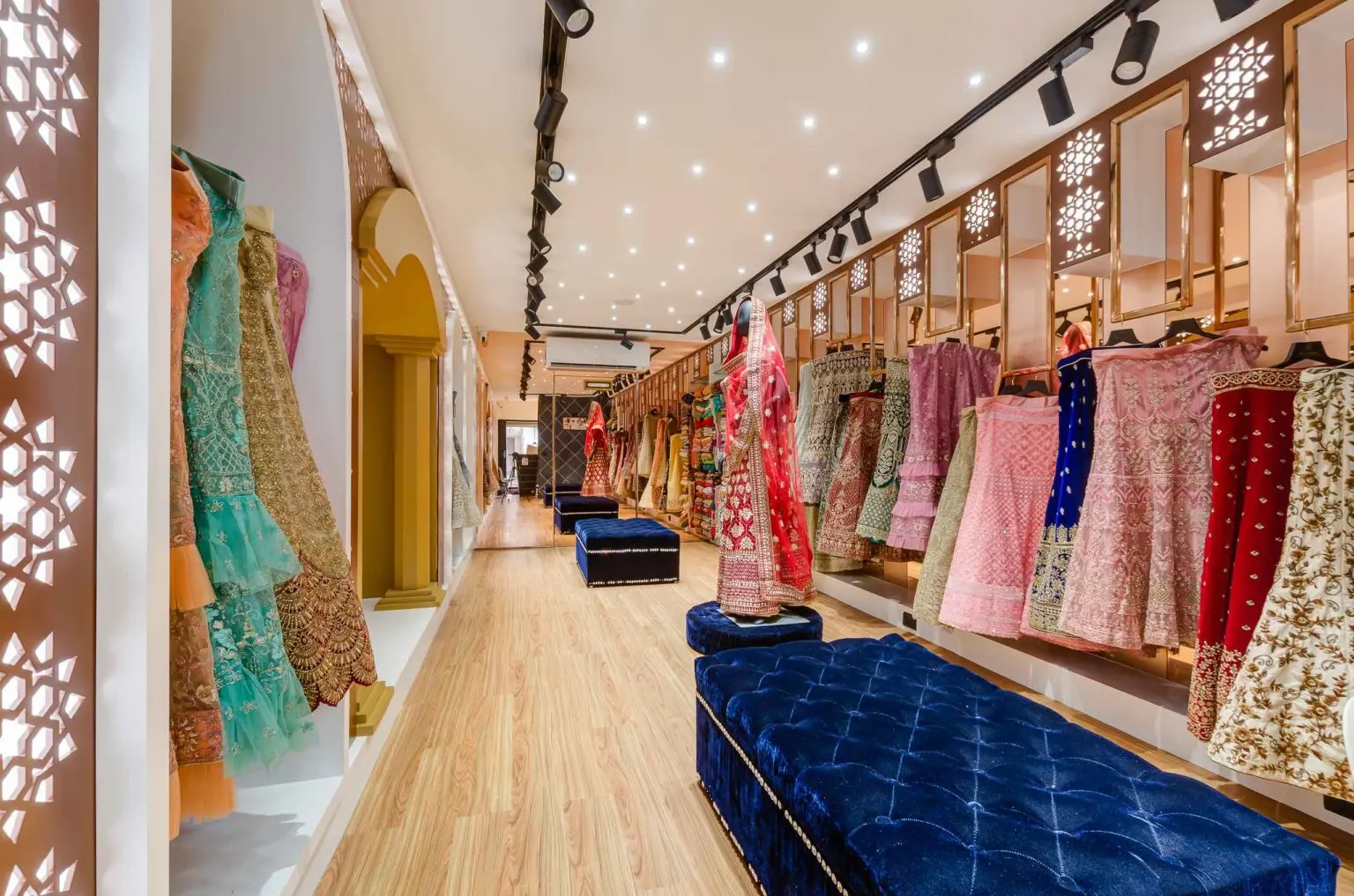 Feature of walls : As to match cultural ethic, two long linear walls of apartment been design with Arches and Jali, where arches can be used as a storage section and jail can be used to create ambience light for showroom, whereas on opposite wall, MS section was staggered into different heights in order to create display of bridal wear clothes which can stagger at different heights. Existing plumbing duct of apartment was being covered with linear wall. Further, same wall been design with arches and jail which became display wall for showroom.