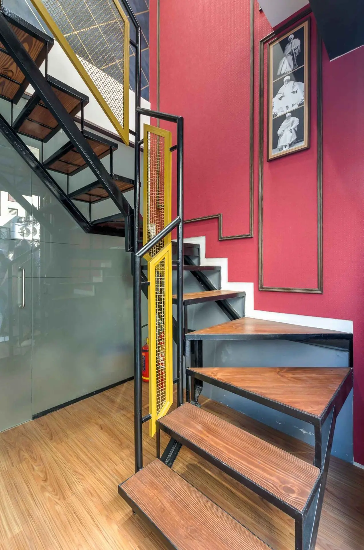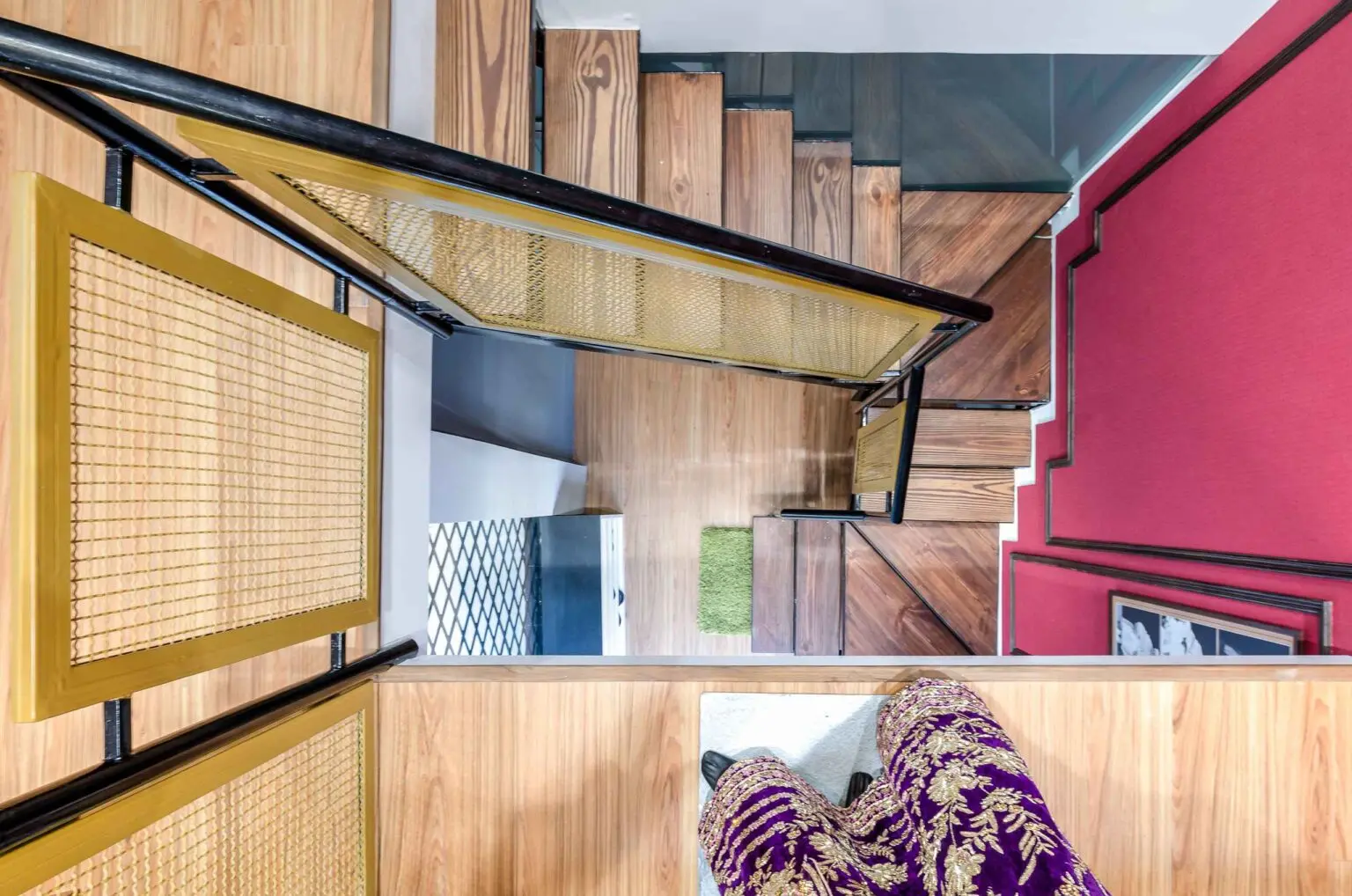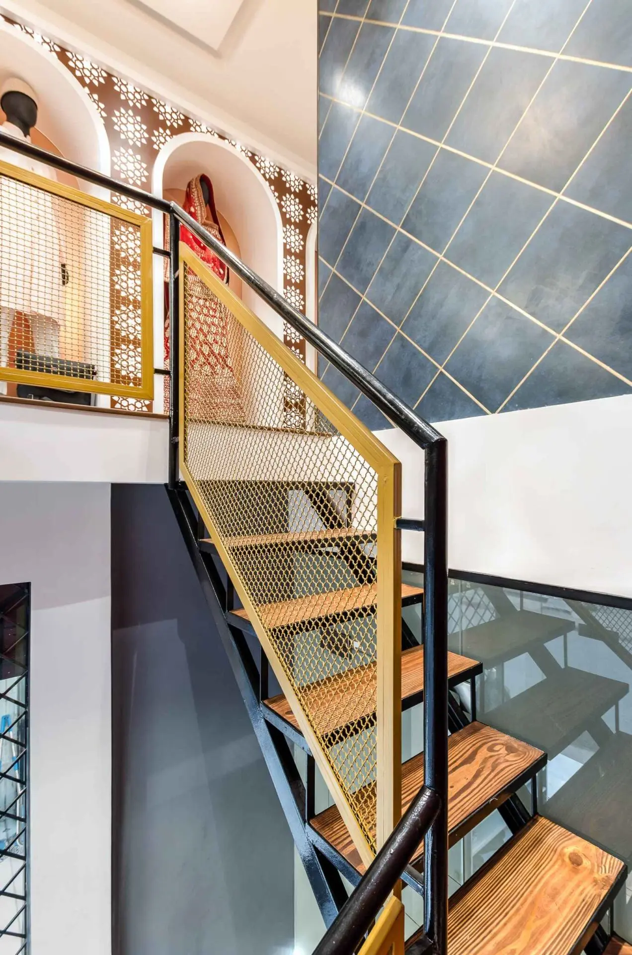 Further, Shape of staircase creates its elegance and nice aroma in Entrance. Wall attached with staircase has been balanced with red textured color wall paper on double height volume, whereas Traditional jali been used as a stair railing with subtle gold color along with strong black MS bar.