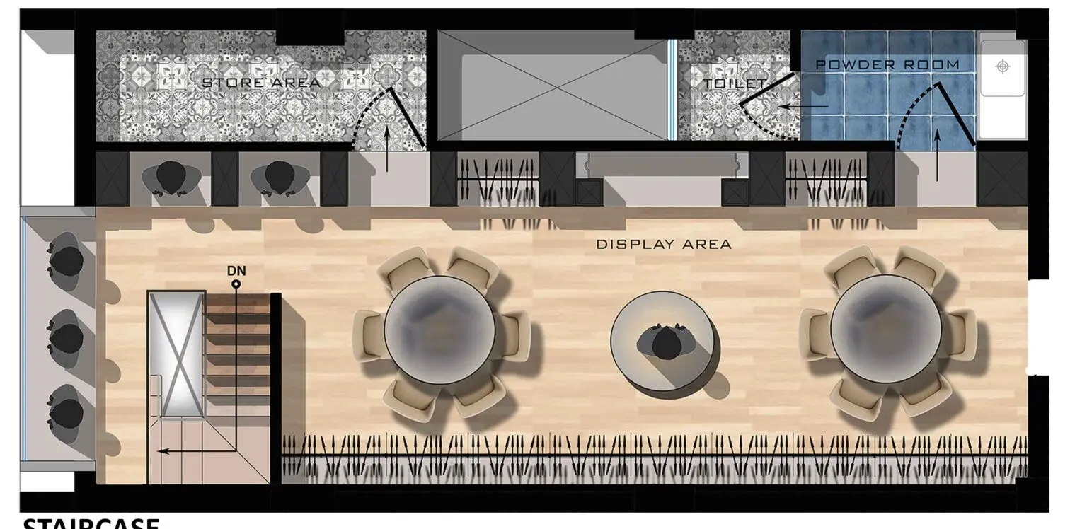 As an showroom, it is ideally important to have a good access from main road, thereby, we created and cut-out from first floor to ground floor in-order to create nice staircase.