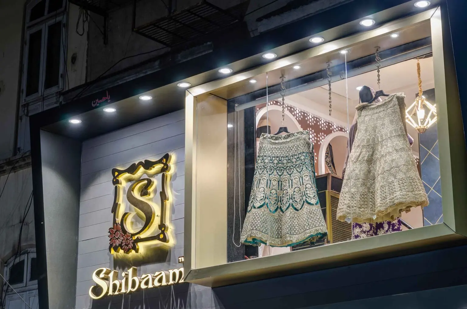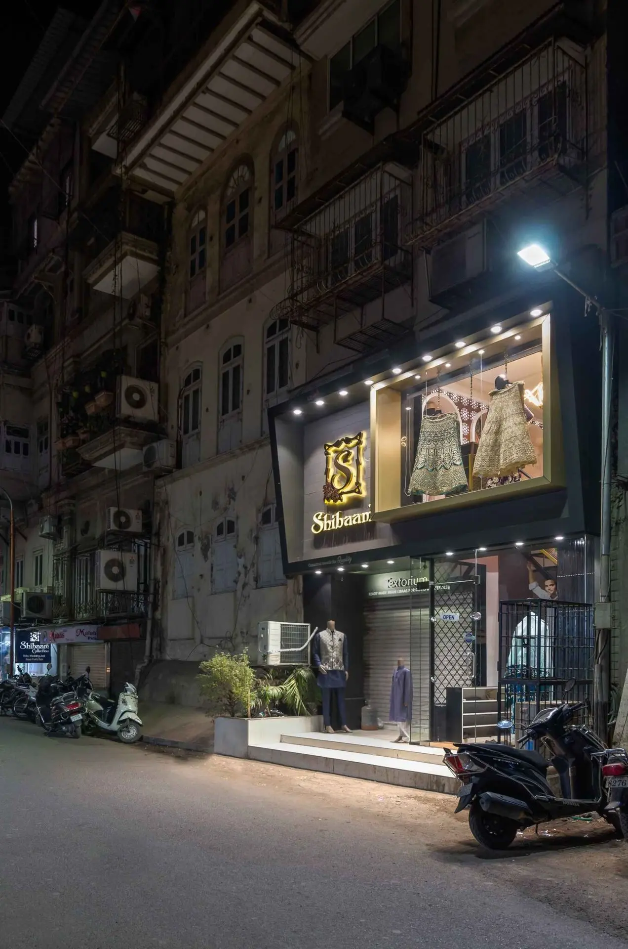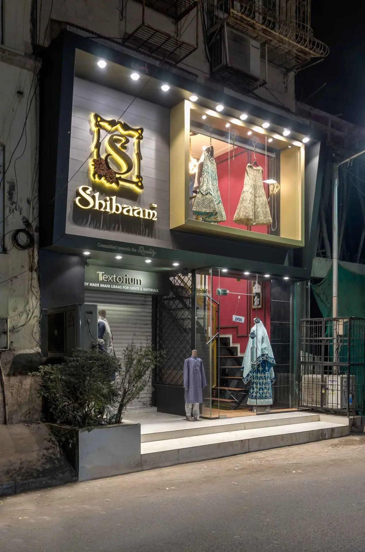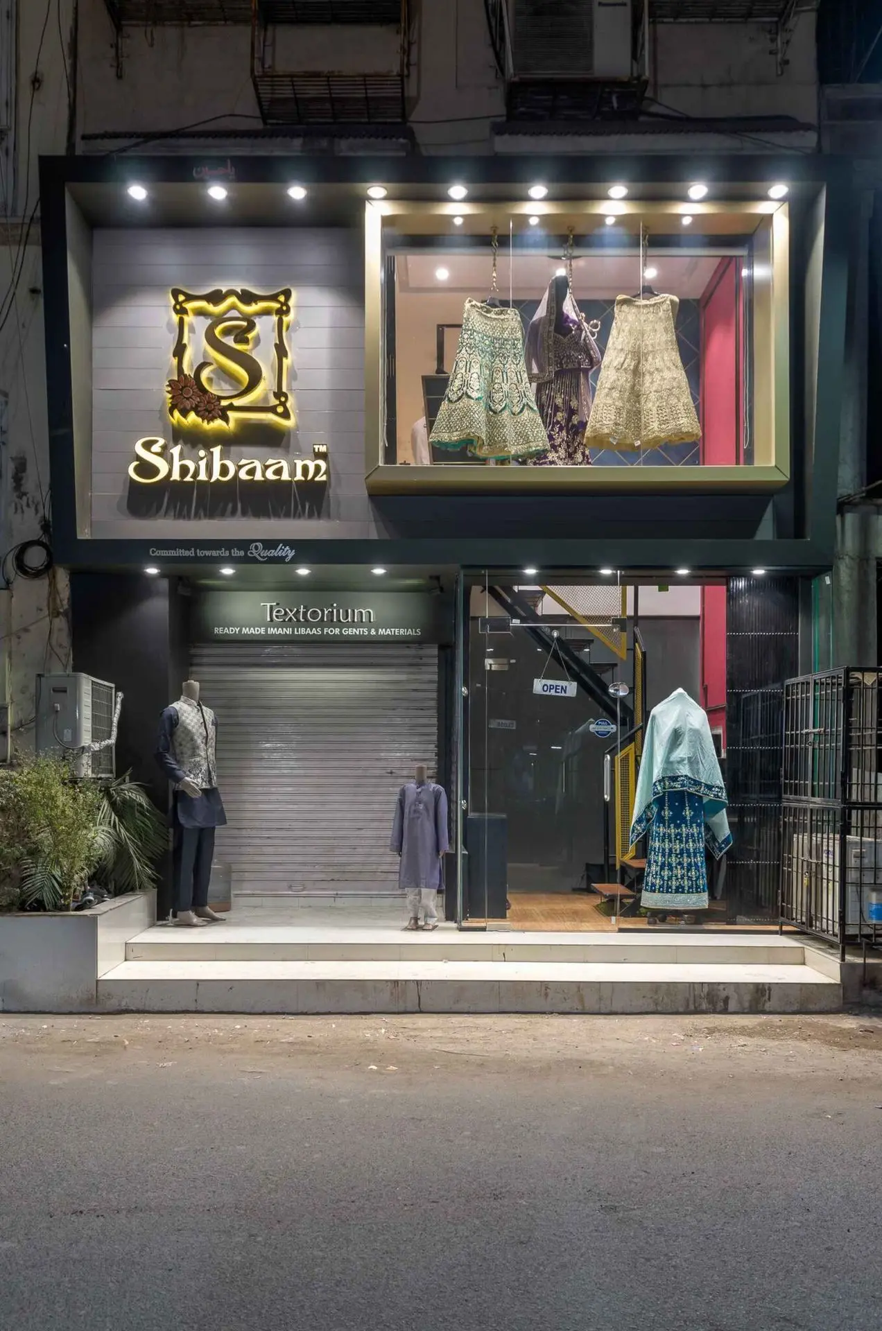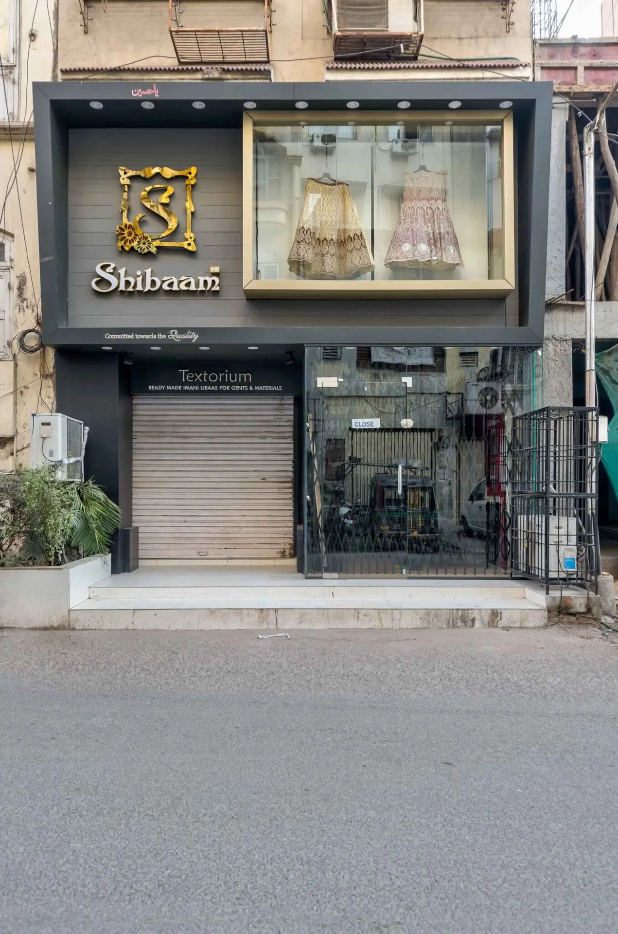 ‘Shibaam Collection’ is an 25 year old bridal-wear outlook specially design for ‘Vohra Community’ and very prominent brand since last 25 years. Demand from client, was to seek modern-ethical showroom(modern look with all old ethics to be sustained and retained for and new showroom which reflects it old tradition) ‘Looking to context of old street, we decided for contemporary modern look to inherent in elevation of old facade of residential which in-turn breaks the monotony of traditional outlook of old buildings, comes out to an option eye-catching element of street. Features of Elevation Facade box : Design carried with Two solid box from which One box emerges out from the other box.