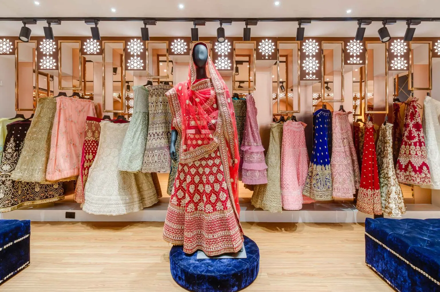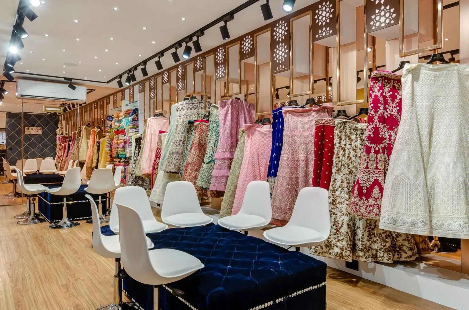 Further, a centrally located space been utilized for Bridal-Stand in order to create a space for bridal-stand on which bridal can display herself in mirror. Full long mirror been used on East side wall which helps to create a depth of showroom to feel of double size and also give sense of positive feel as an entrance in showroom.