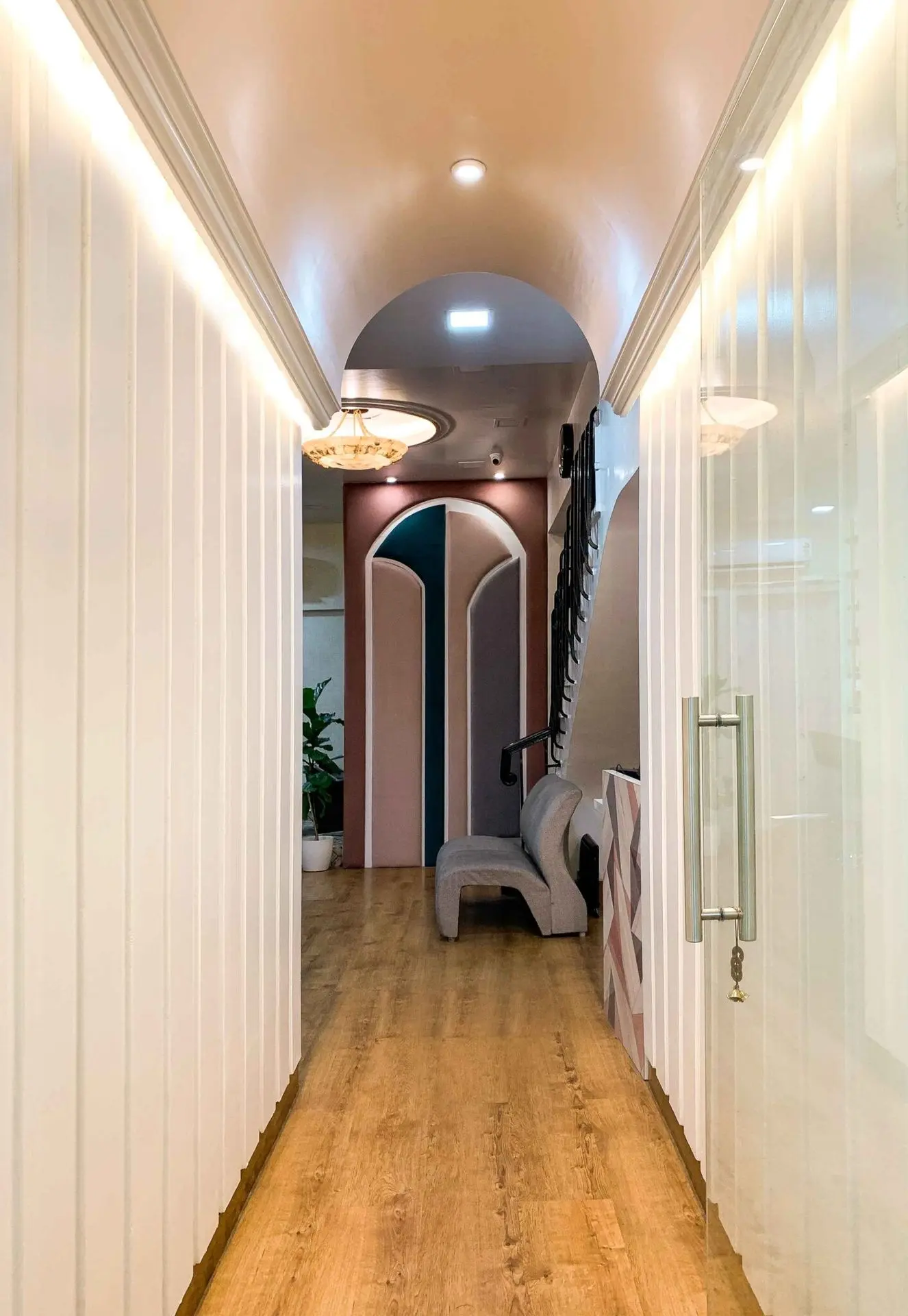 Our attempt was to direct the vision of the user to the focal point i.e the feature partition and therefore the other elements of the entrance like the vertical paneling and the faux vault was made with whites and pastels.