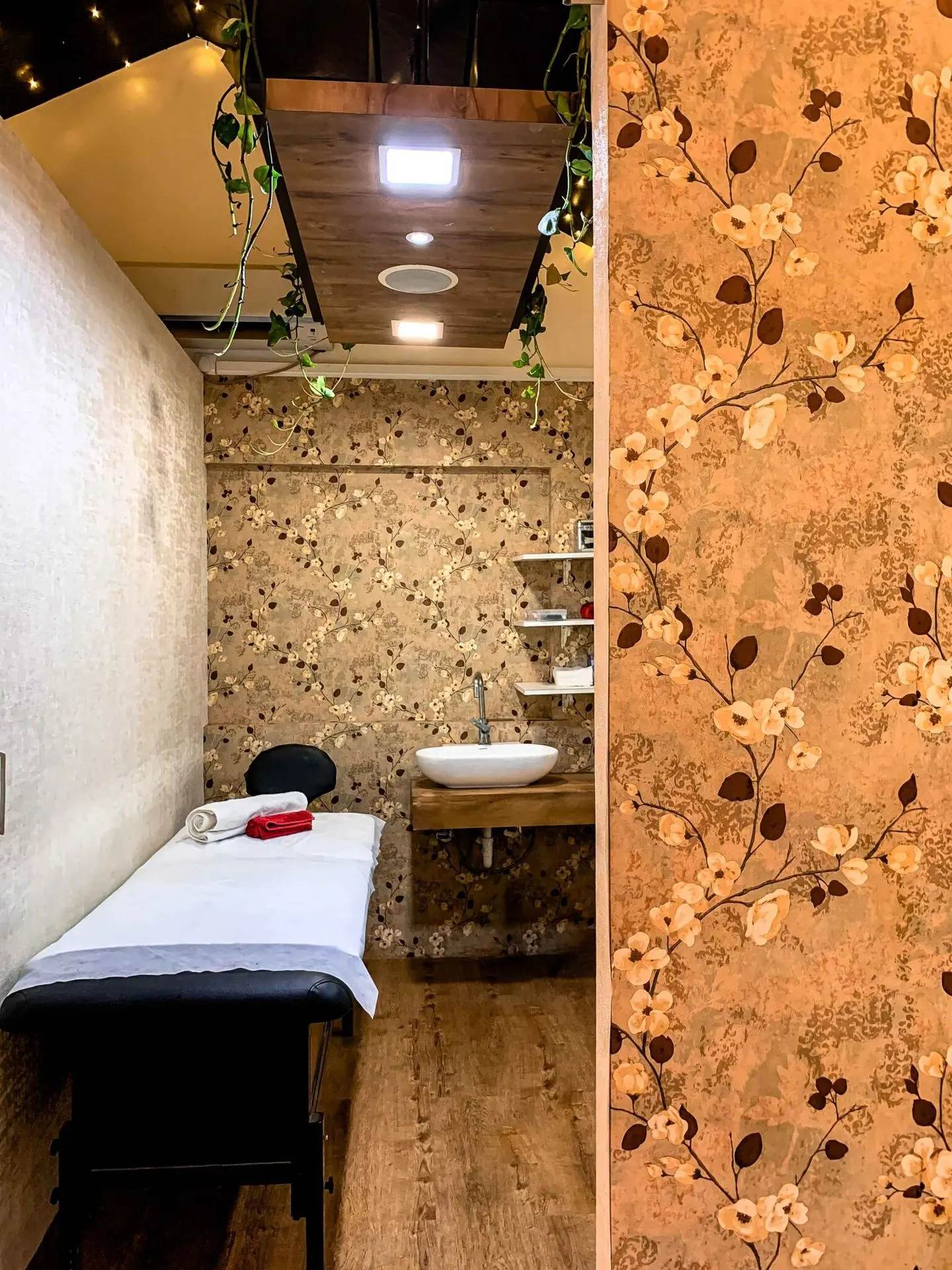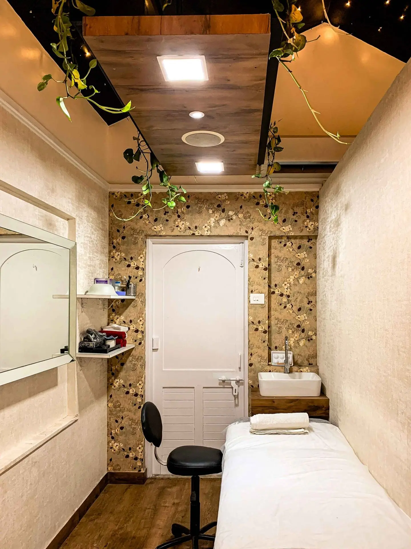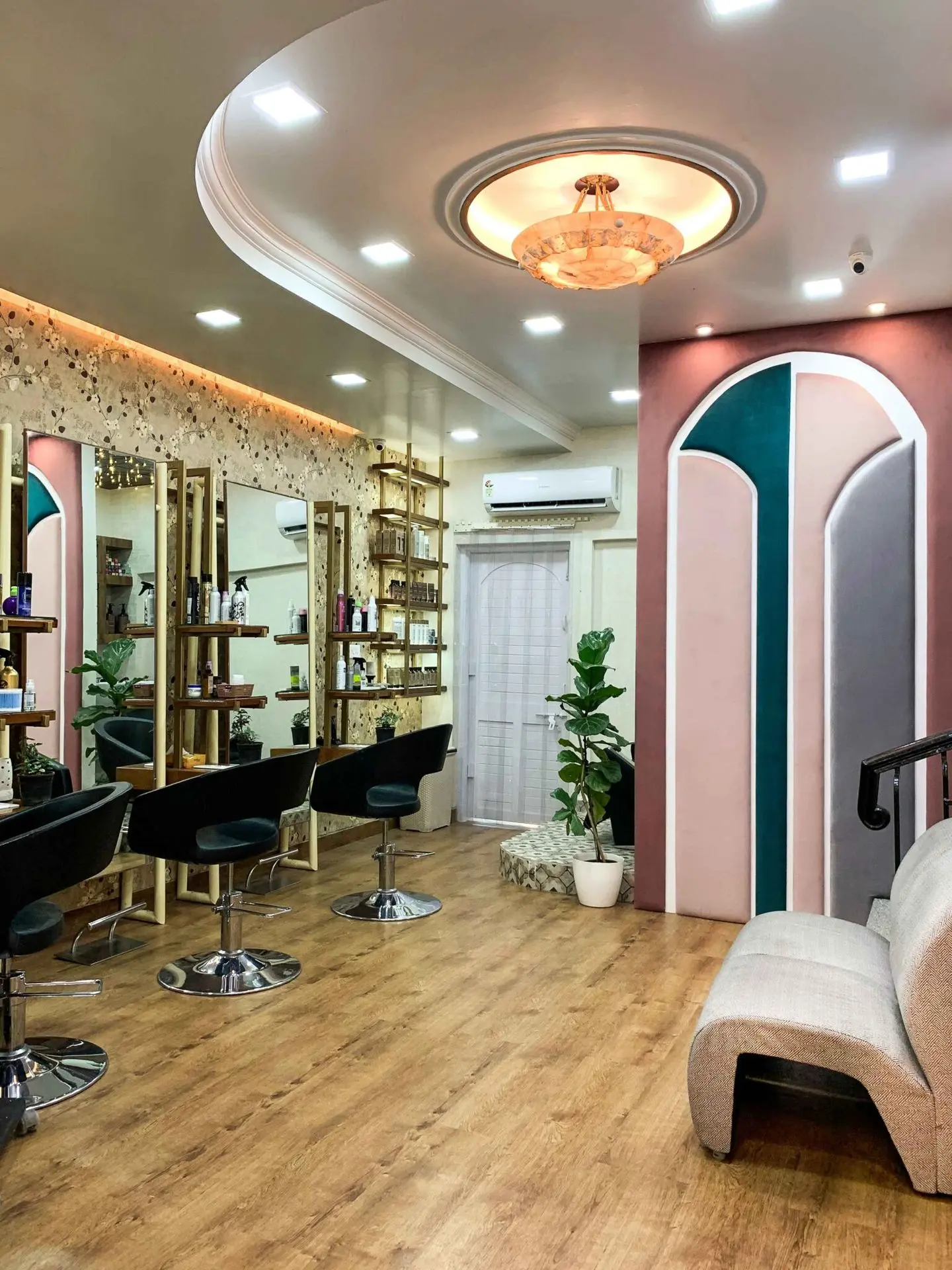 The interiors are designed with uniformity in terms of the finishes throughout the salon/spa with the use of florals and textures in the form of wallpapers for wall finishes , intricate cornices, wooden textured vinyl flooring and a highlight of metallic chrome gold finish giving it a contemporary style with a little vintage touch.