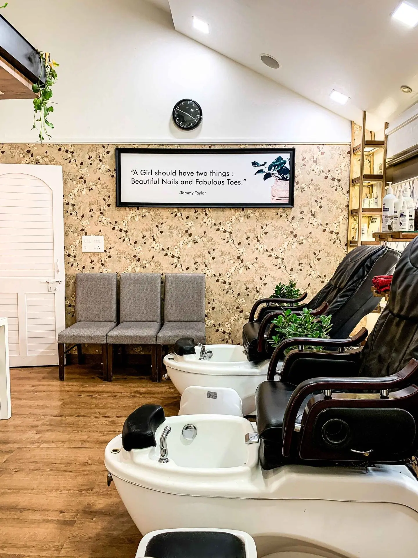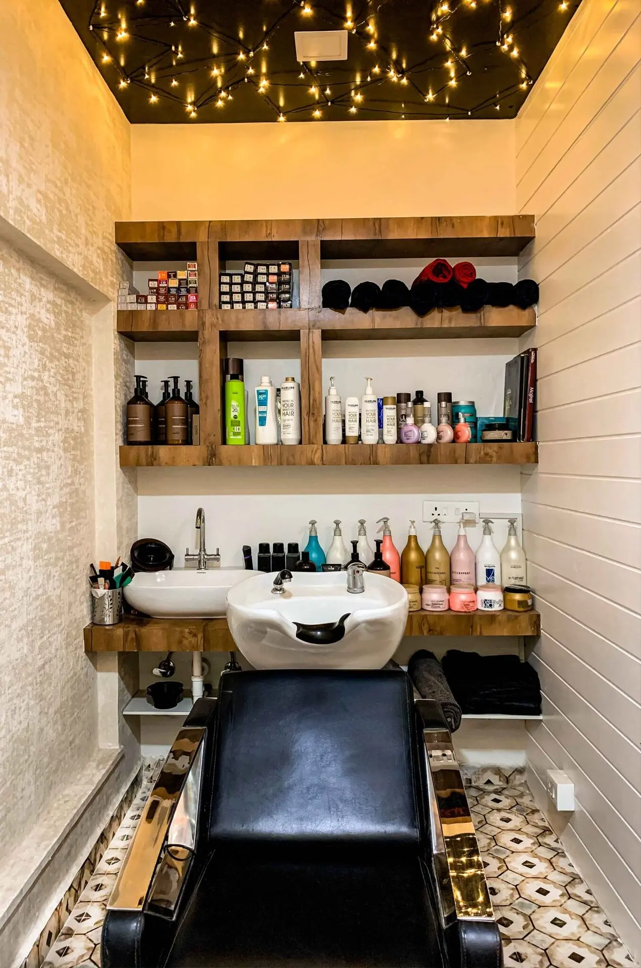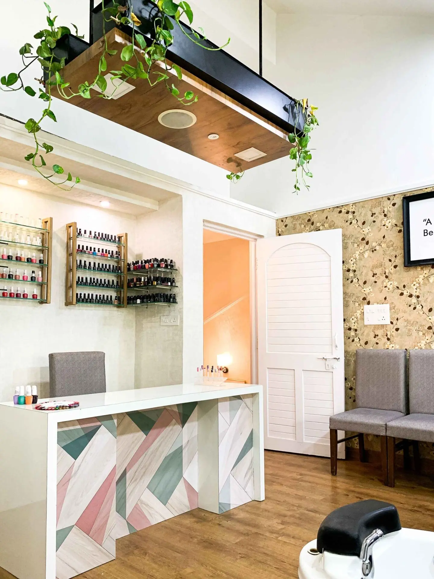 The manicure table is designed using designer laminate with iconic patterns of the color palette lit by task lights of the hanging basket with plants , thus effectively optimizing the luminance of the room with high ceiling.