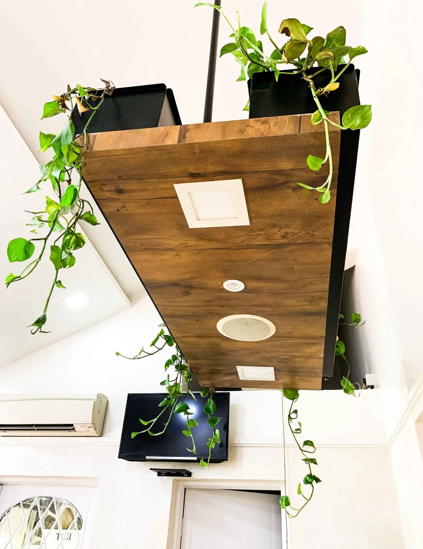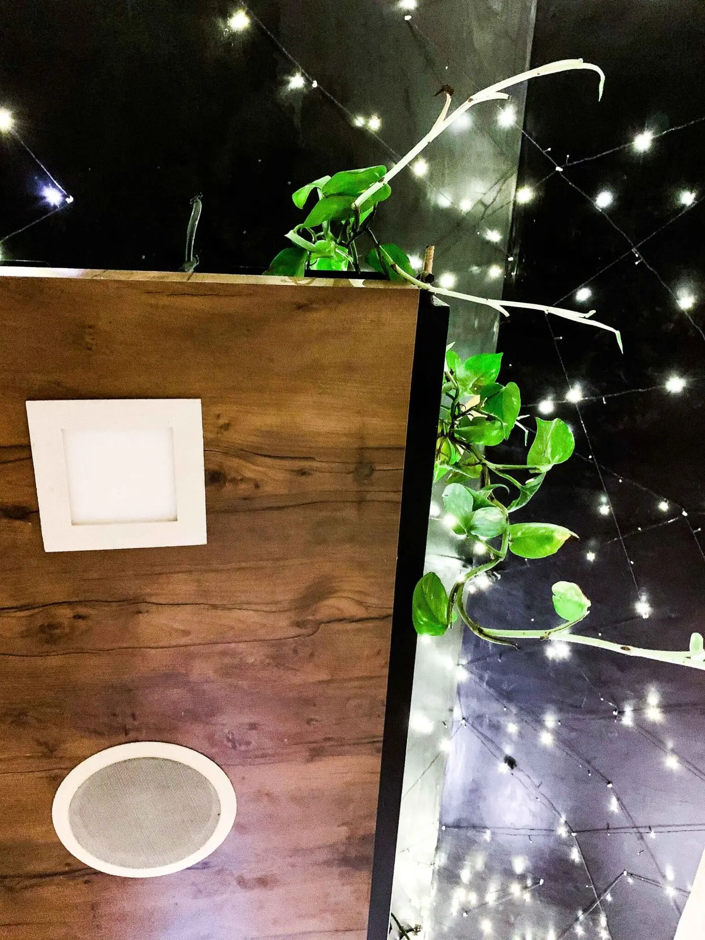 The sloping roof is painted black with fairy lights as stars and the hanging basket tray nestles live plants, designed with a combination of matte black metal and wooden texture with spot lights .